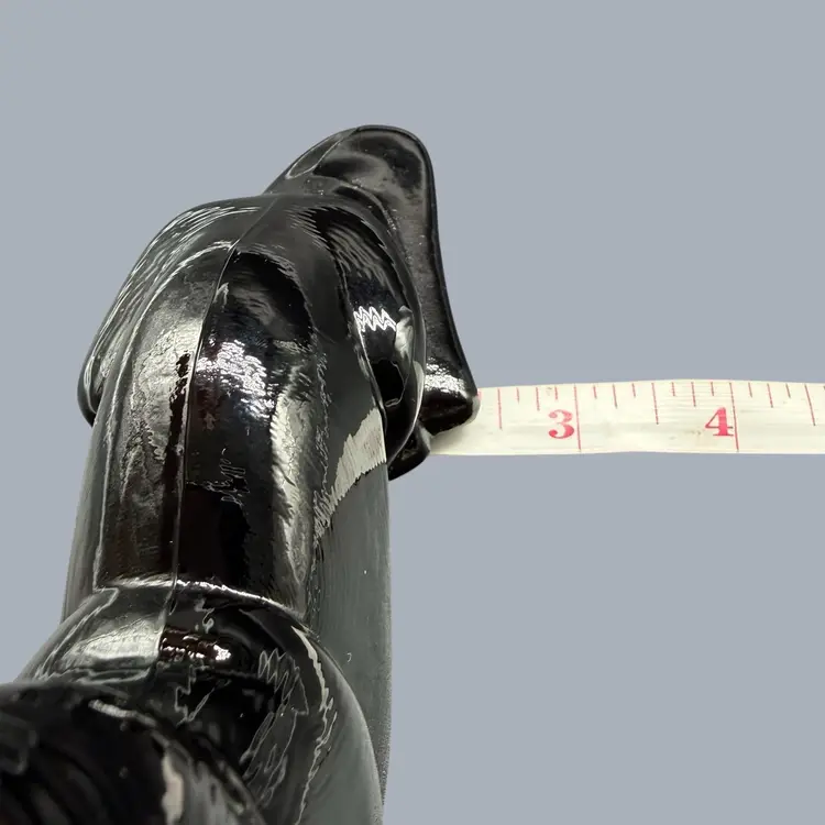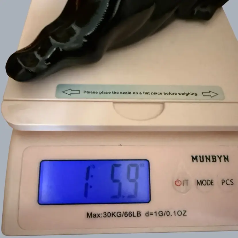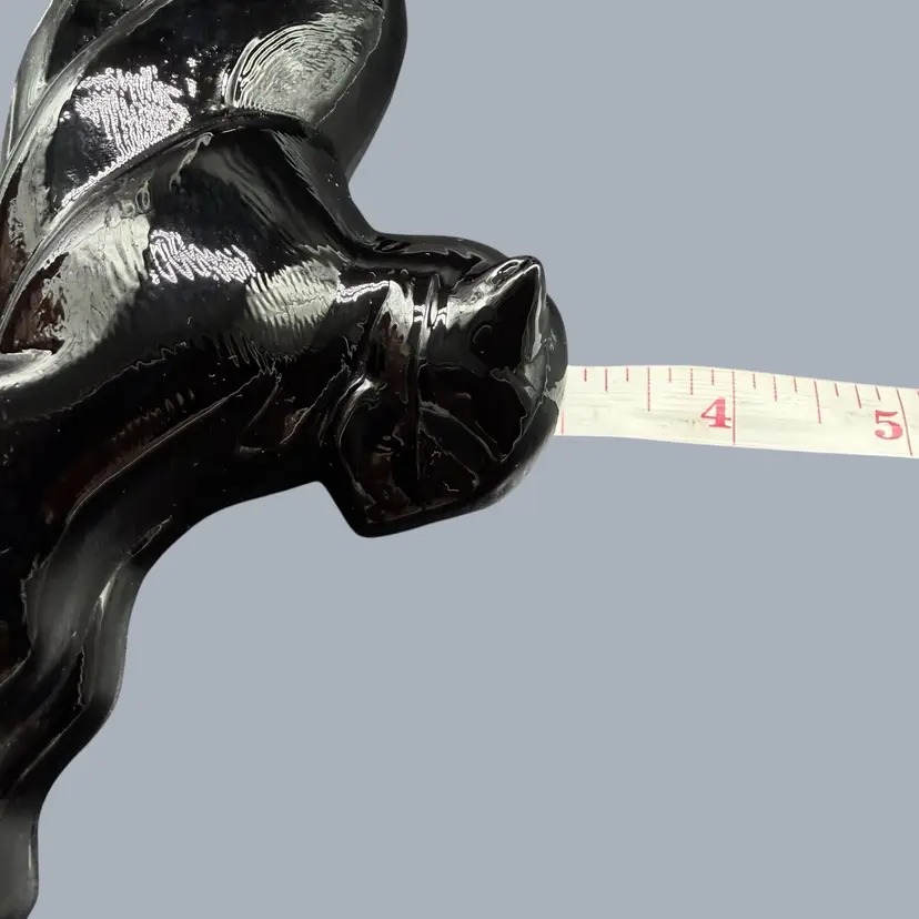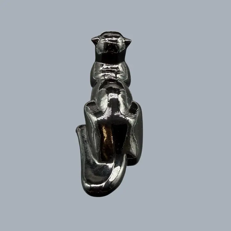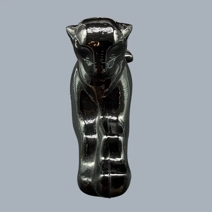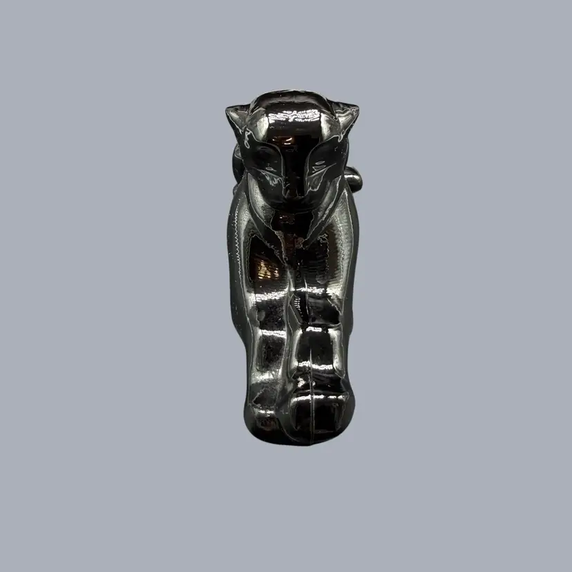 The 1980s Imperial Glass Black Ebony Panther Tiger Cat Paperweight Figurine is a vintage collectible made in North America. This pressed glass figurine features a solid black color with a glossy finish, depicting a majestic panther or tiger cat. Signed ALIG, representing the Arthur Lorch Imperial Glass mark, used in 1981-1982, prior to the glass brand’s bankruptcy, this art glass piece embodies the Art Deco style of the era. A unique addition to any decor, this original figurine reflects the period's themes of animals and periods & styles, making it a valuable piece for collectors of vintage American glass.