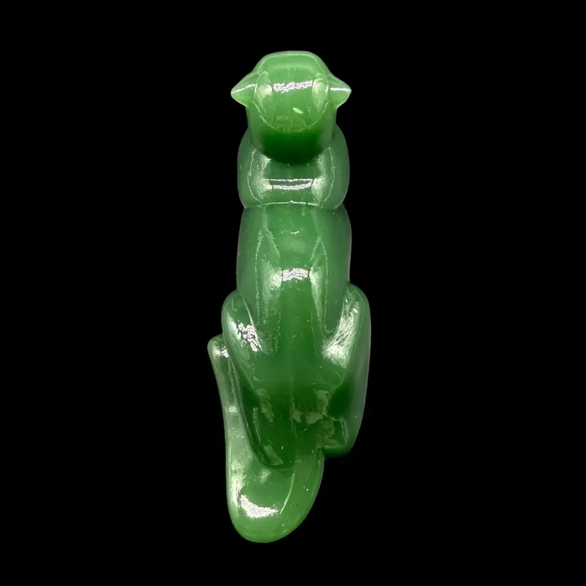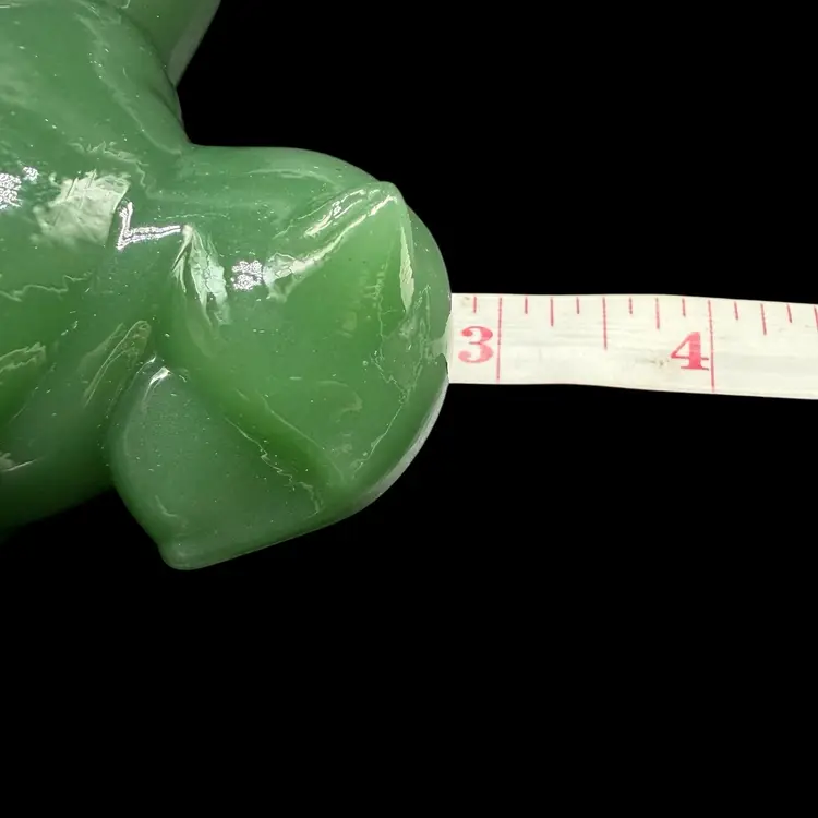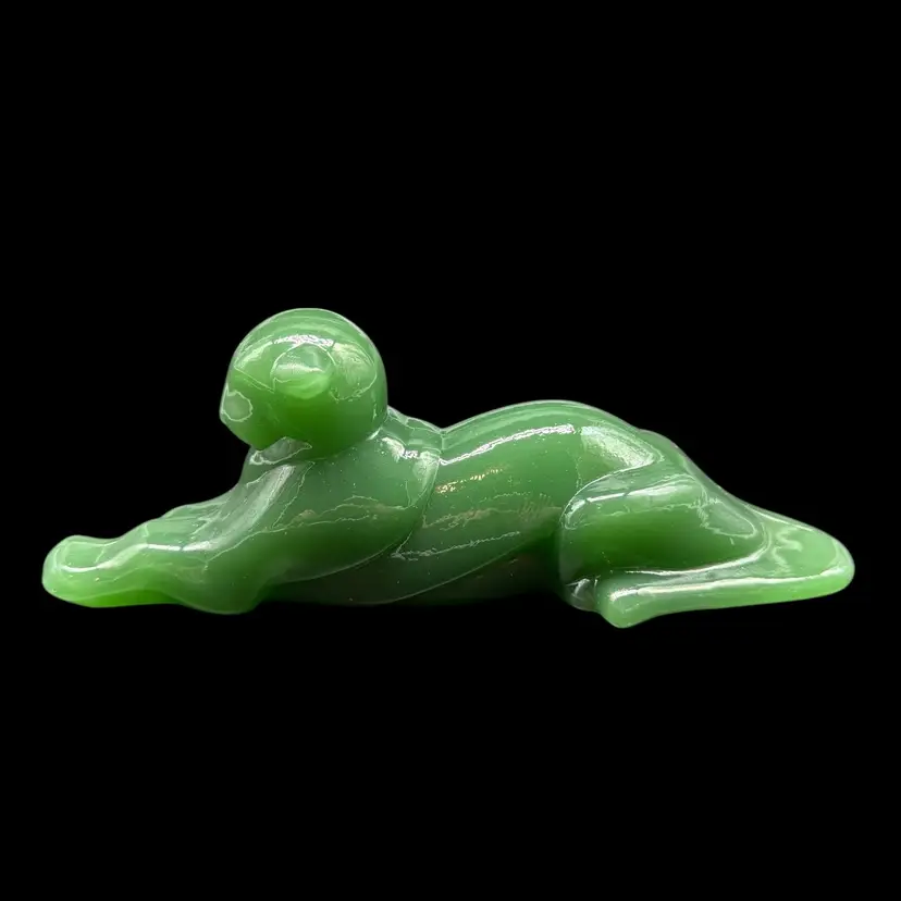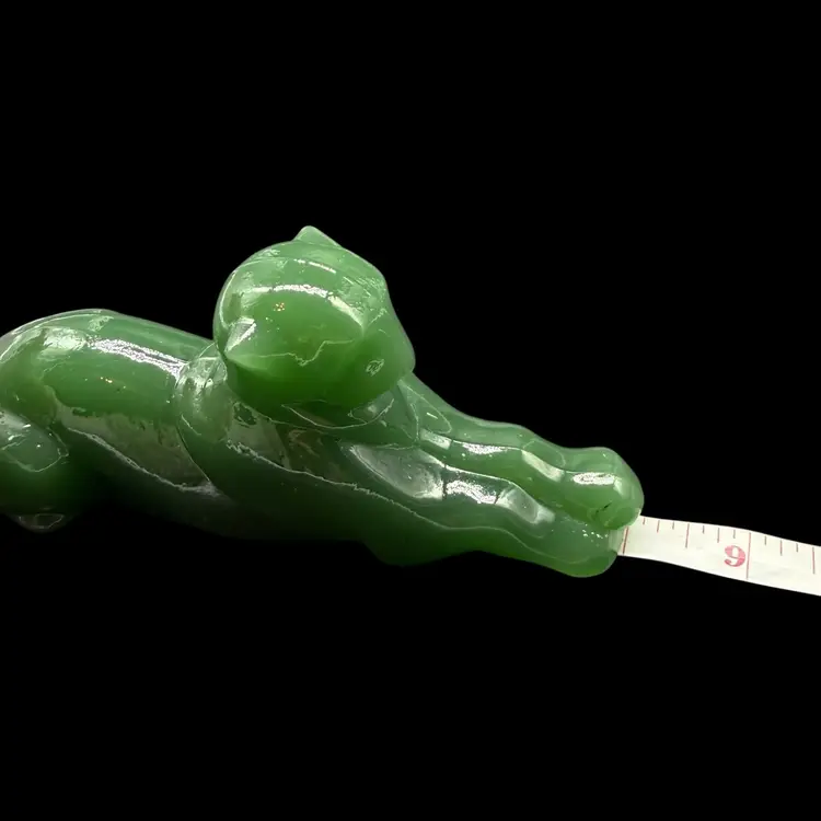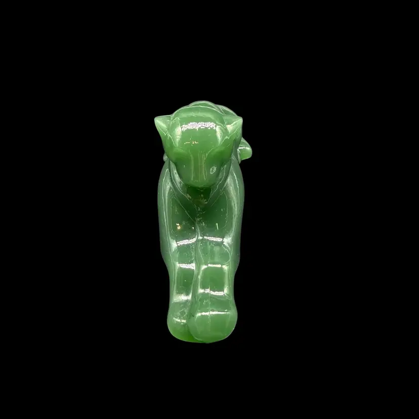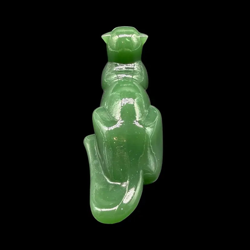 The 1980s Imperial Glass Jade Green Panther Tiger Cat Paperweight Figurine is a vintage collectible made in North America. This pressed glass figurine features a solid green color with a glossy finish, depicting a majestic panther or tiger cat. Signed ALIG, representing the Arthur Lorch Imperial Glass mark, used in 1981-1982, prior to the glass brand’s bankruptcy, this art glass piece embodies the Art Deco style of the era. A unique addition to any decor, this original figurine reflects the period's themes of animals and periods & styles, making it a valuable piece for collectors of vintage American glass.