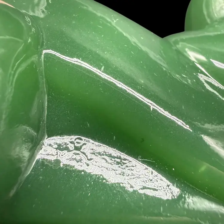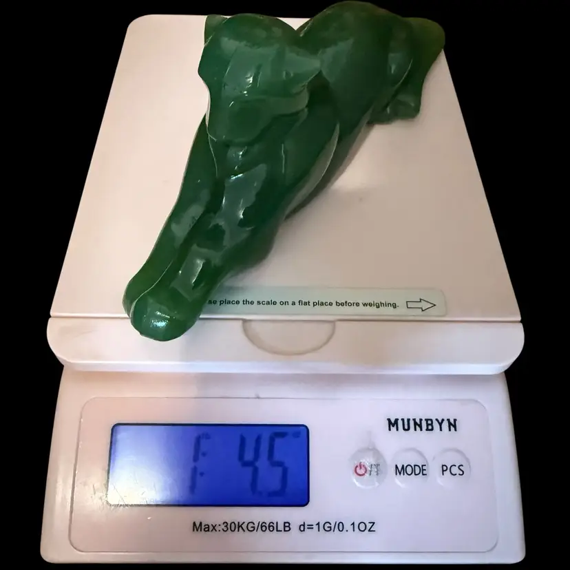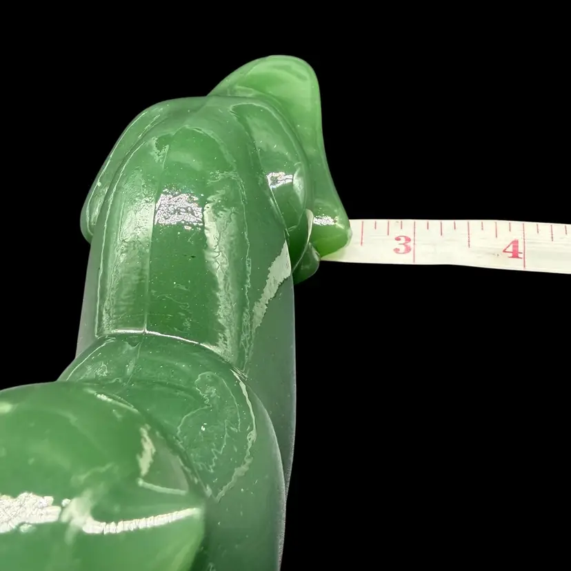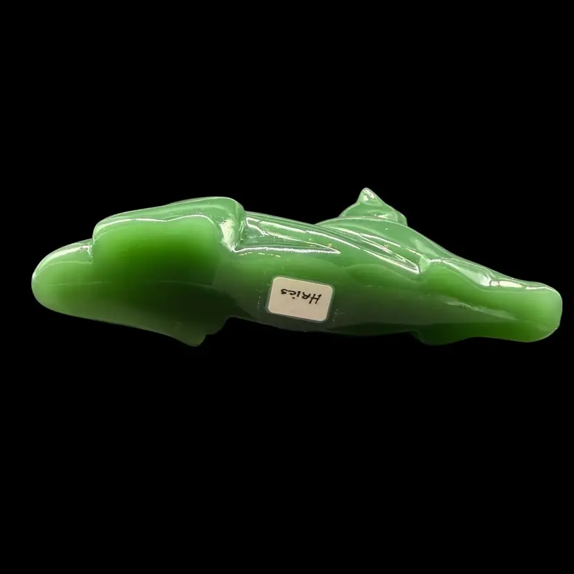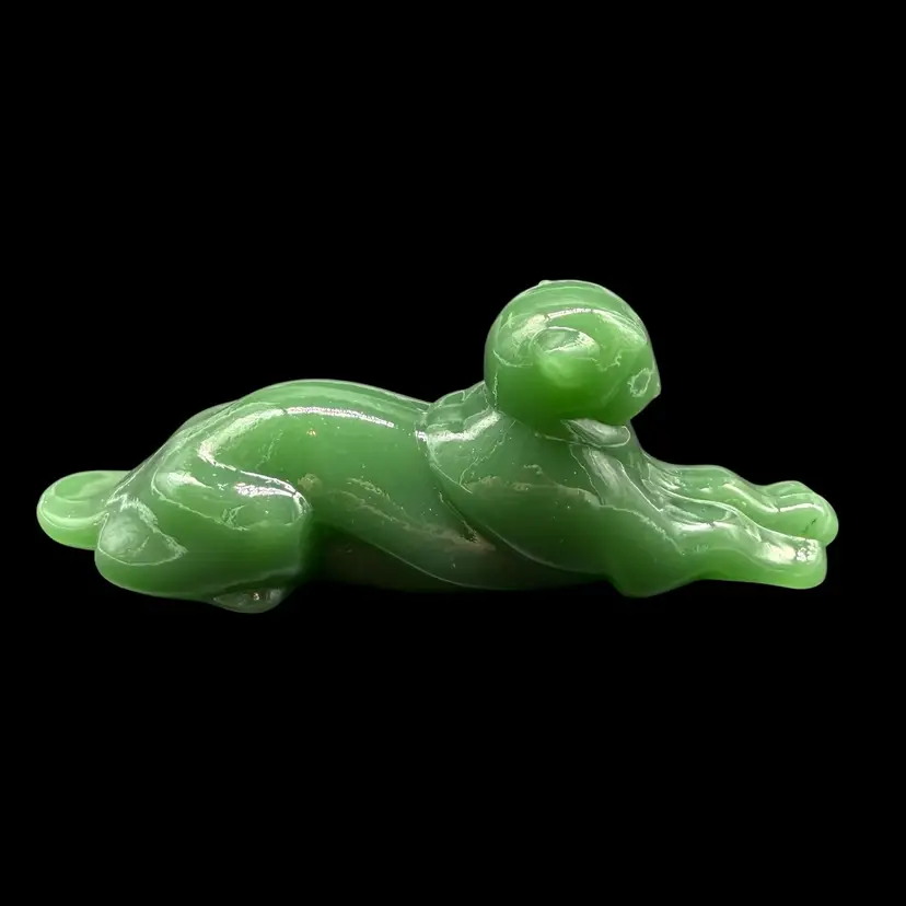 The 1980s Imperial Glass Jade Green Panther Tiger Cat Paperweight Figurine is a vintage collectible made in North America. This pressed glass figurine features a solid green color with a glossy finish, depicting a majestic panther or tiger cat. Signed ALIG, representing the Arthur Lorch Imperial Glass mark, used in 1981-1982, prior to the glass brand’s bankruptcy, this art glass piece embodies the Art Deco style of the era. A unique addition to any decor, this original figurine reflects the period's themes of animals and periods & styles, making it a valuable piece for collectors of vintage American glass.