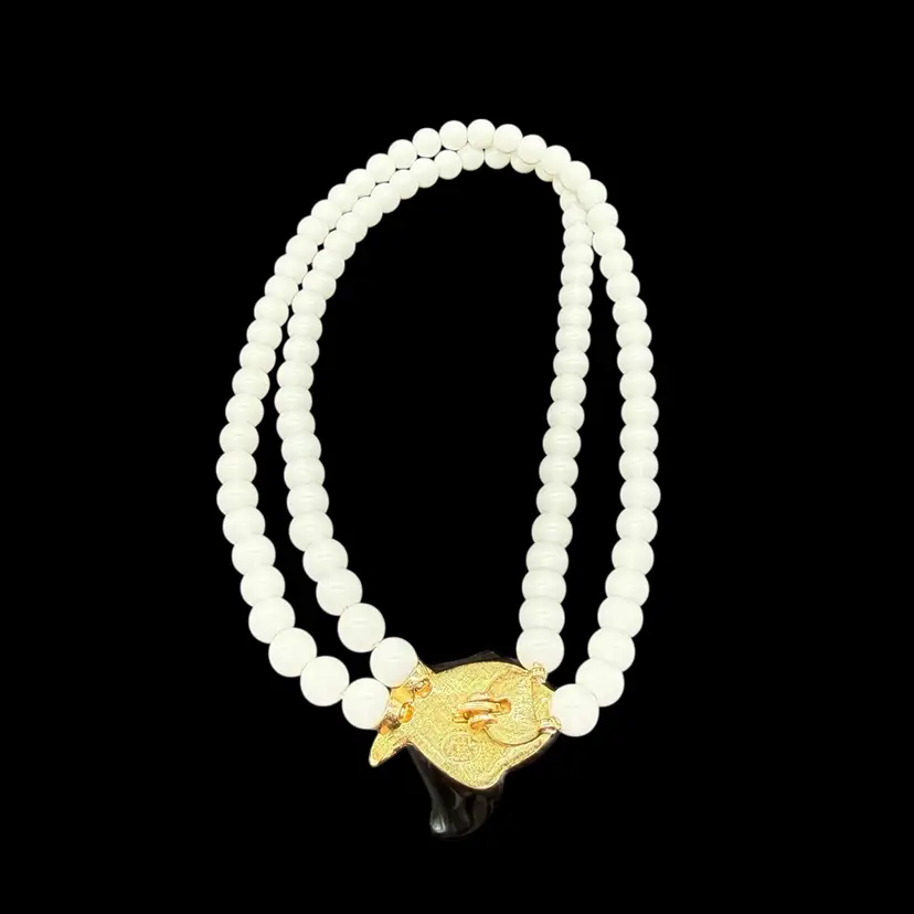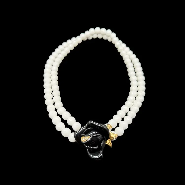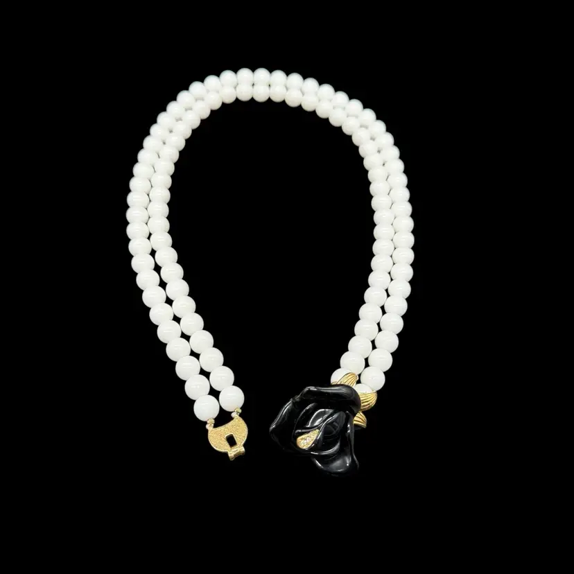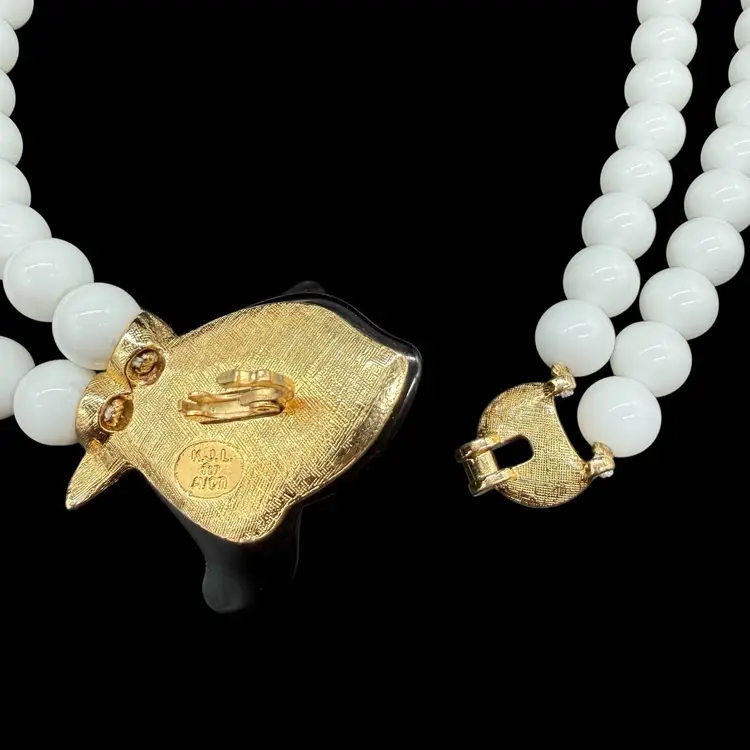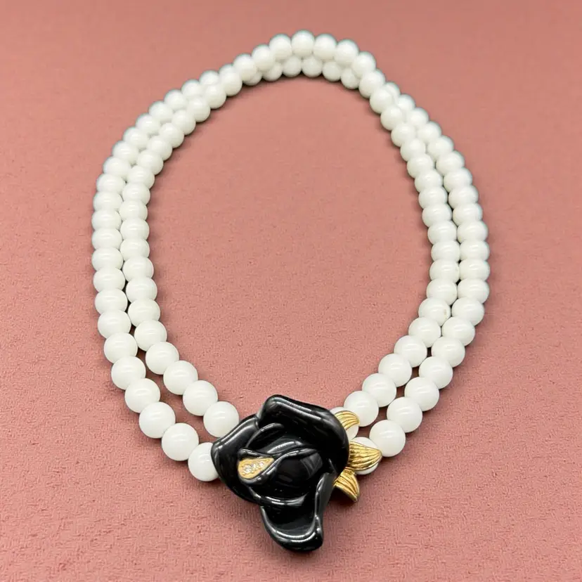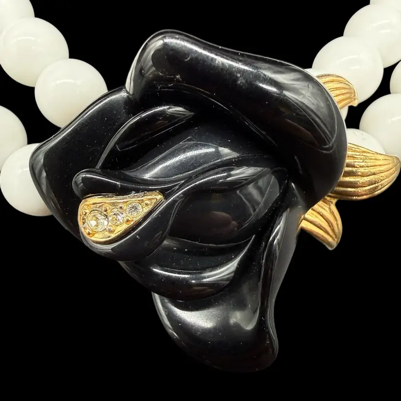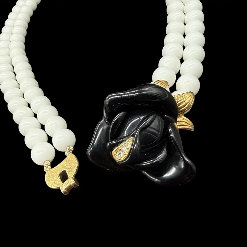 The 1980s KJL For AVON Signed Black Midnight Rose White Beaded Statement Necklace is a vintage piece of fashion jewelry featuring a flower-shaped enameled pendant with clear crystals. This necklace is a statement piece with a unique black and white color scheme, perfect for collectors of retro and designer jewelry from the 1980s. The snap closure and 19-inch necklace length make it easy to wear, while the beaded chain and enamel details add a touch of elegance to any outfit. Signed by the brand KJL For Avon, this original piece is a true gem for those who appreciate vintage beauty and style.