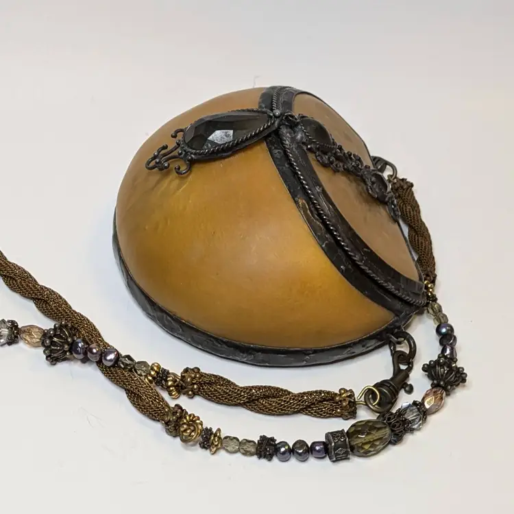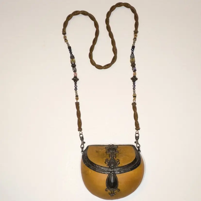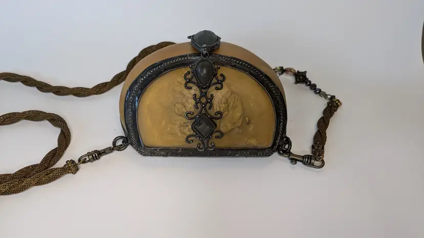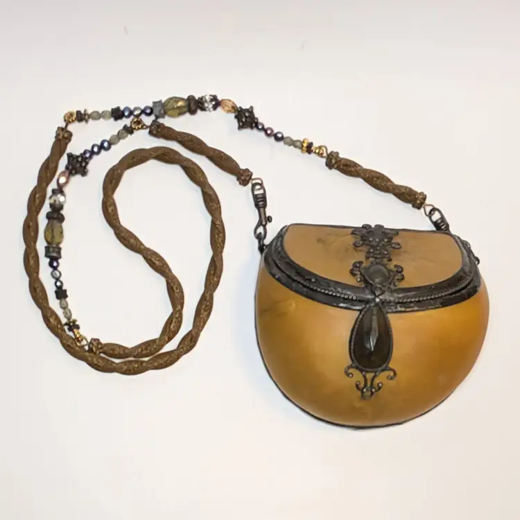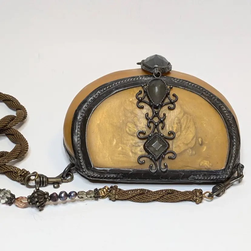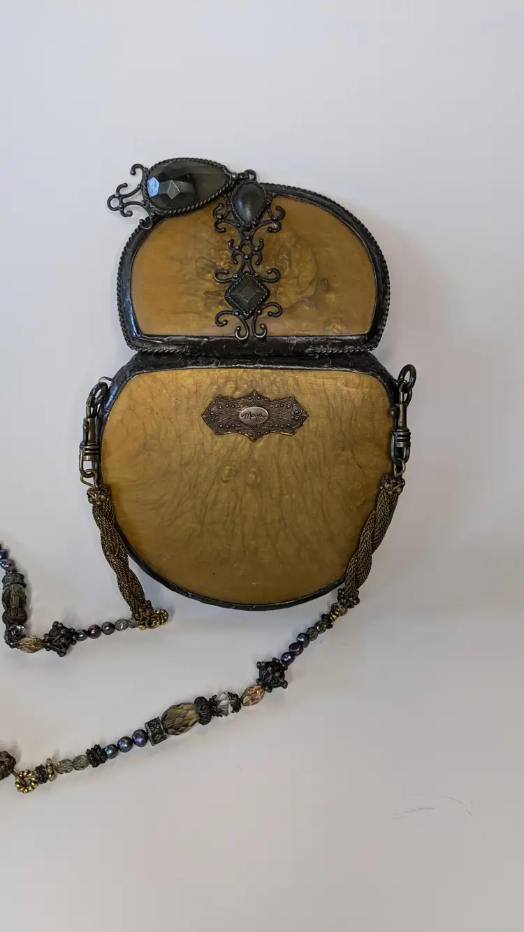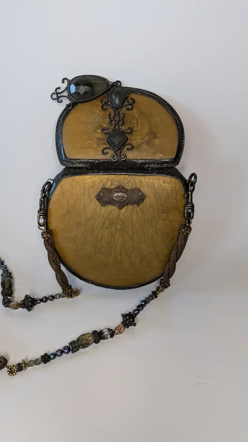 Offering this one of a kind hand crafted hard shell crossbody Shoulder purse by Maya Evangelista featuring a faux stone look shell body, metal trim and mesh, vintage metal stone and acrylic beaded removable strap, sturdy magnetic snap closure. This bag has a stunning vintage look, with makers signature name plate present, and it is in excellent used condition! 5" tall x 5.1/2" long x 3" deep/ strap has a 21.1/2" drop, strap is a total 43" long. Circa 1985, New York USA Very Cool! Looks even more amazing in person