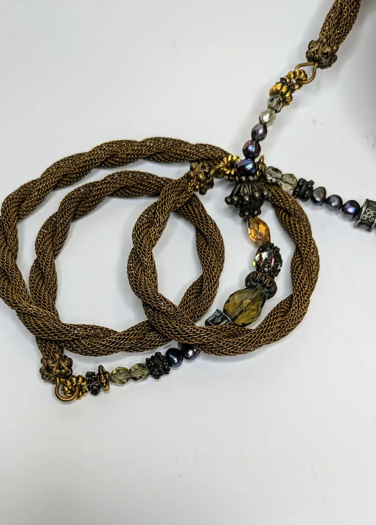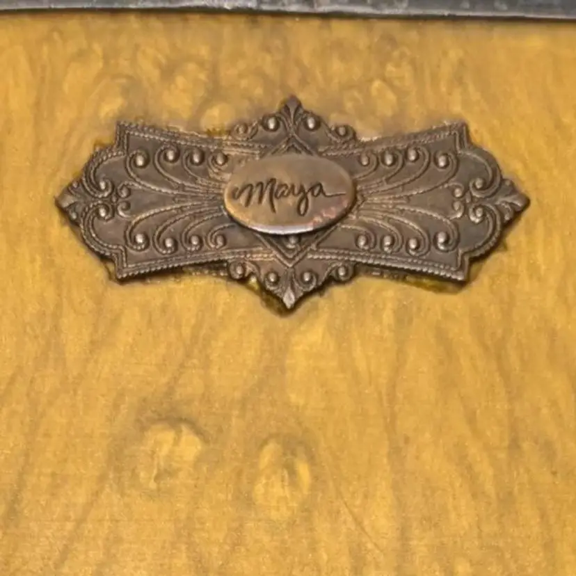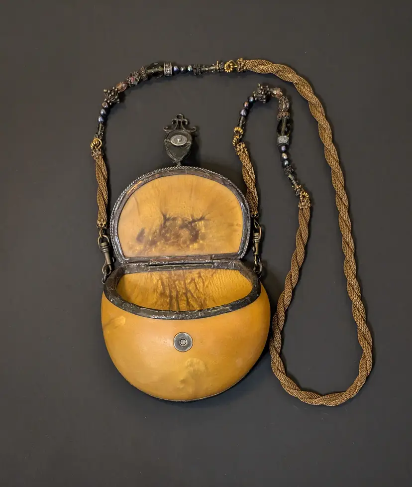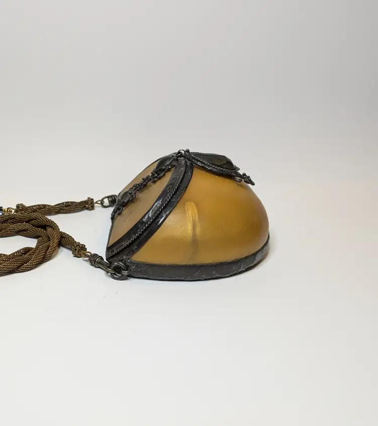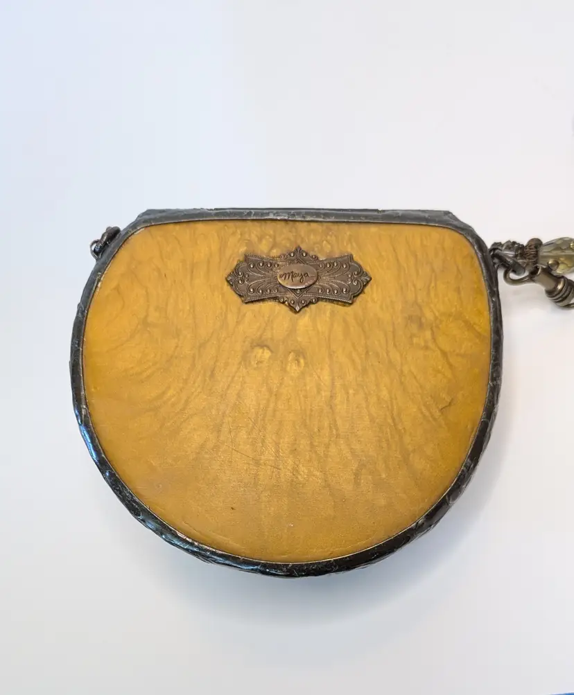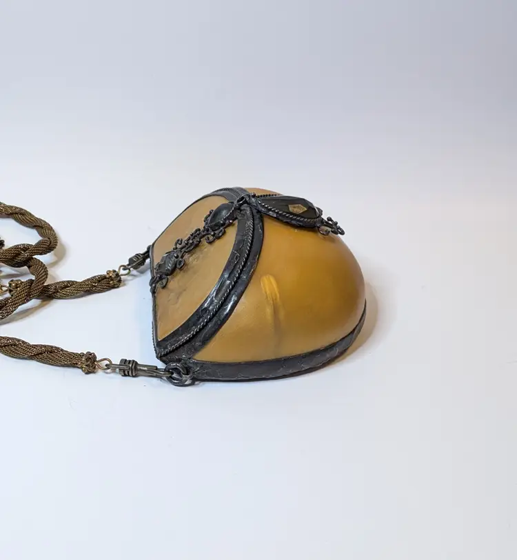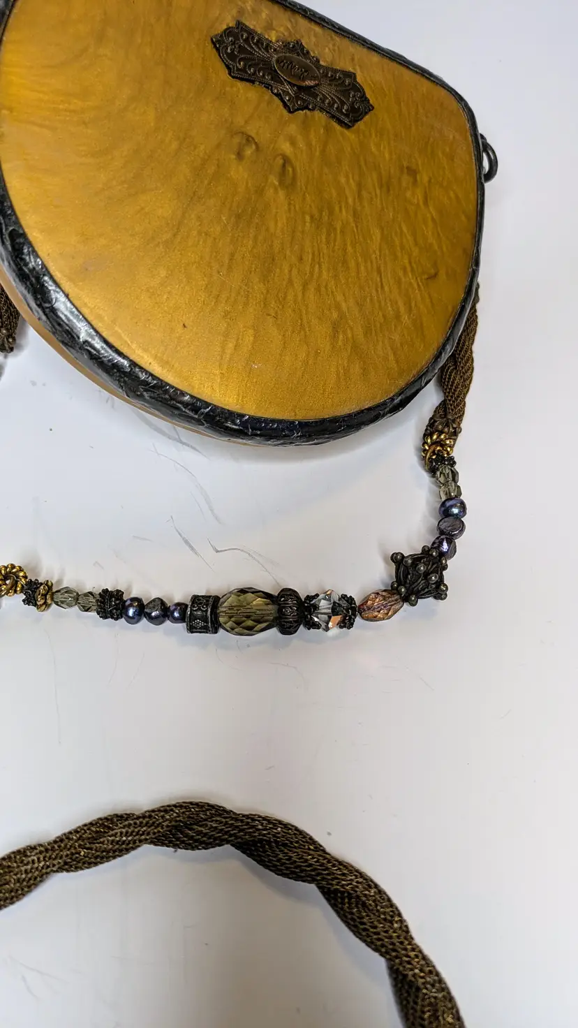 Offering this one of a kind hand crafted hard shell crossbody Shoulder purse by Maya Evangelista featuring a faux stone look shell body, metal trim and mesh, vintage metal stone and acrylic beaded removable strap, sturdy magnetic snap closure. This bag has a stunning vintage look, with makers signature name plate present, and it is in excellent used condition! 5" tall x 5.1/2" long x 3" deep/ strap has a 21.1/2" drop, strap is a total 43" long. Circa 1985, New York USA Very Cool! Looks even more amazing in person