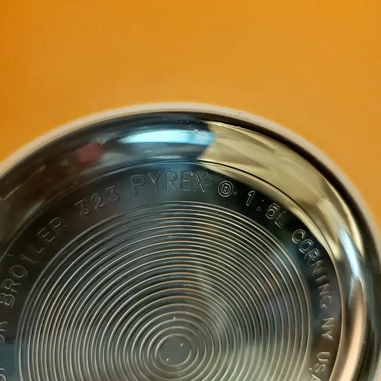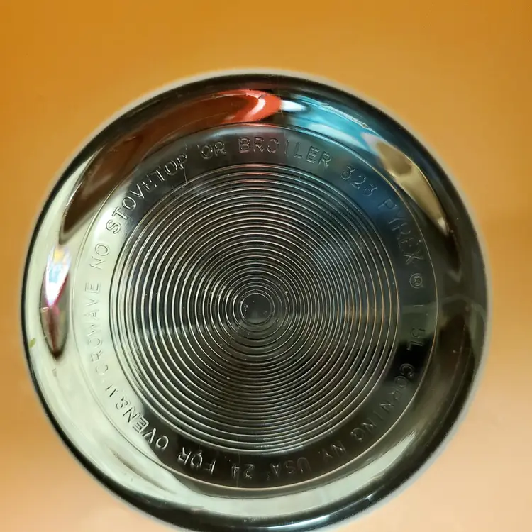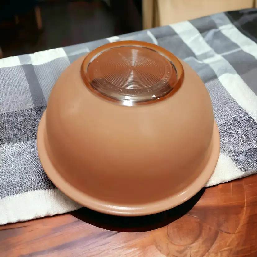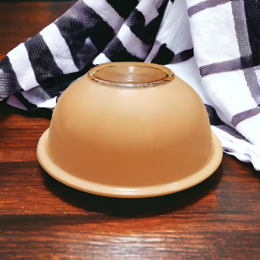 This vintage Pyrex nesting bowl in a beautiful pastel peach color with a clear bottom is perfect for any occasion. It is the middle size of three-piece nesting bowl set made in the late 80s. 7" diameter and 3" tall. No chips or cracks, in great vintage condition!