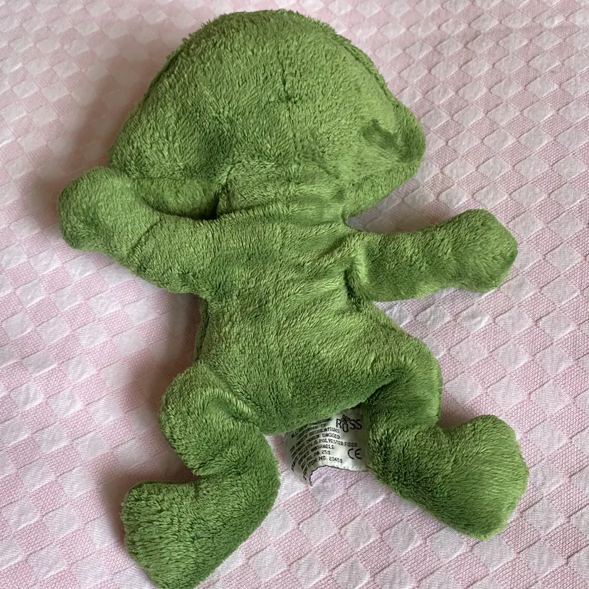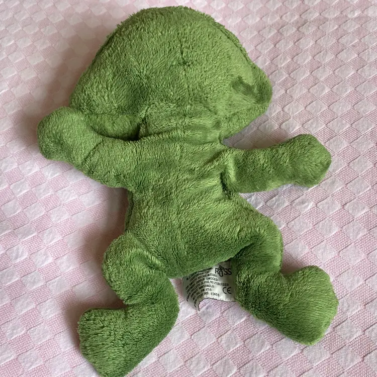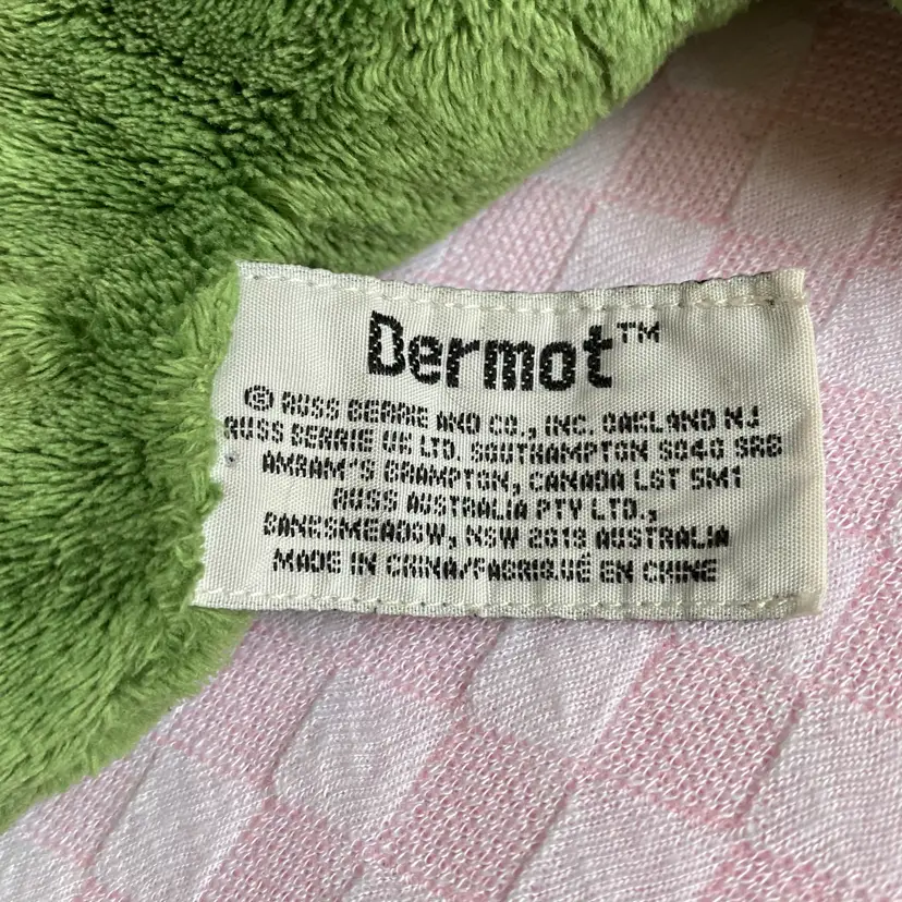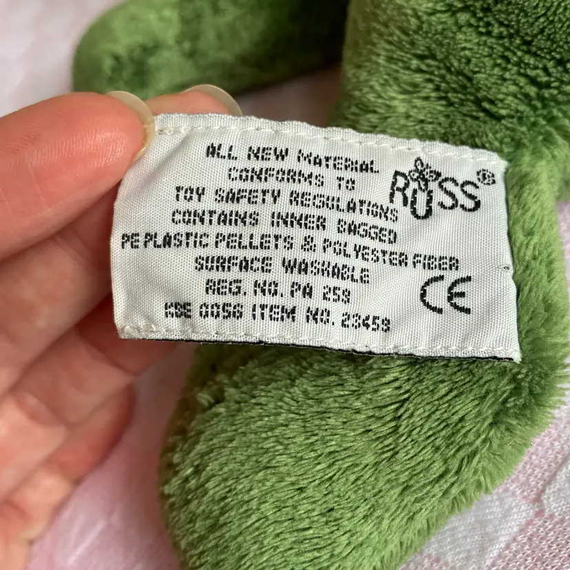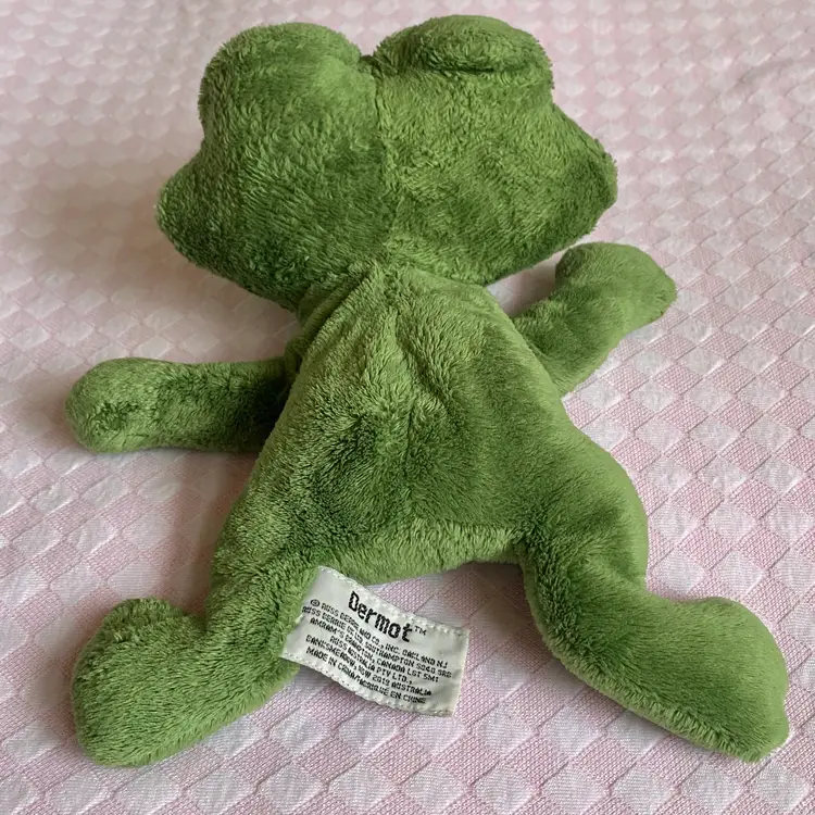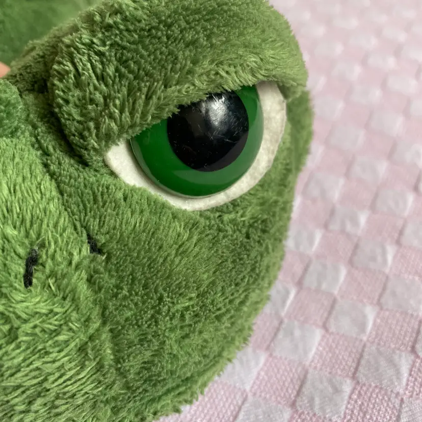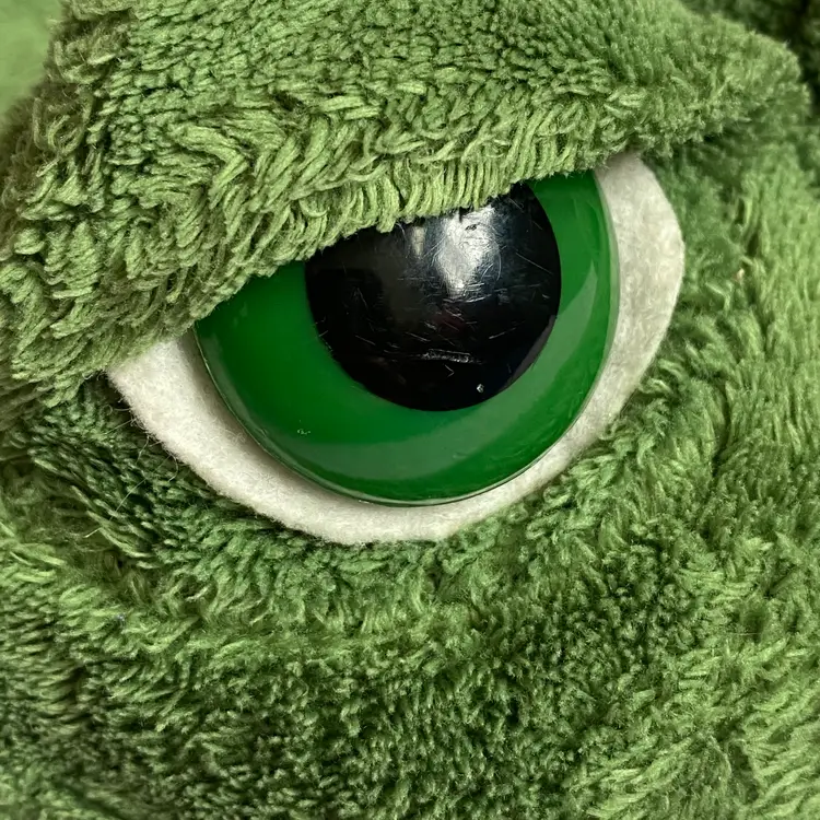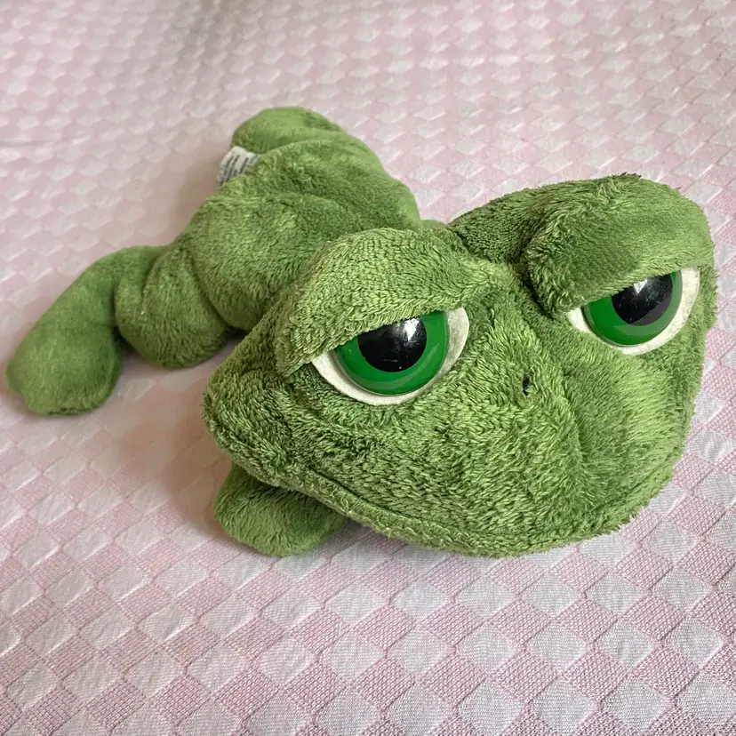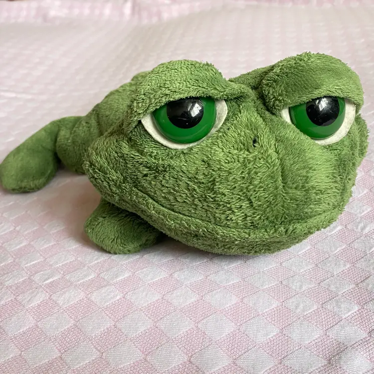 Vintage 1980s Russ Berrie "Dermot the frog" plush toy with big peepers π. His butt, hands and feet are weighted with plastic pellets and he's filled with fluff throughout the rest. In great vintage condition with only some smooth wear to the fronts of the plastic eyes. 11" length