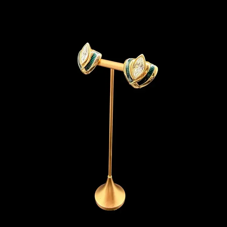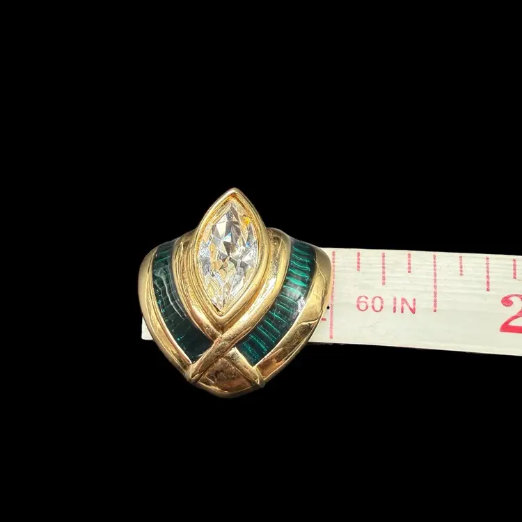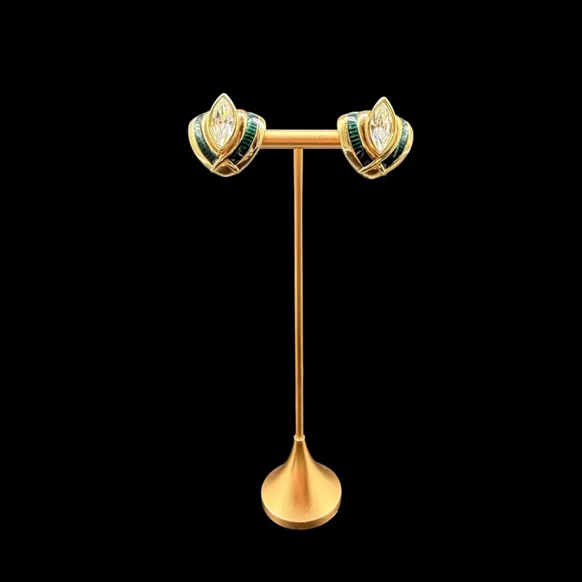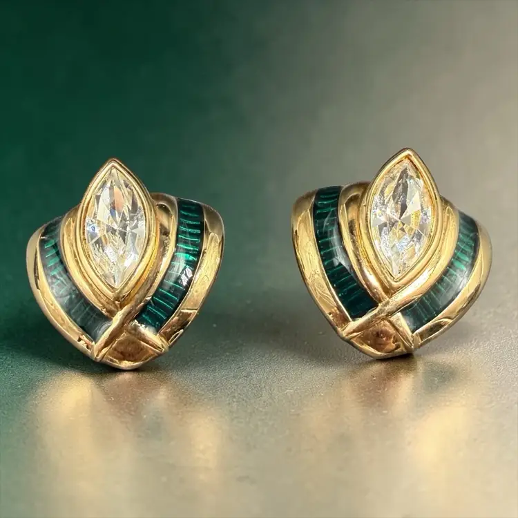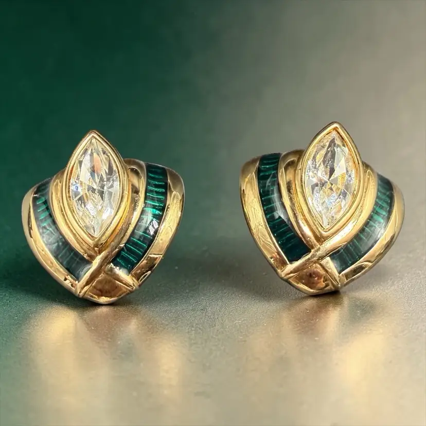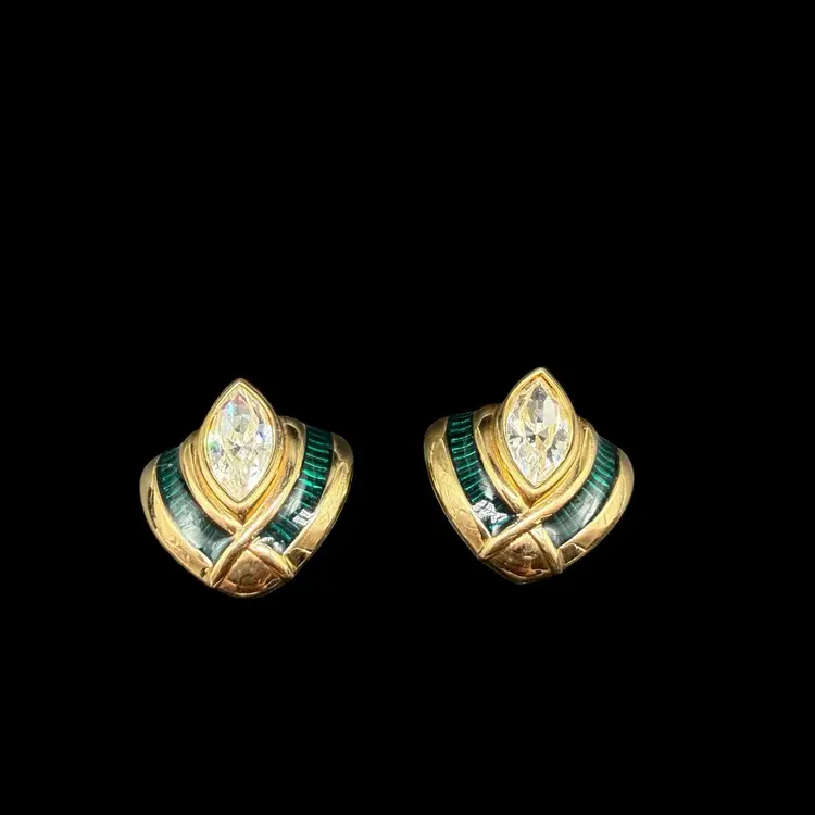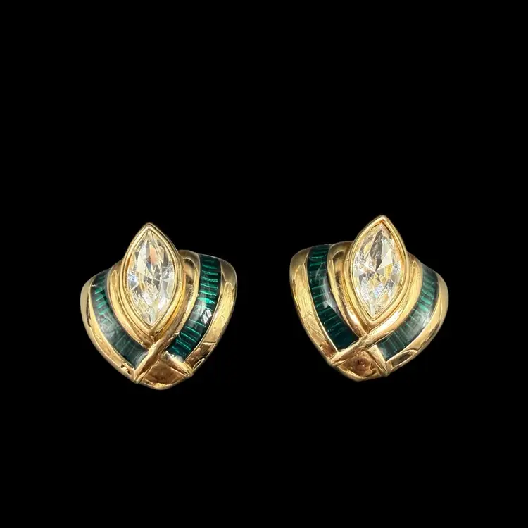 These 1980s SWAROVSKI Crystal S.A.L. Green Enamel Marquise Clip On Earrings in Gold Tone are a beautiful vintage piece of jewelry. The geometric shape, signed by Swarovski, features a marquise white/colorless crystal main stone. The earrings are made of enamel, metal, and crystal with a clip-on closure, making them perfect for everyday wear or any occasion. Made in Austria, these earrings showcase a bezel setting style and are a unique addition to any jewelry collection.