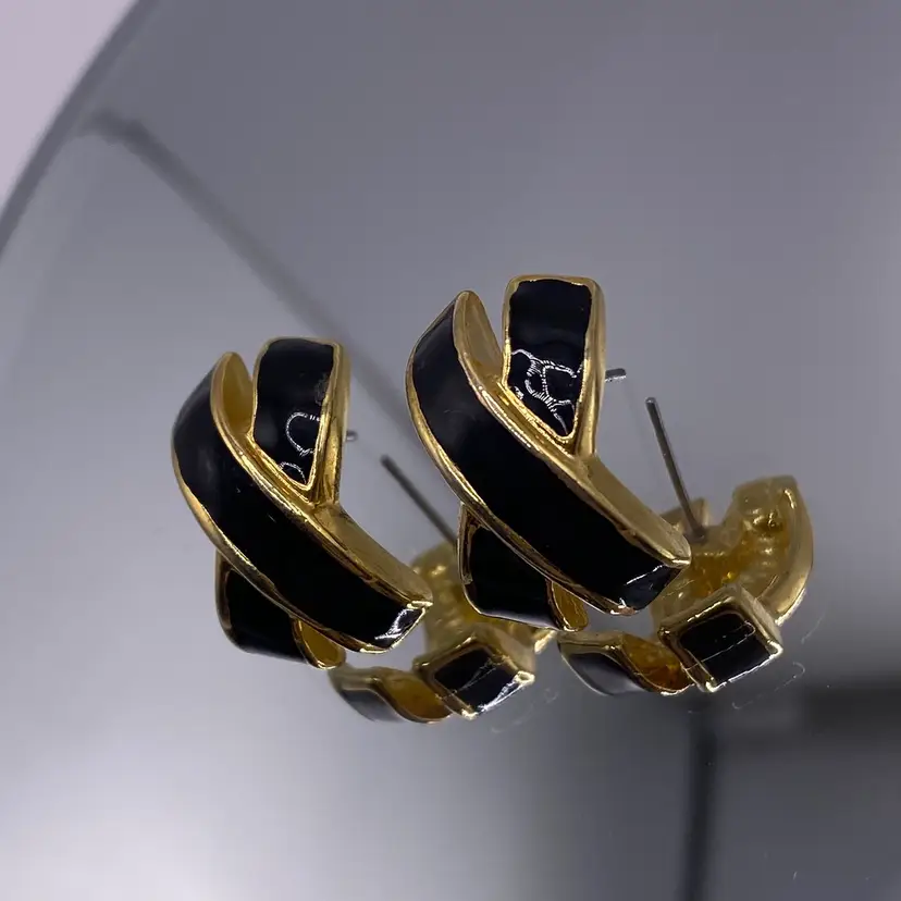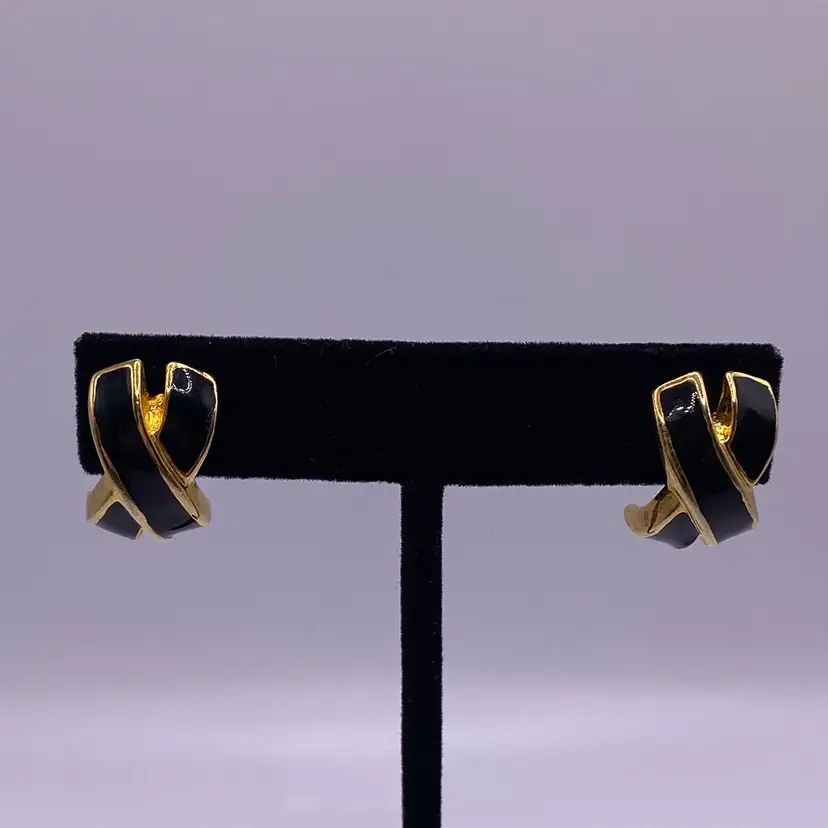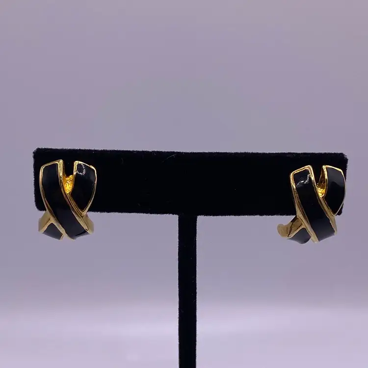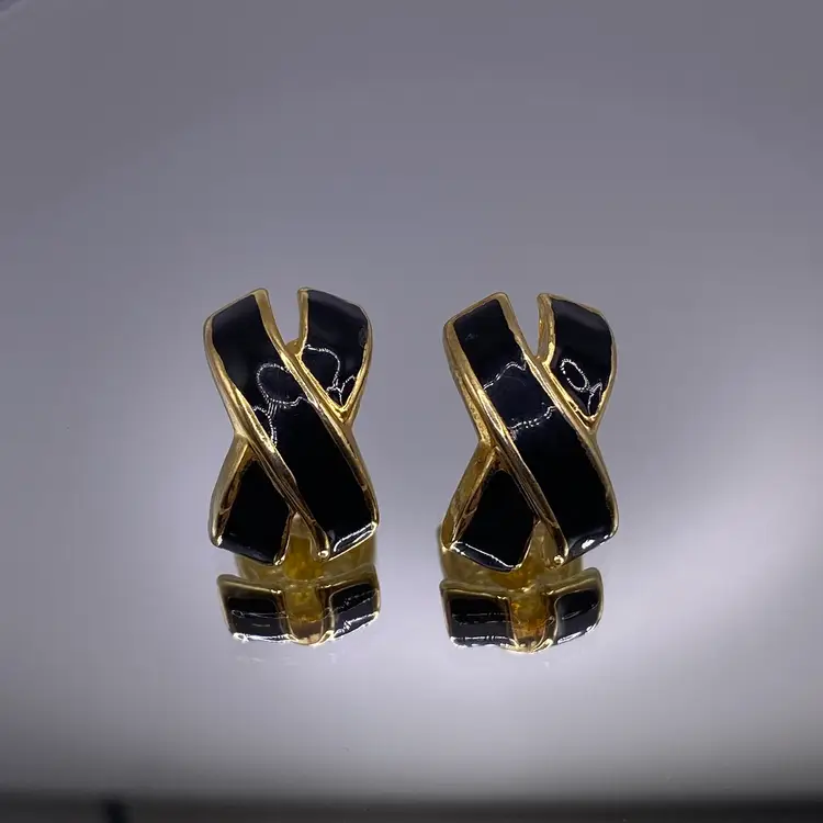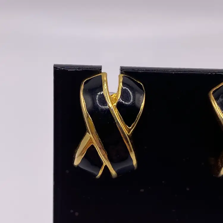 Add a touch of elegance to your outfit with these stunning black enamel criss cross post earrings. With a gold tone metal finish, these earrings are perfect for any casual or formal occasion. The unique cross shape and stud style make them a beautiful addition to your jewelry collection.