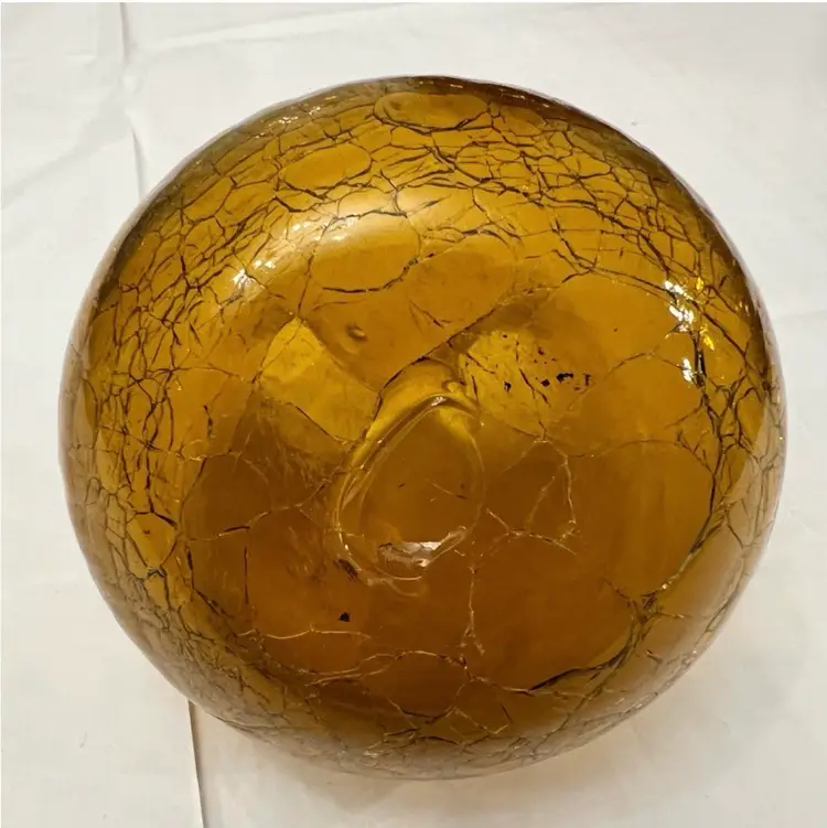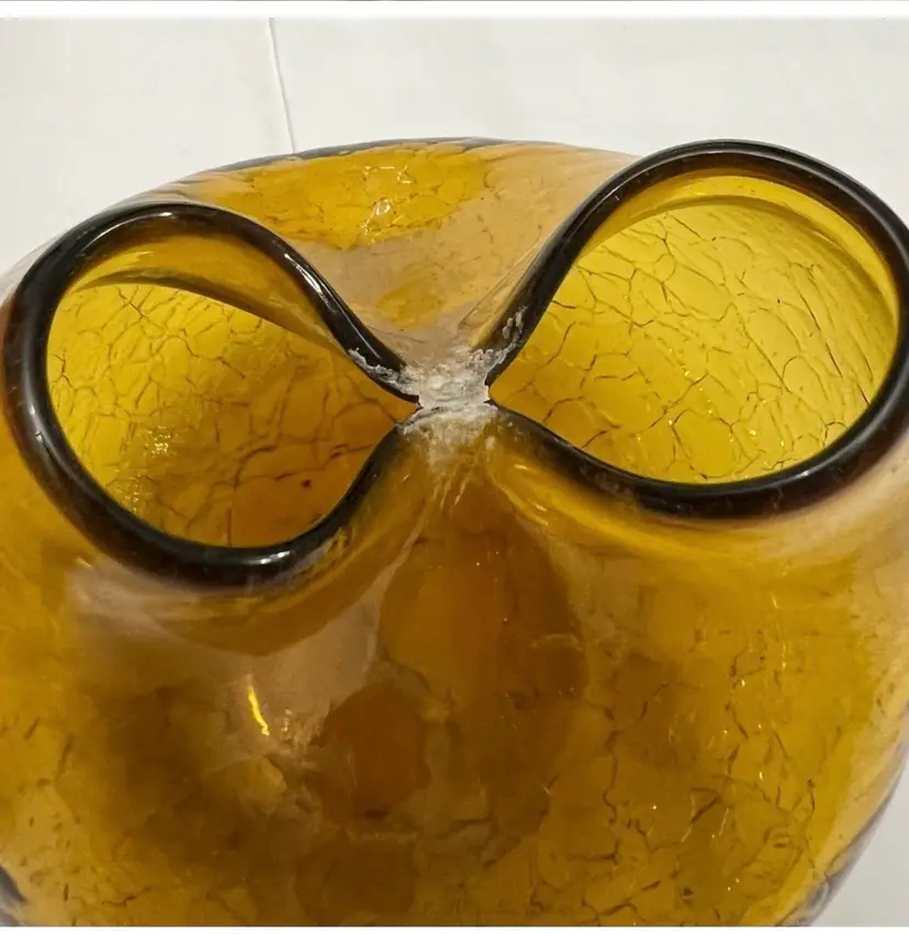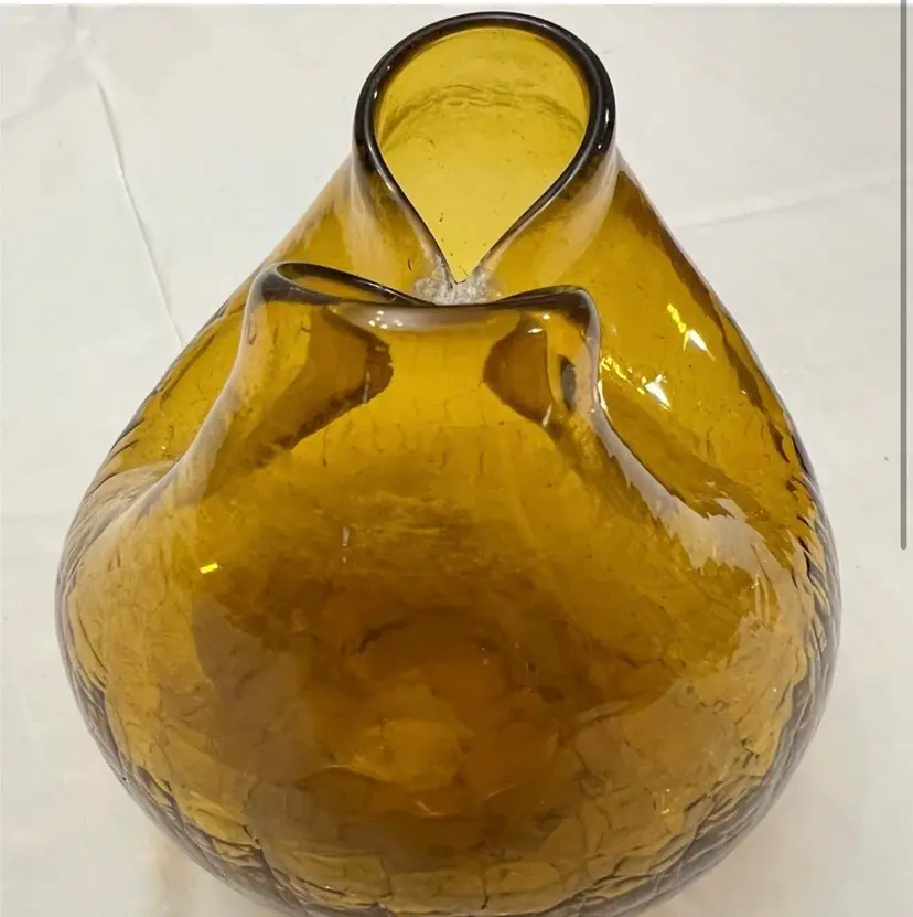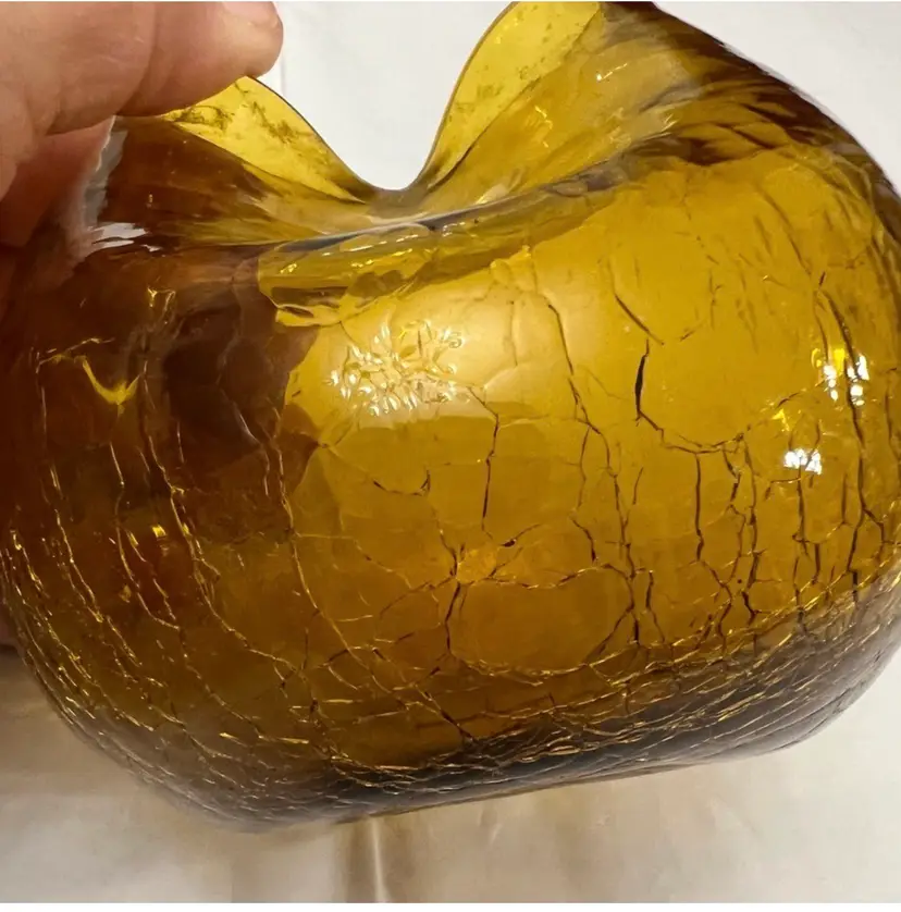 Vintage MCM Blenko Cracked Amber Pinched Vase, Hand Blown Glass Art, Amber Spattered. This piece is an excellent condition on the bottom there is the rainbow spot. I've put in a few pictures so that you may be able to view this Where the pinches meet you can see where the blown glass stop. It is an excellent condition for being vintage. Amber Crackled pinch Vase 4 × 4..