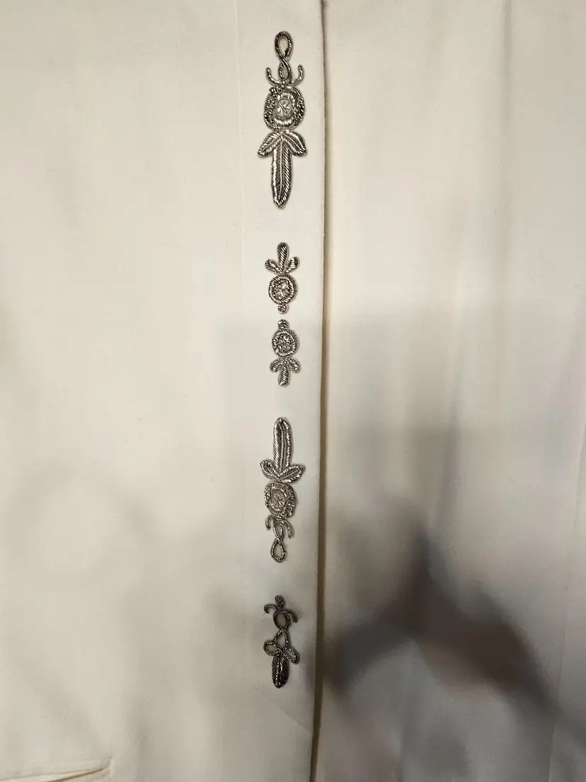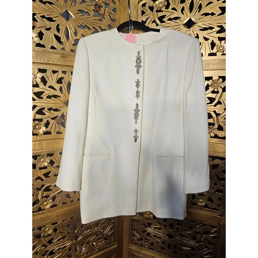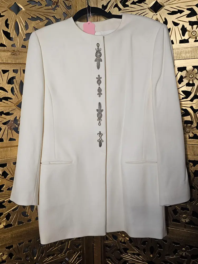 1980s Mondi Cream Wool & Cashmere blazer with silver embroidery 🍁Volup Size!🍁 This gorgeous blazer is an ultra soft mix of pure new wool and cashmere. It has light shoulder padding, hidden buttons and gorgeous silver embroidery on the front. Fantastic condition Approximate measurements- Chest 42.5" waist 38" hips 44" sleeve length 24" shoulder to shoulder 17"
