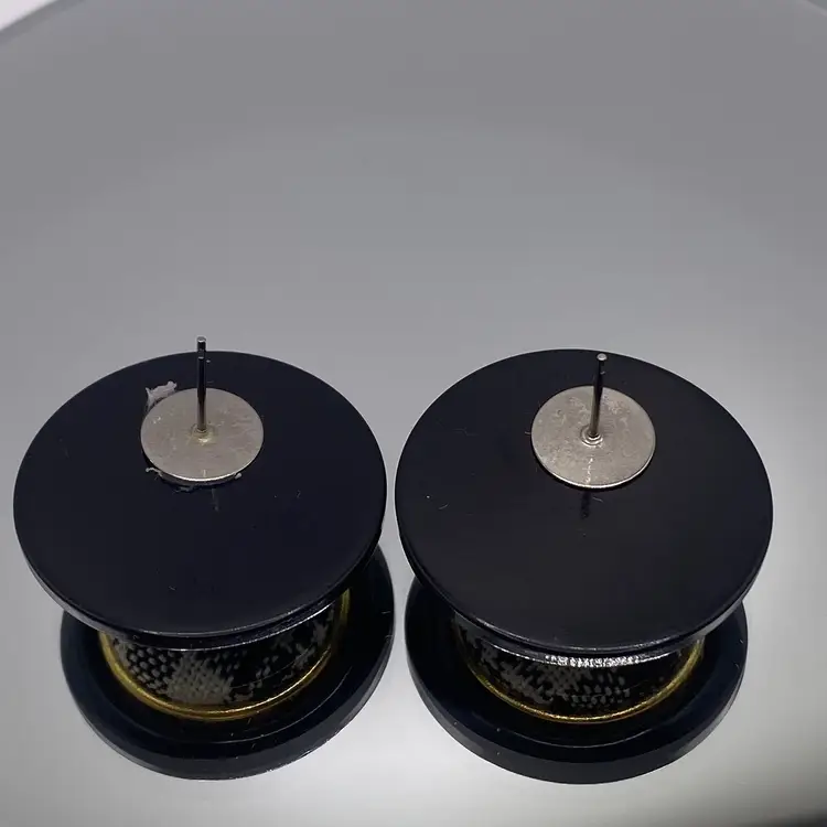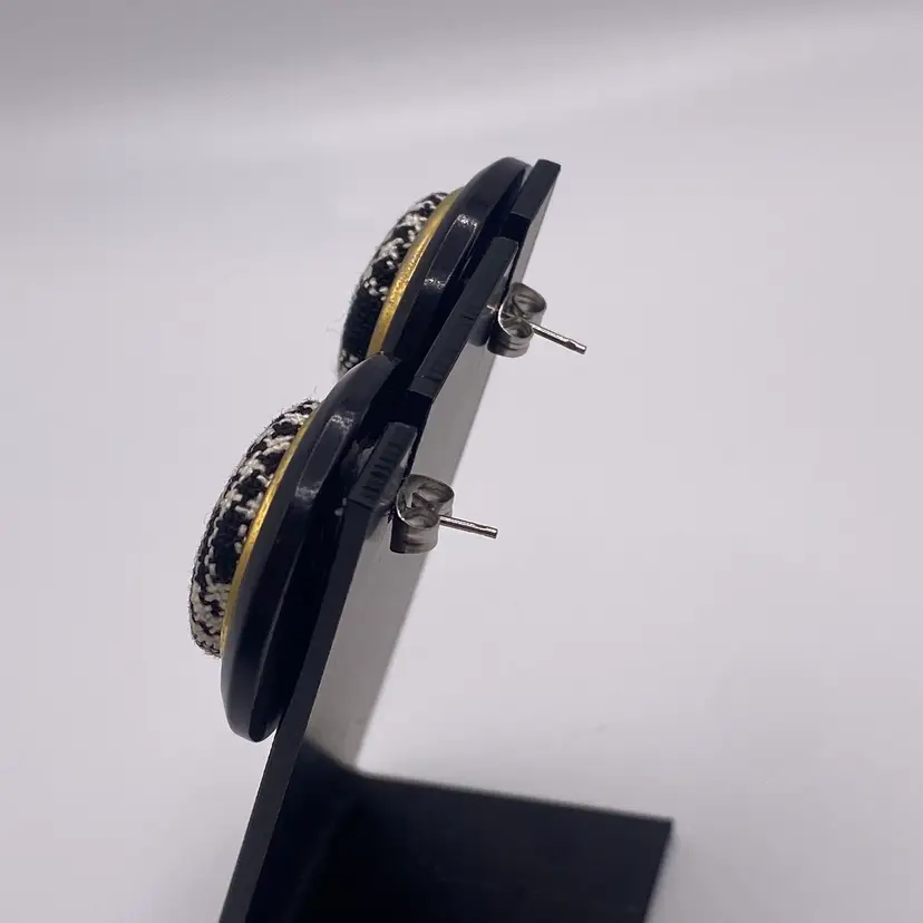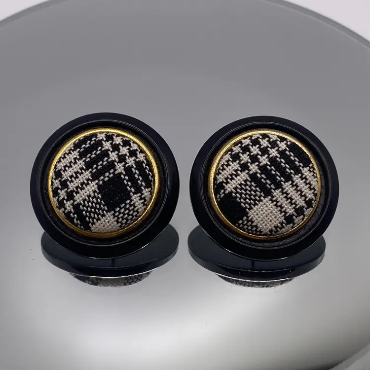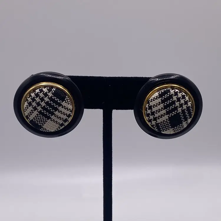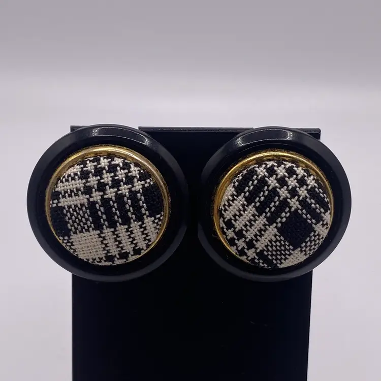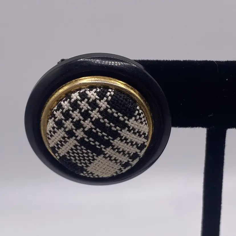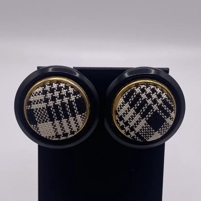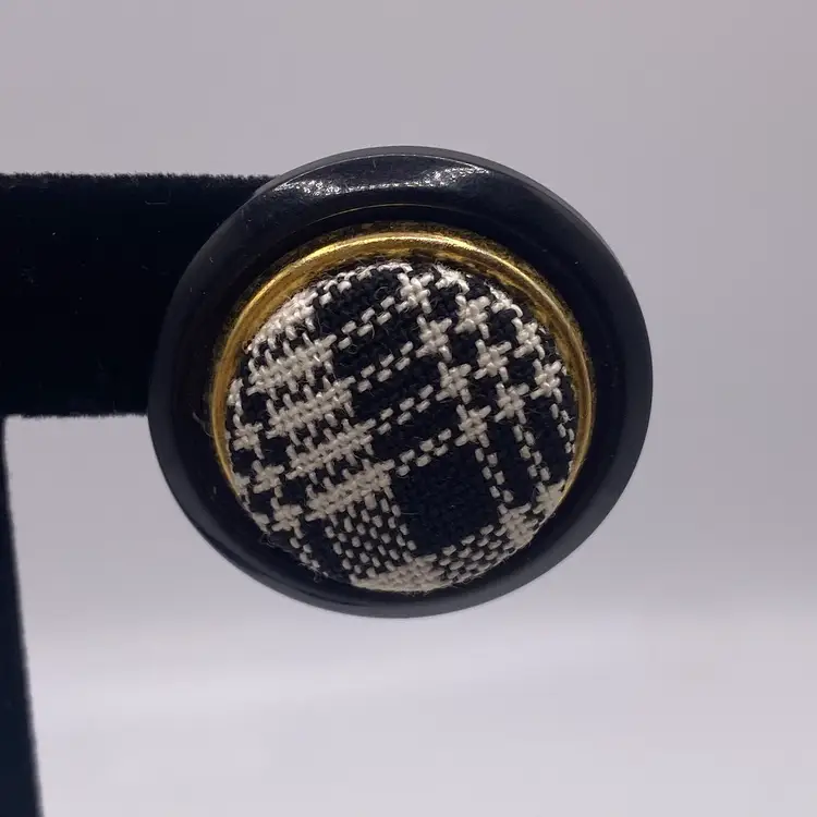 Add a touch of vintage glam to your outfit with these 1β 1980's houndstooth fabric earrings. The black and white design is perfect for any occasion, whether it's casual or formal. The round shape and stud style make them easy to wear and comfortable on the earlobe.