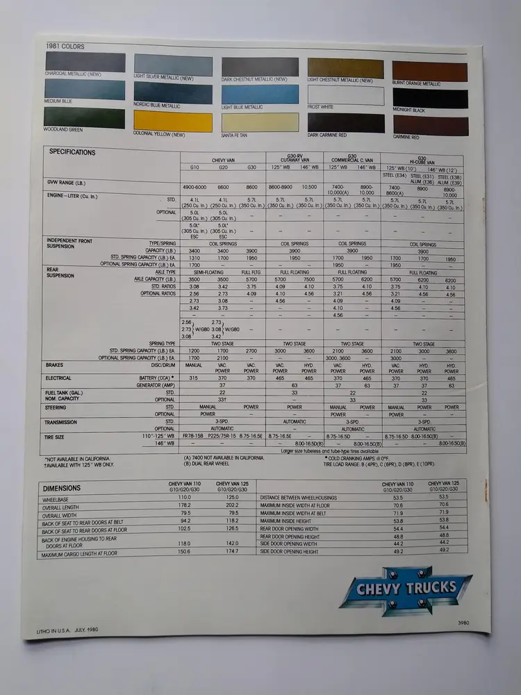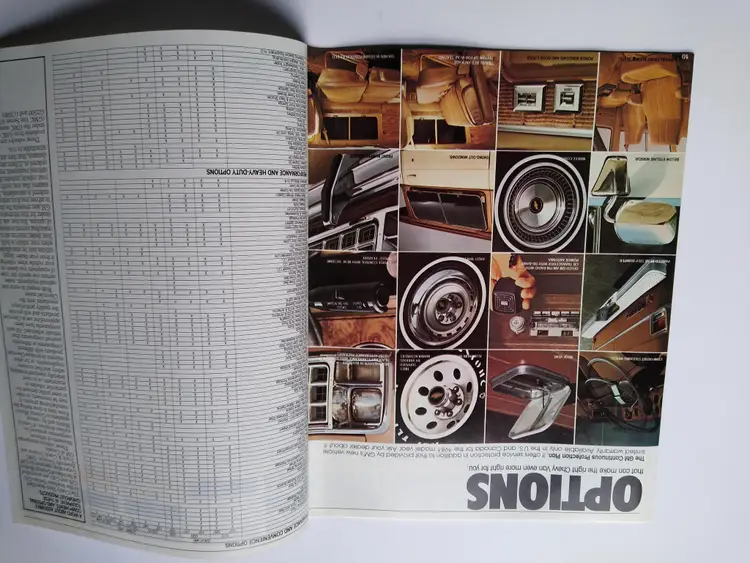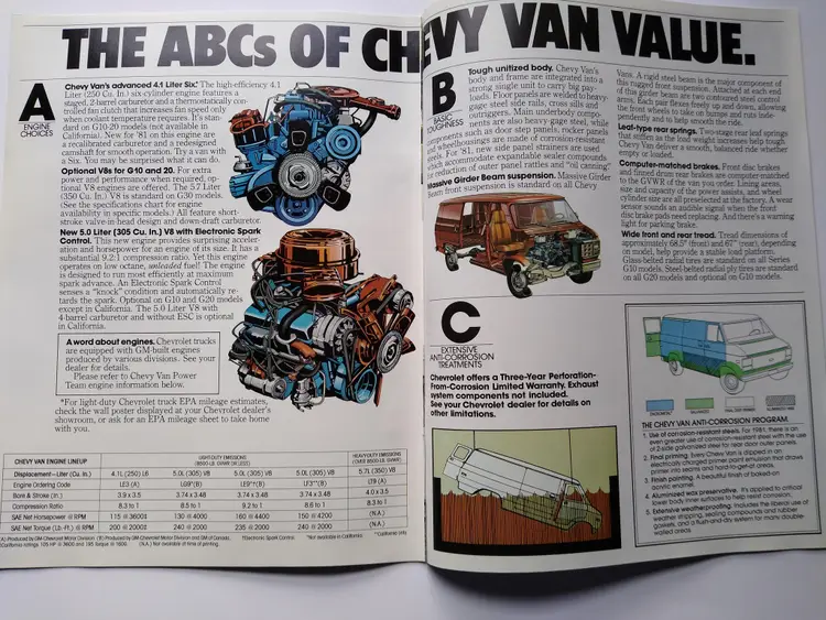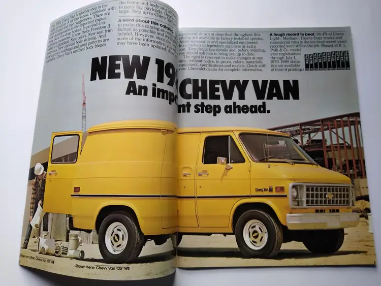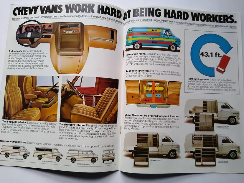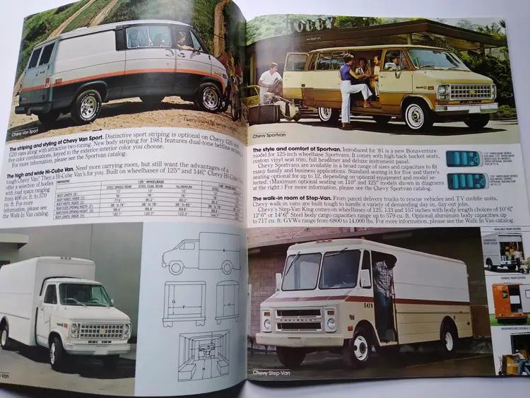 This is an original vintage sales brochure from 1981 for Chevy vans and trucks. The brochure is a foldout design showcasing the cargo and work capabilities of the vehicles. It was manufactured in the United States during the time period of 1960-Now. The product has not been modified and is a unique piece of ephemera for collectors of automotive memorabilia.