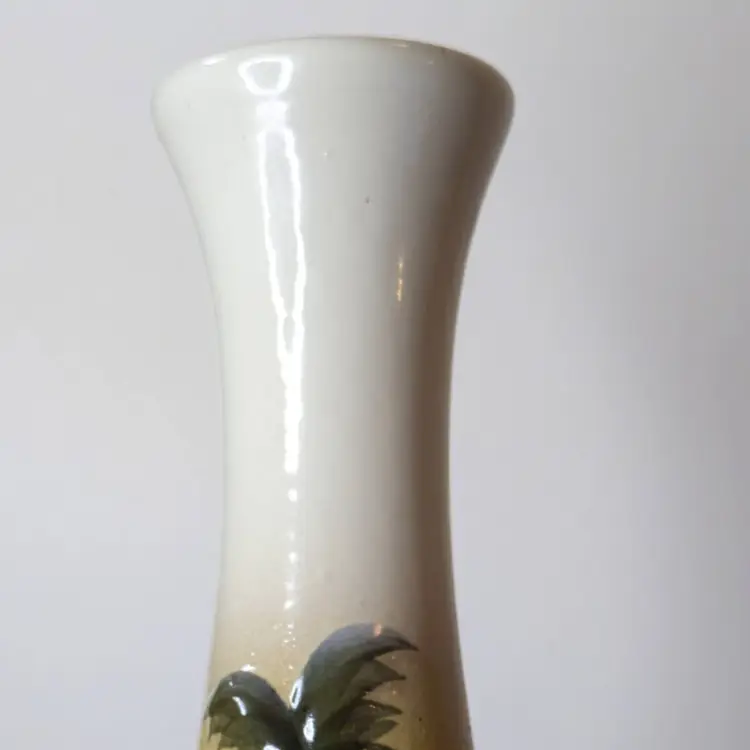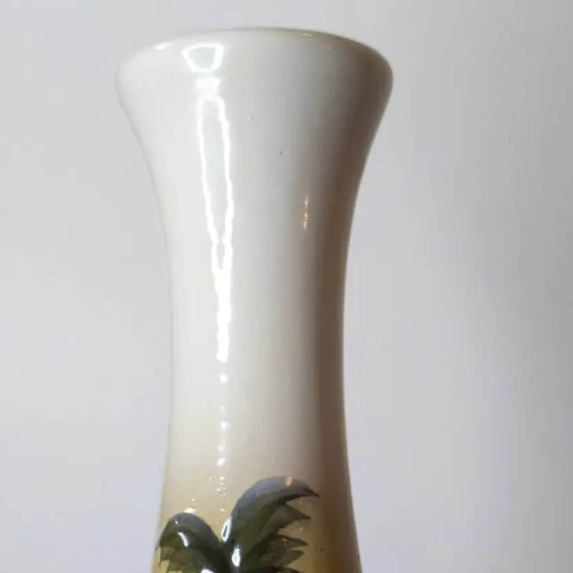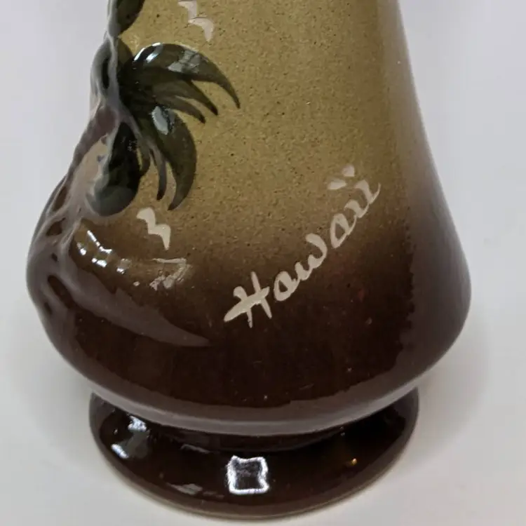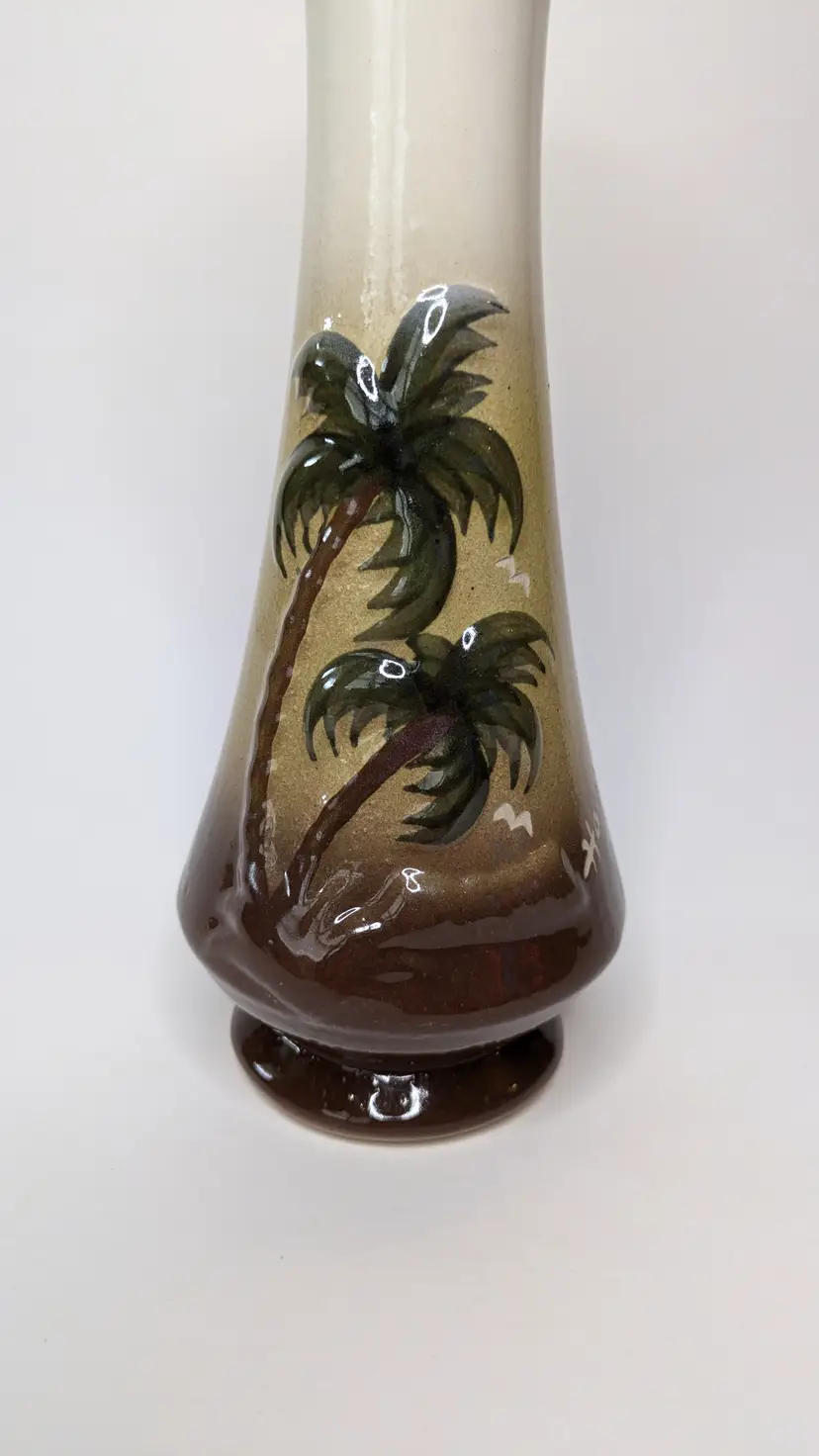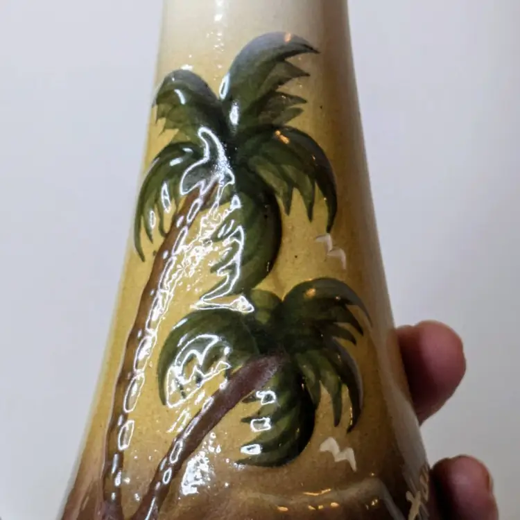 Retro Studio Stoneware vase featuring a hand painted ombre beach scene with mojelica palm trees, sgraffito seagulls & Hawaii logo, glazed interior, stands 8.1/4" tall, flawless like new condition. Makers mark with date present!