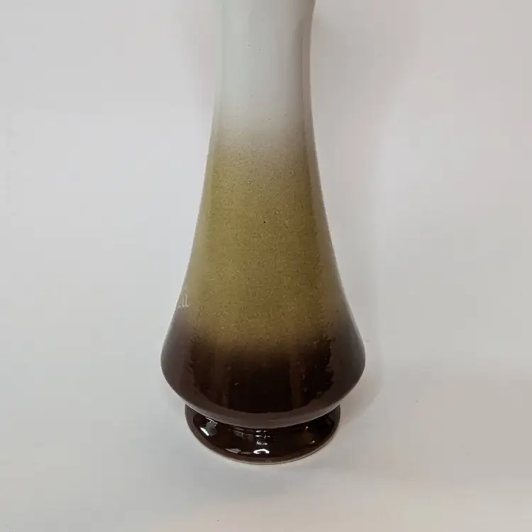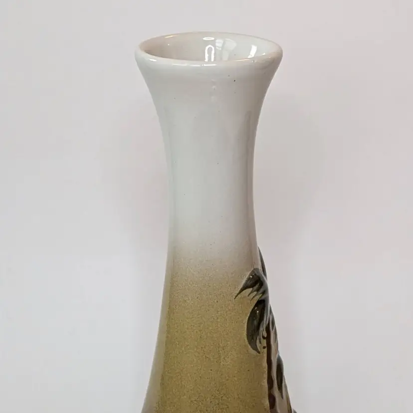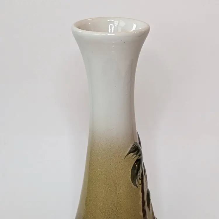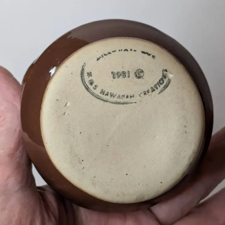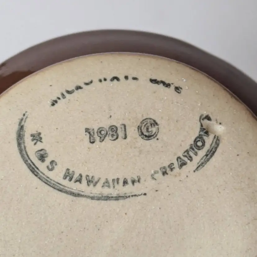 Retro Studio Stoneware vase featuring a hand painted ombre beach scene with mojelica palm trees, sgraffito seagulls & Hawaii logo, glazed interior, stands 8.1/4" tall, flawless like new condition. Makers mark with date present!