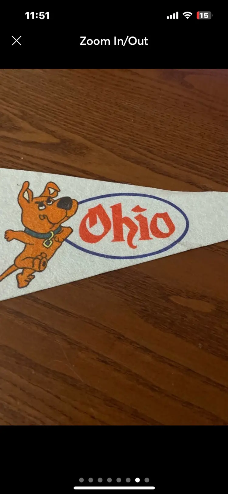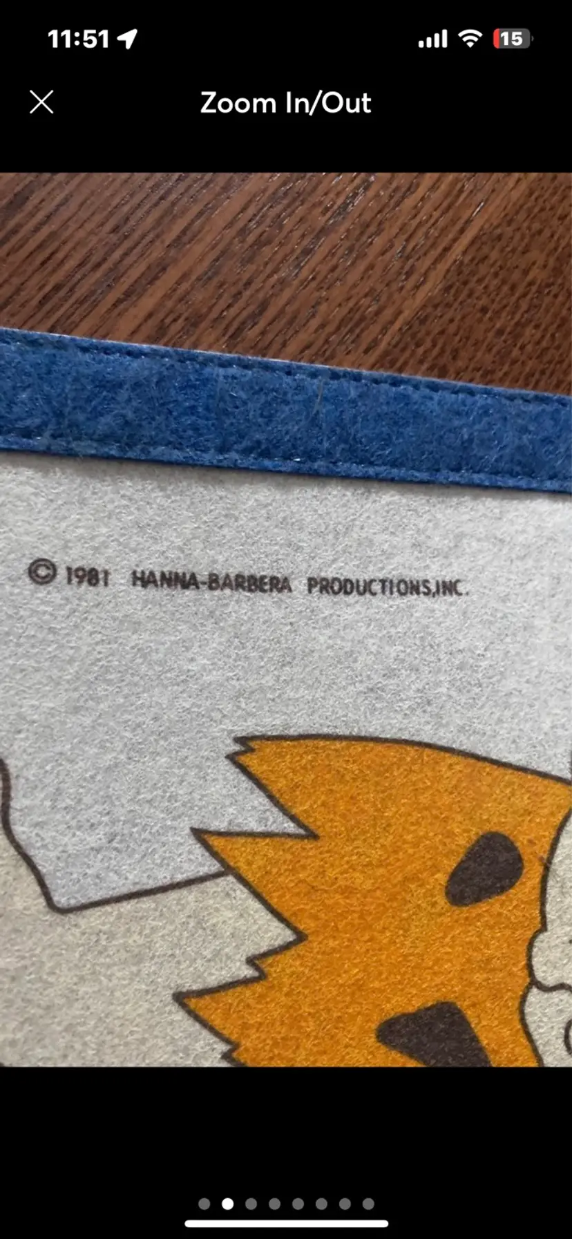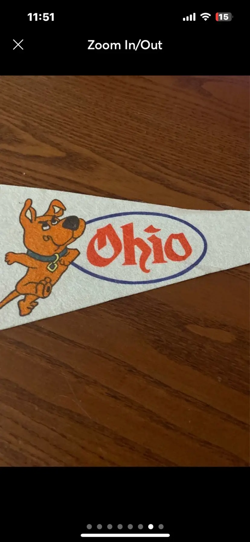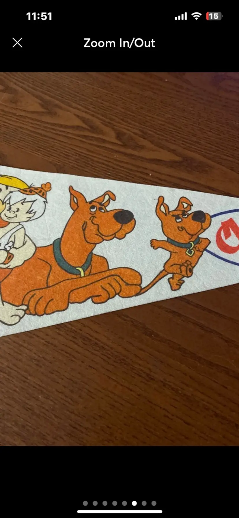 This pennant is in excellent condition, it has been hung and has a couple of thumbtack holes on the skinny end and in the blue felt on the far end, but they are unnoticeable. Features Fred Flintstone and Pebbles, Barney Rubble and Bam Bam and Scooby-Doo and Scrappy. Colors are bright with no fading.