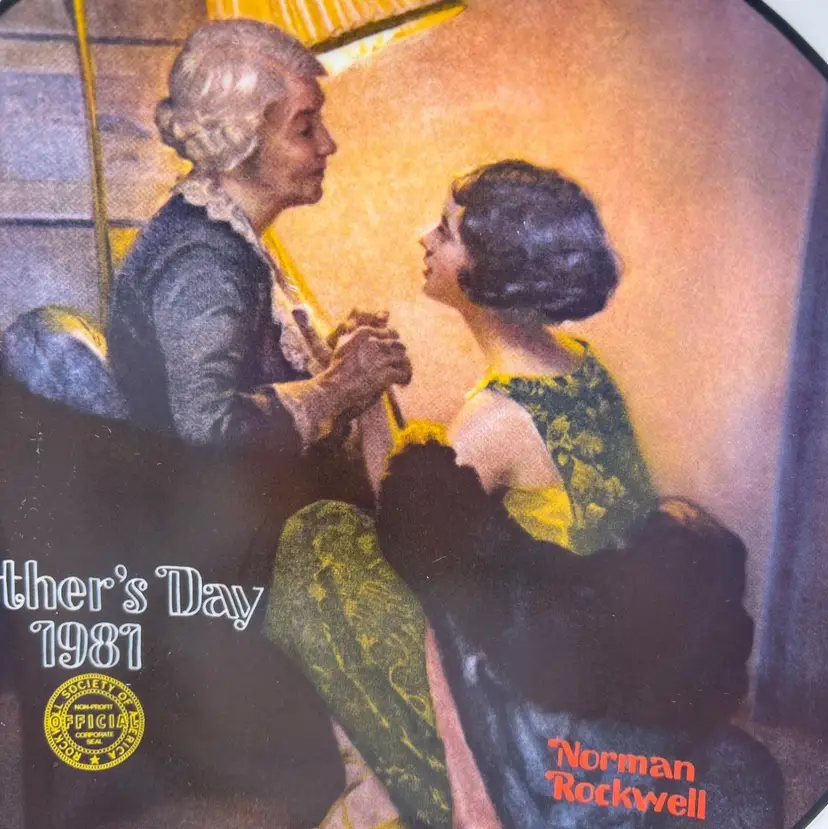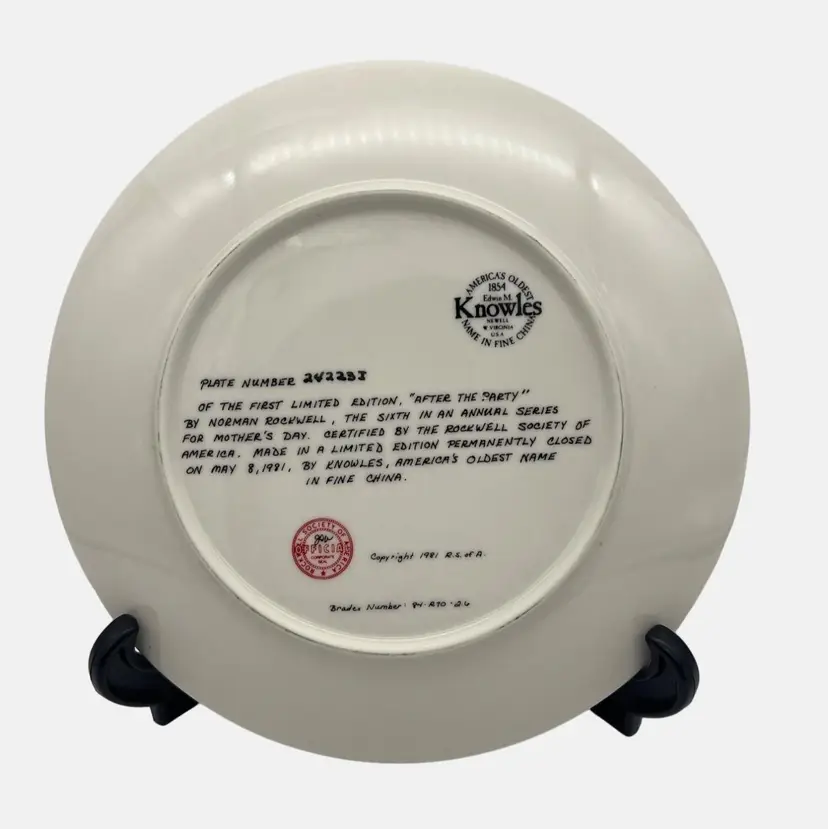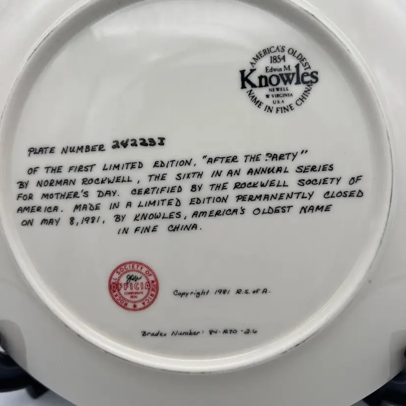 Vintage 1981 Limited Edition Norman Rockwell Mother's Day porcelain collectible plate from Edwin M. Knowles. The title of the painting is "After the Party". The plate measures approximately 8.5" across.