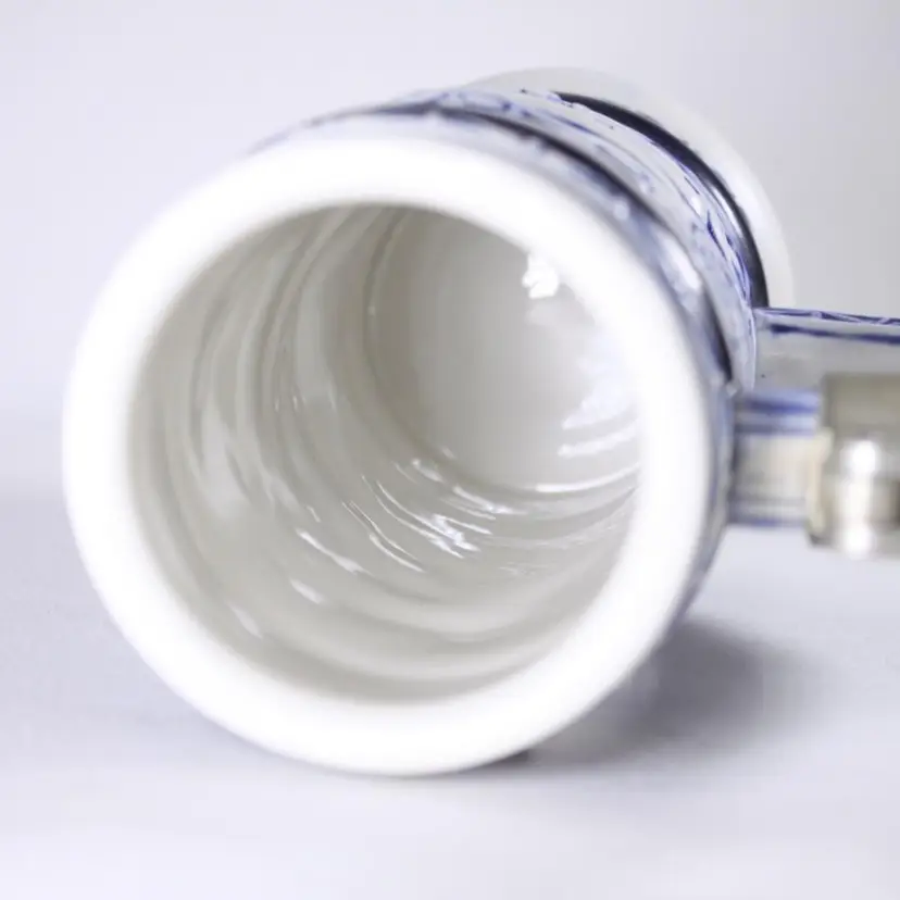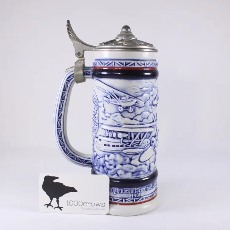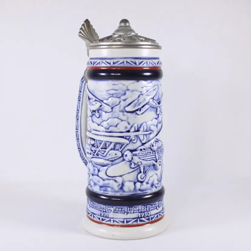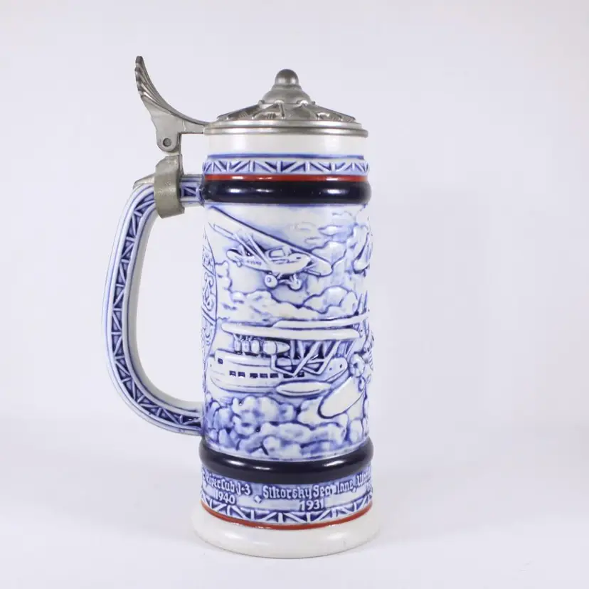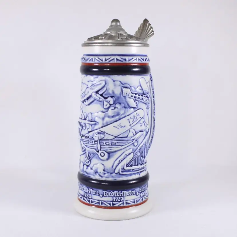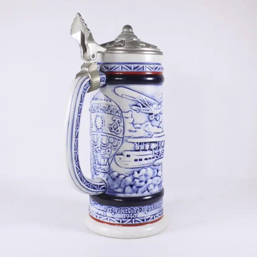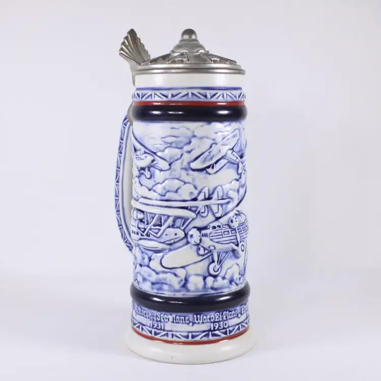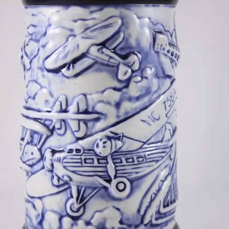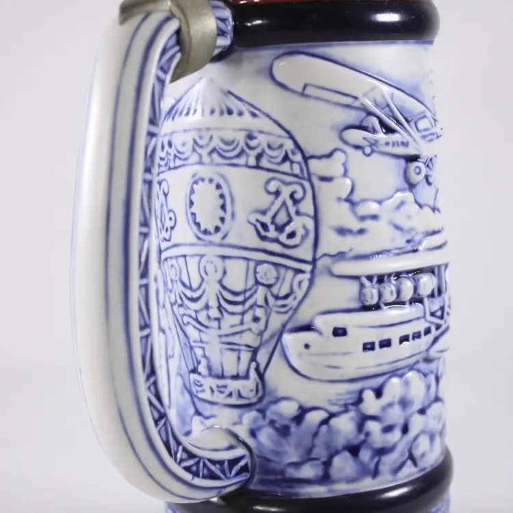 A beautifully handcrafted porcelain tankard, fully in vintage Aviation / air travel theme with a hot air balloon, Wright Bros 1903 double decker, PiperCub V-3 1940, SikorSky Seaplane 1931, Waro Bi-plane 1930, Ford Tri-motor 1927, Bleriot 1909. Most of the aircraft are slightly raised and nicely painted in blues, creating a slight 3D illusion.