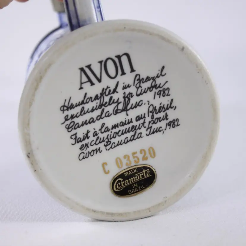Marked underneath AVON, Handcrafted in Brazil exclusively for Avon Canada Inc, 1982. (repeated in French), C 03520 And a sticker for "Ceramarte made in Bazil"
