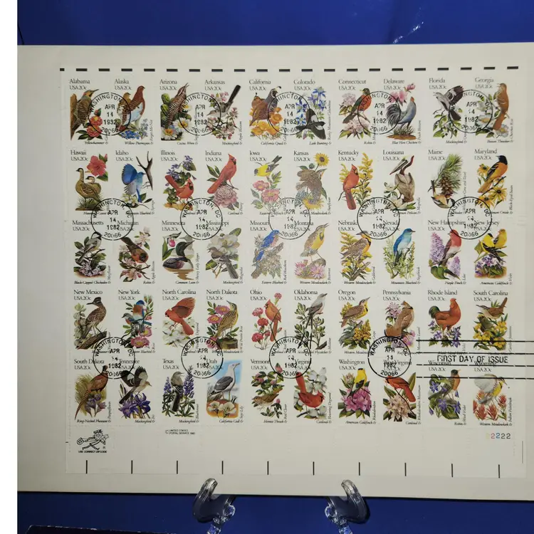 1982 State Birds and Flowers US Postage Stamps All 50 States birds and flowers are represented Canceled stamps for First Day of Issue April 14, 1982 Washington DC Stamps are attached to white envelope Includes booklet featuring father and son designers and their story page1 of description and 1 page of the actual stamps In good condtion