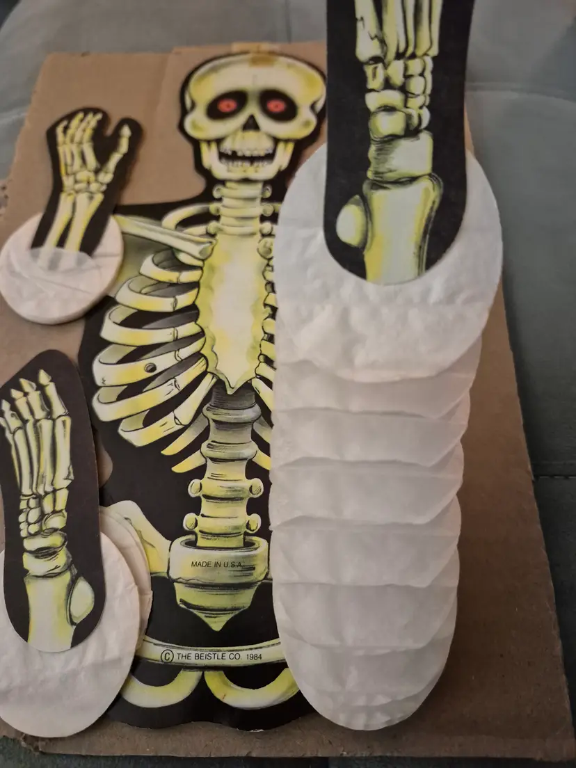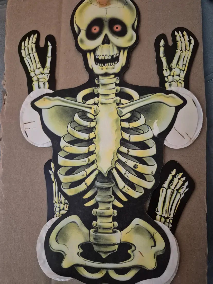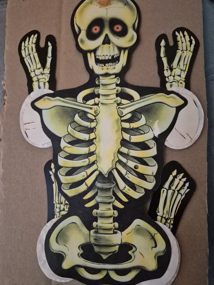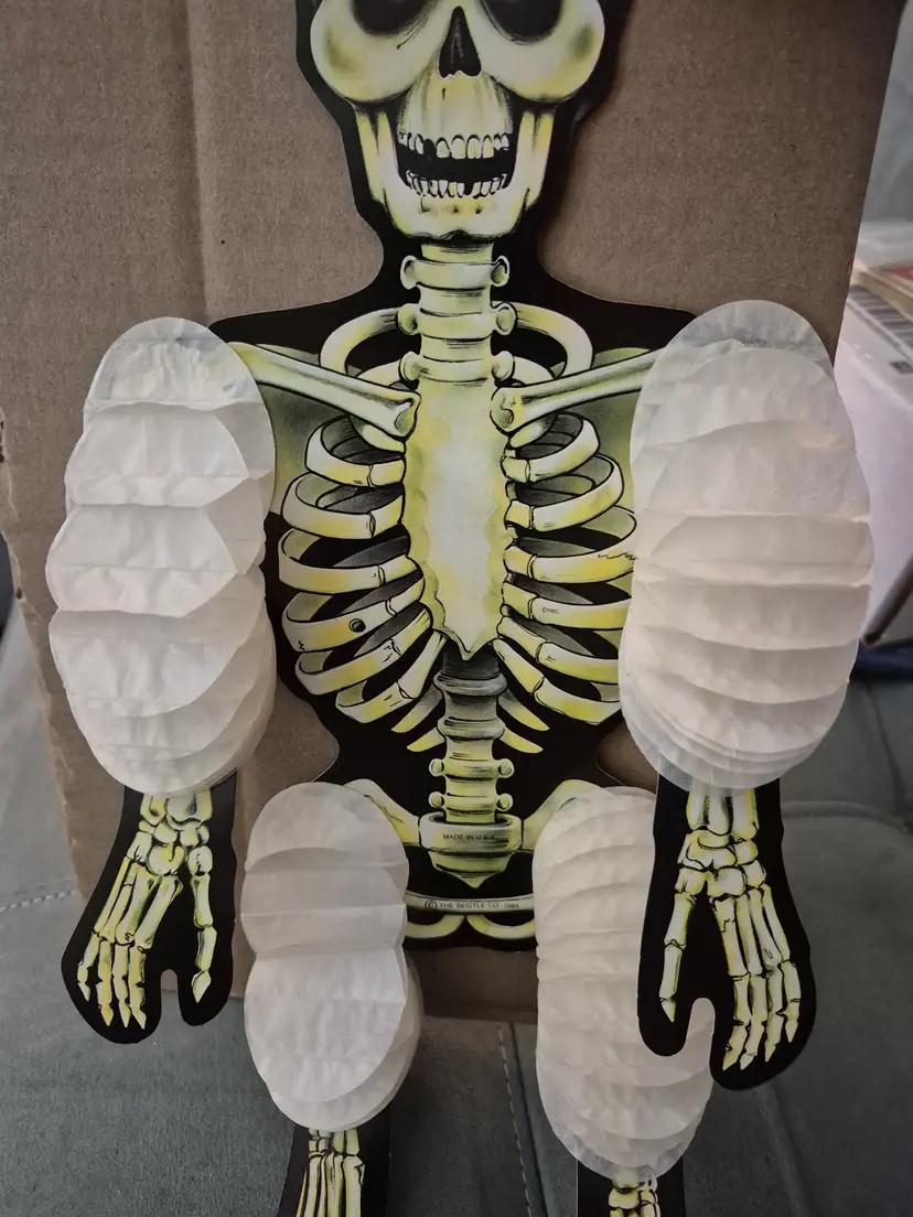 1984 bestle crepe paper skeleton. It is in good condition except for the tape on the head and a rip near the ribs on the back