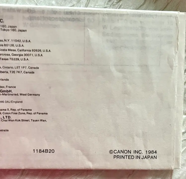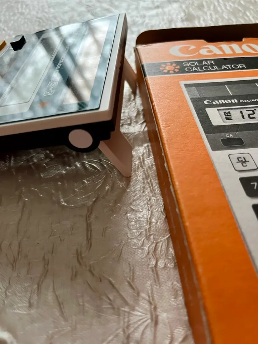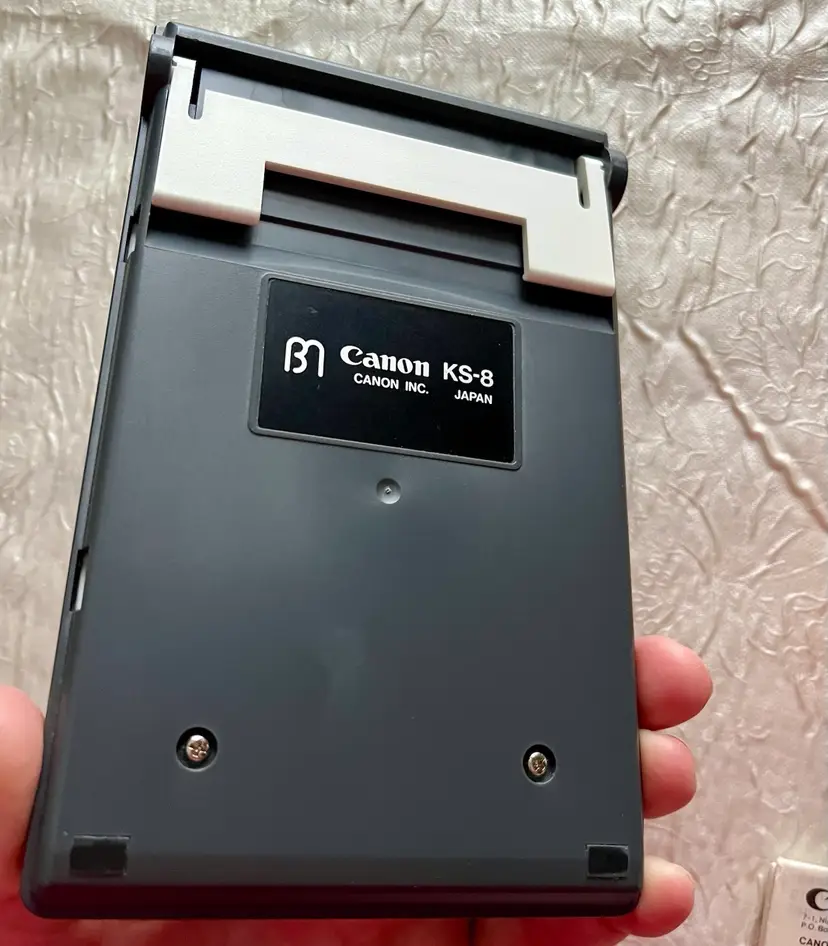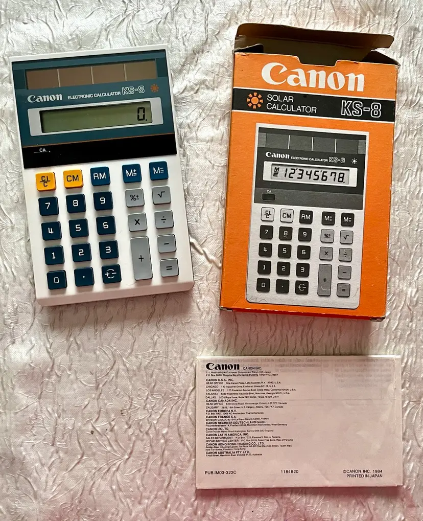 This is a vintage 1984 Canon KS-8 solar calculator from Japan. It comes with its original box and manual. The calculator is in working condition and a video clip of it being used is available. It features the Canon brand and model, and is categorized as a vintage calculator.