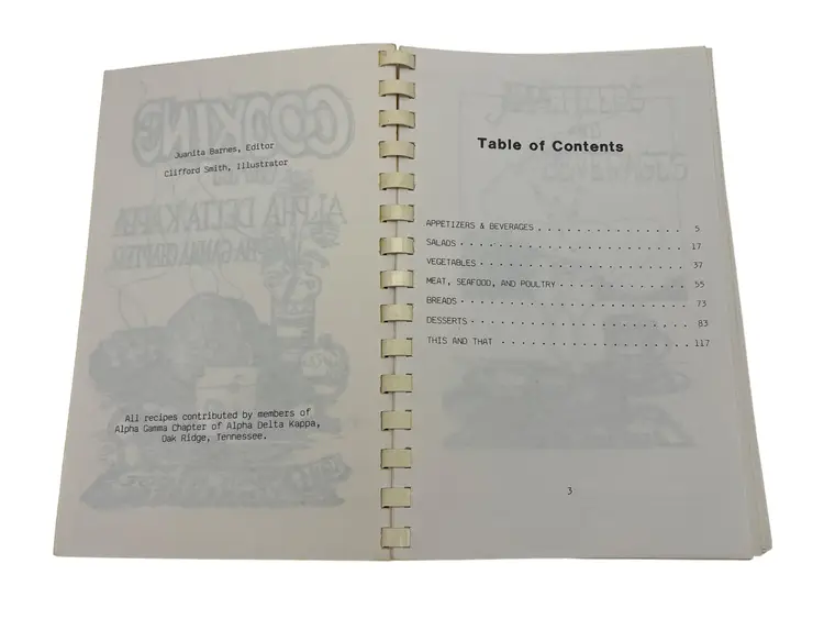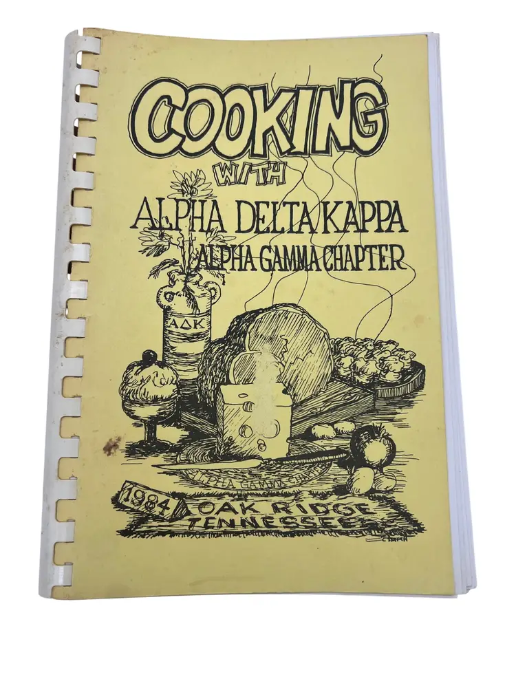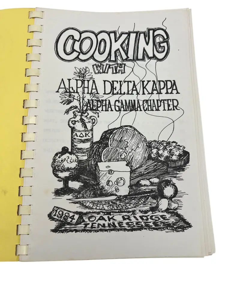 Vintage 1984 spiral-bound community cookbook Cooking with Alpha Delta Kappa (Alpha Gamma chapter, Oak Ridge, Tennessee). 140 numbered pages, 8.5″ × 5.5″. Contains local recipes, index included; illustrated by Clifford Smith. Great addition for collectors of regional cookbooks, women educators' society ephemera, or local cookbook history.