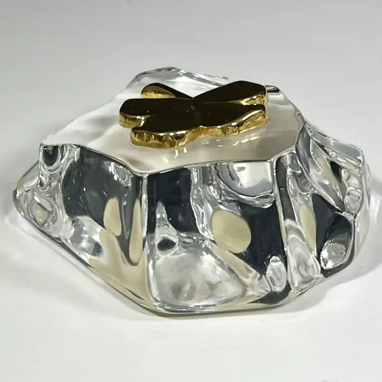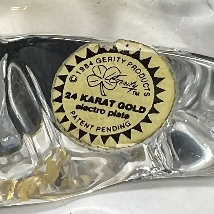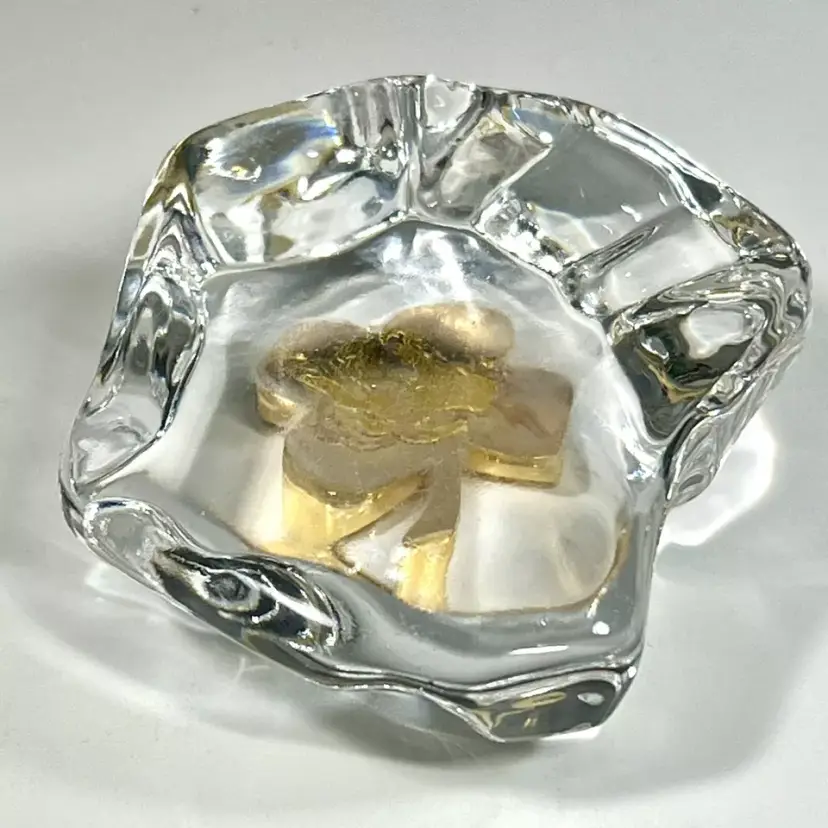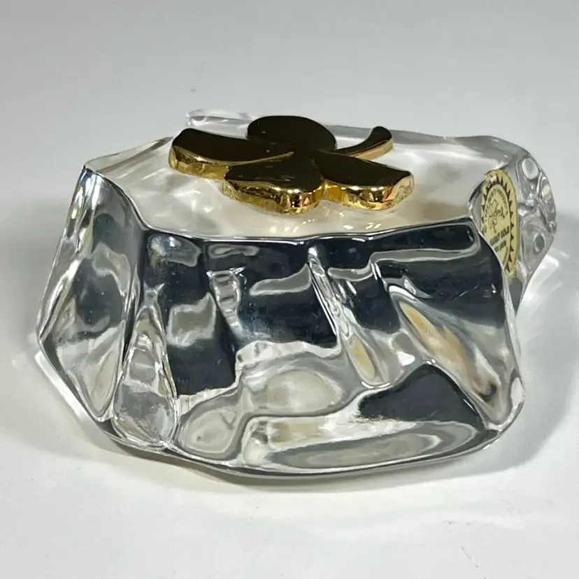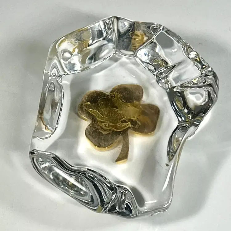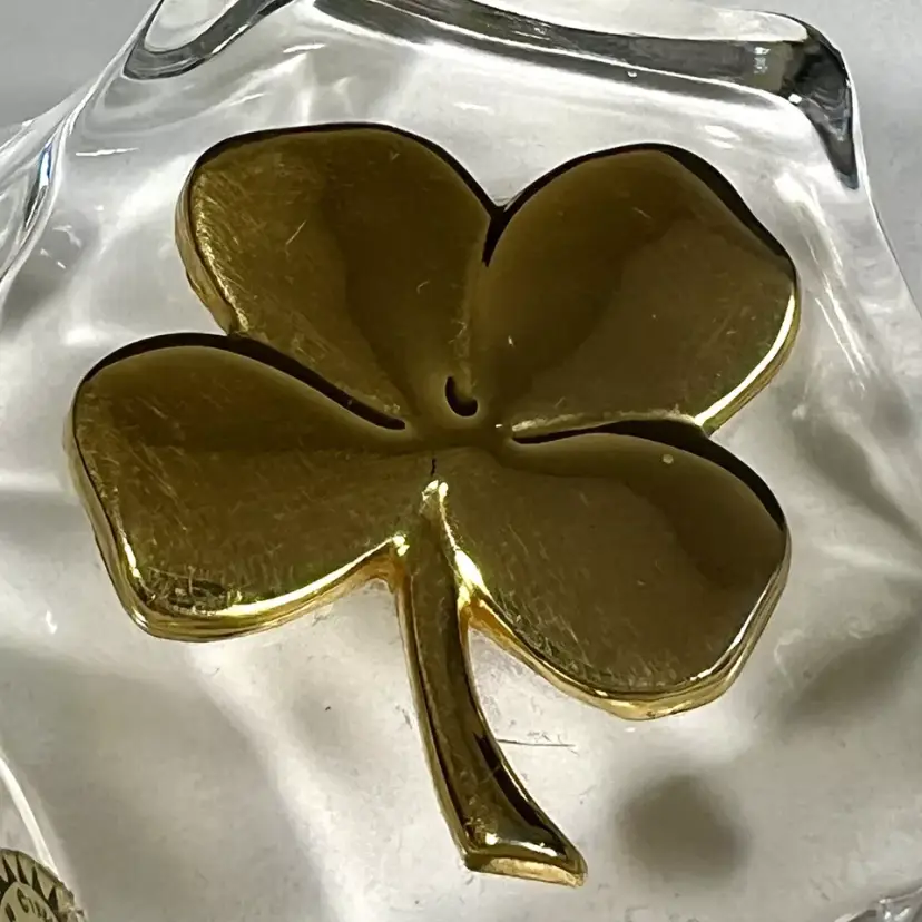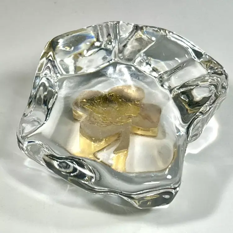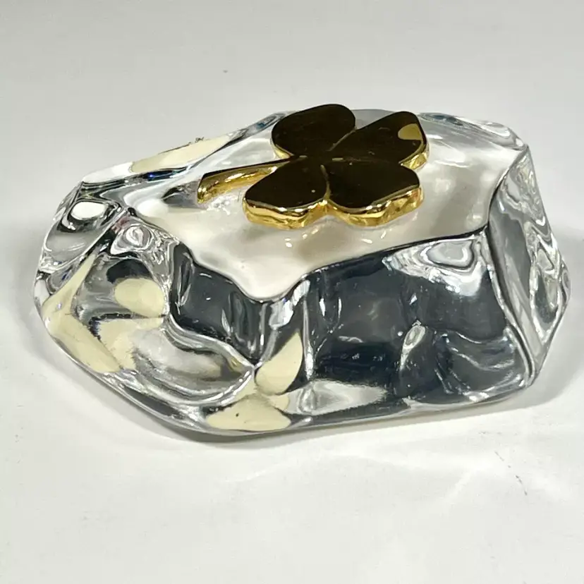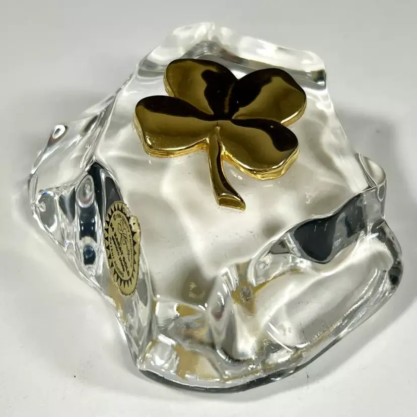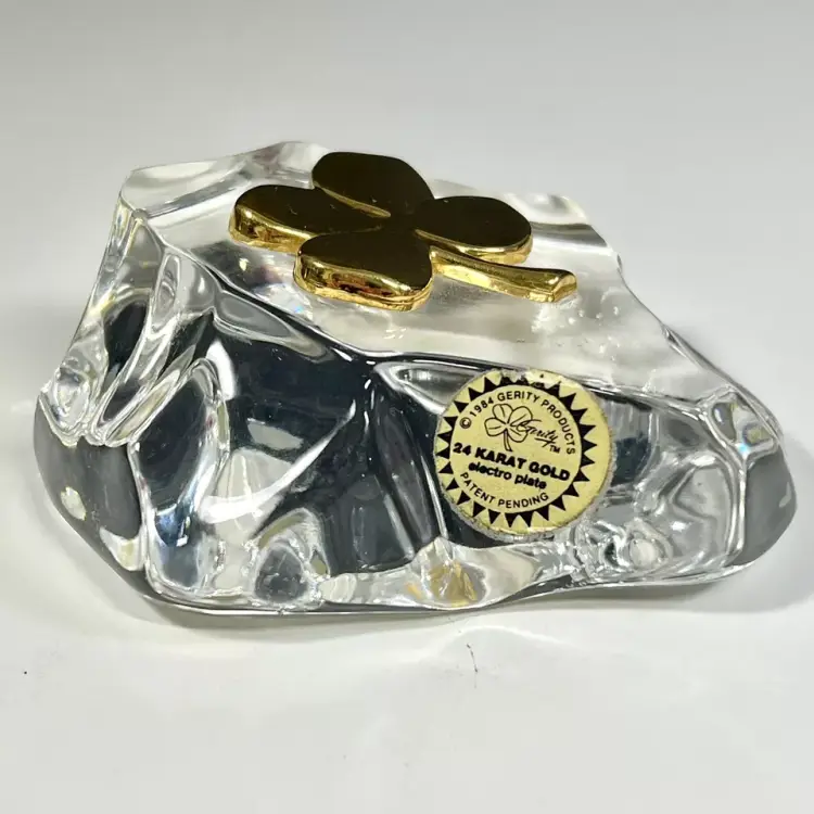 Beautiful Vintage 1984 Gerity Products Crystal Glass Paperweight Decorated With A 24K Gold Electro-Plated 4 Leaf Clover or Shamrock. Clear thick crystal base that looks a rock or boulder with a 24K gold electro-plated 4 leaf clover on the top. Smooth polished bottom. Still has it's original Gerity label on the side.