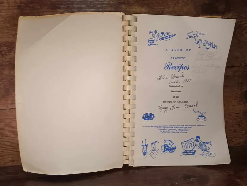 1984 Krewe of Galatea - Book II Sharing Recipes cookbook. There is writing on the inside cover, otherwise in good condition, see photos. It measures approx. 9x6.5 inches.