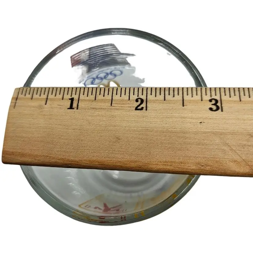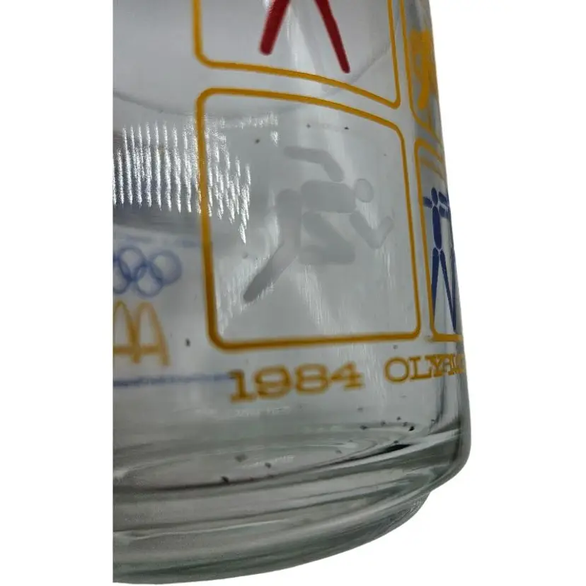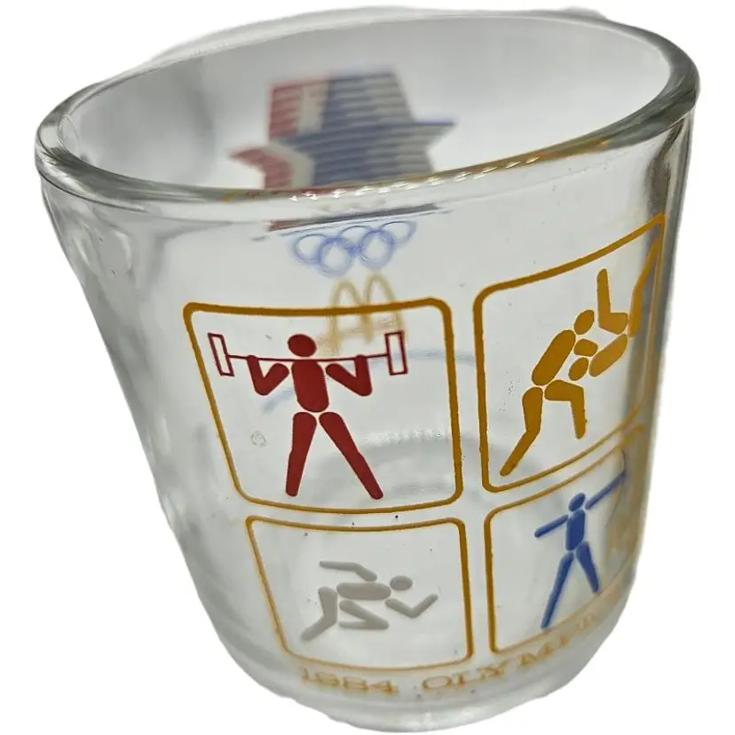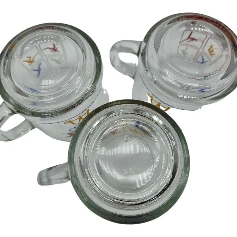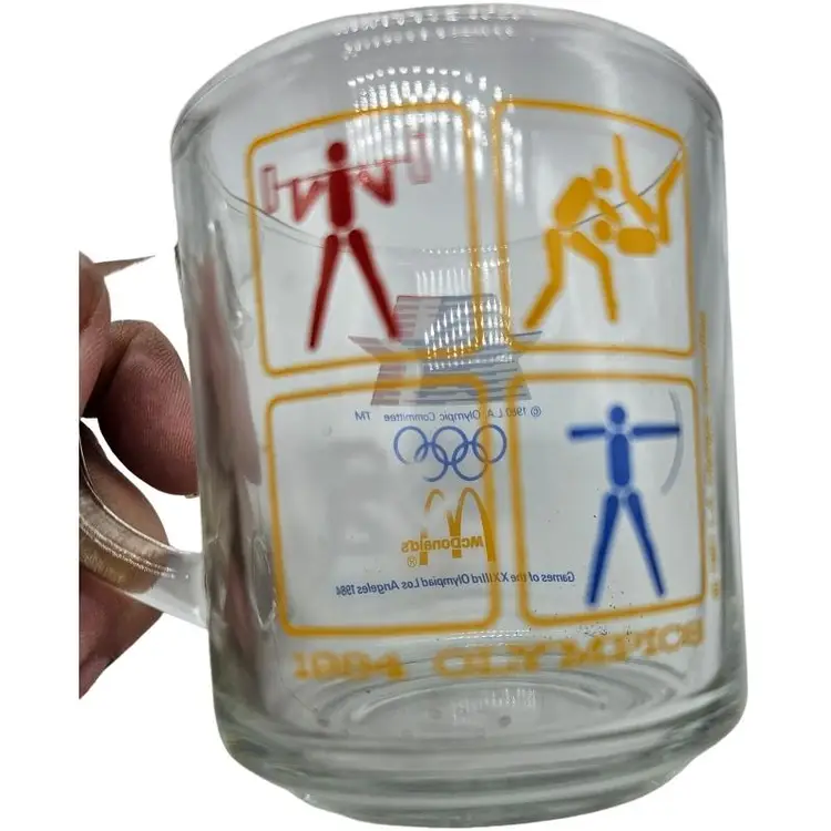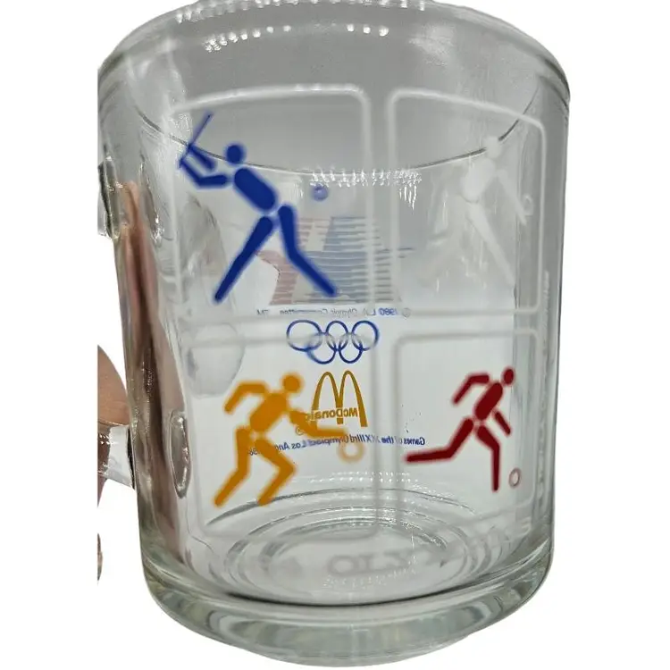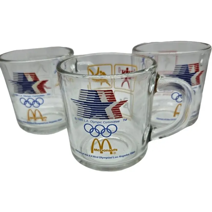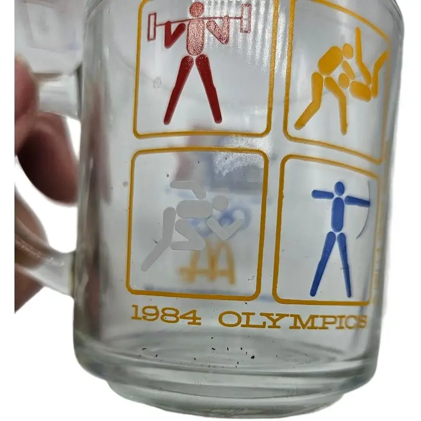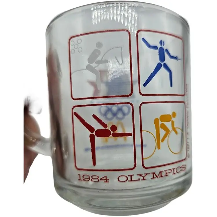 Set of three glass mugs featuring 1984 Olympic sports icons. Perfect for collectors.