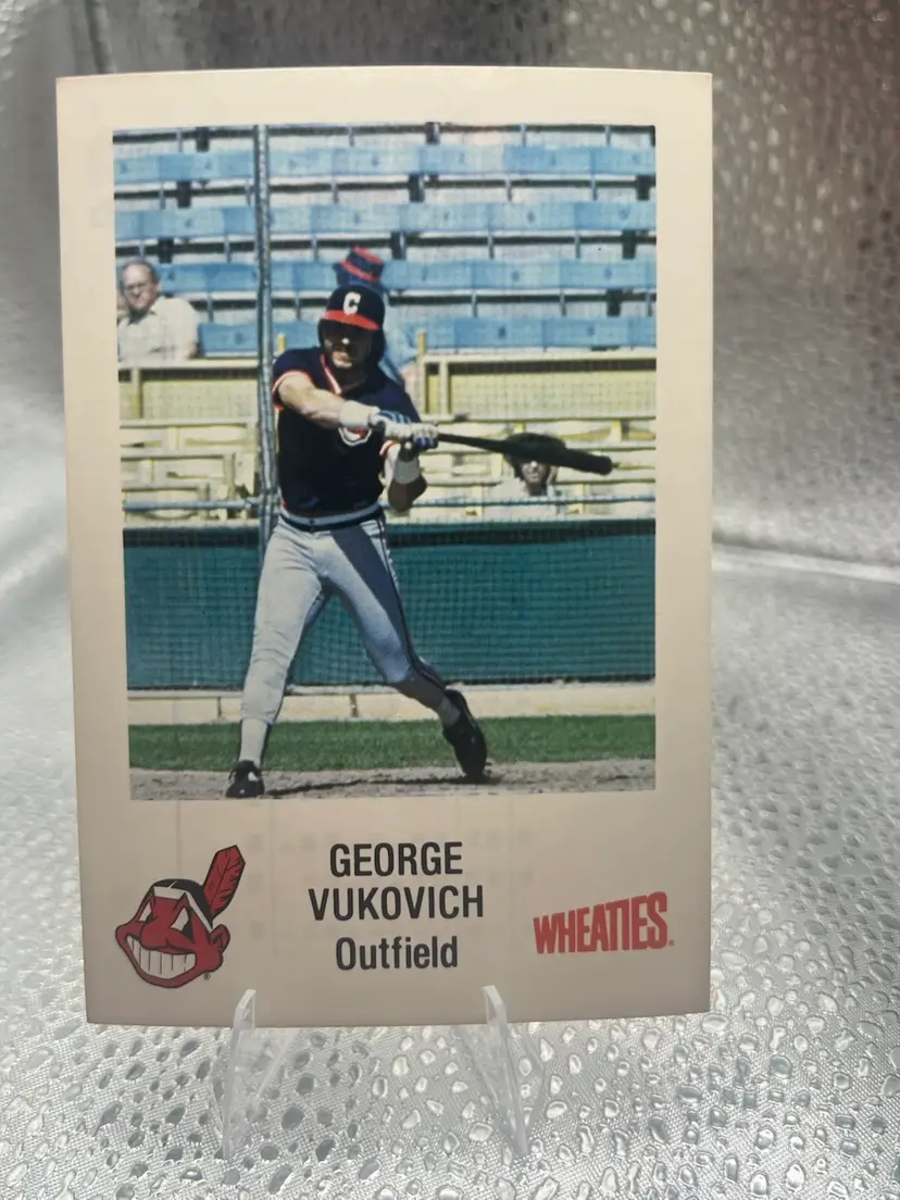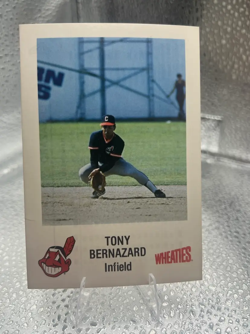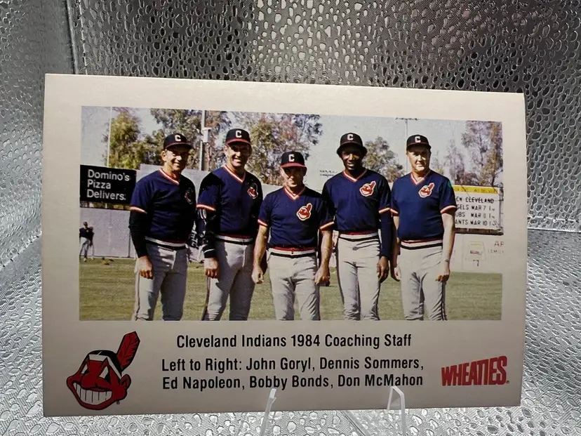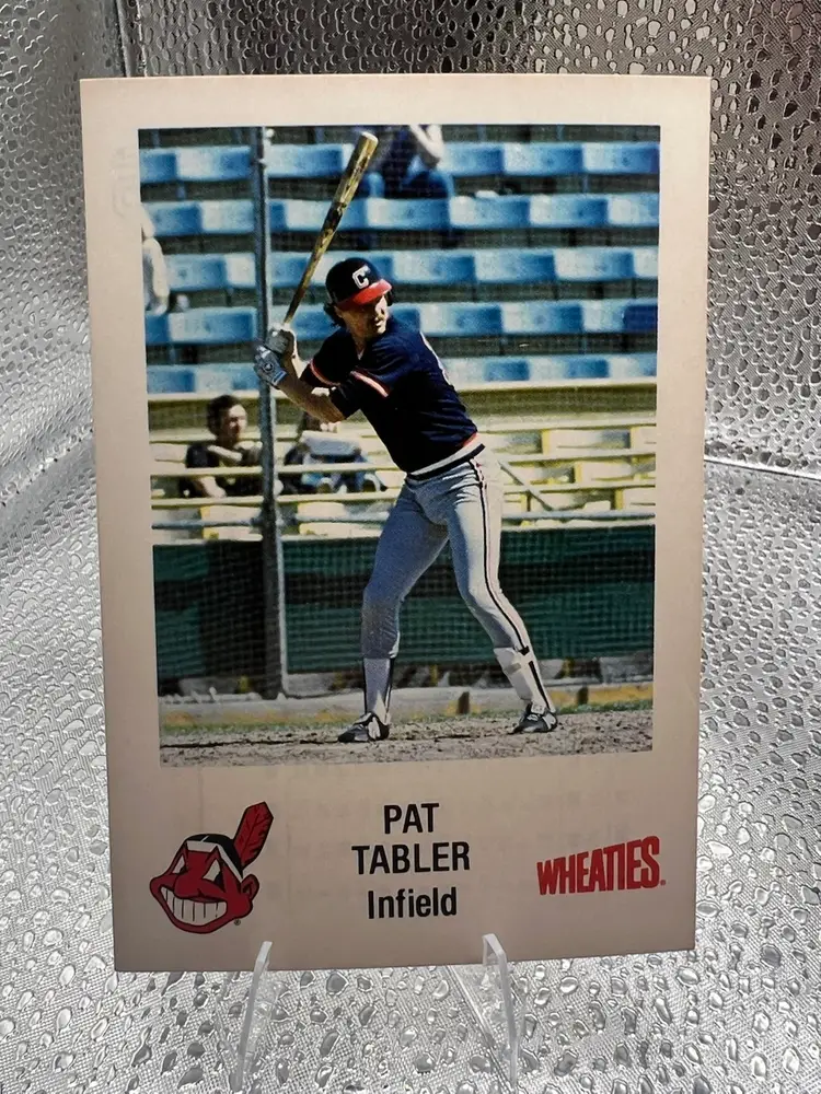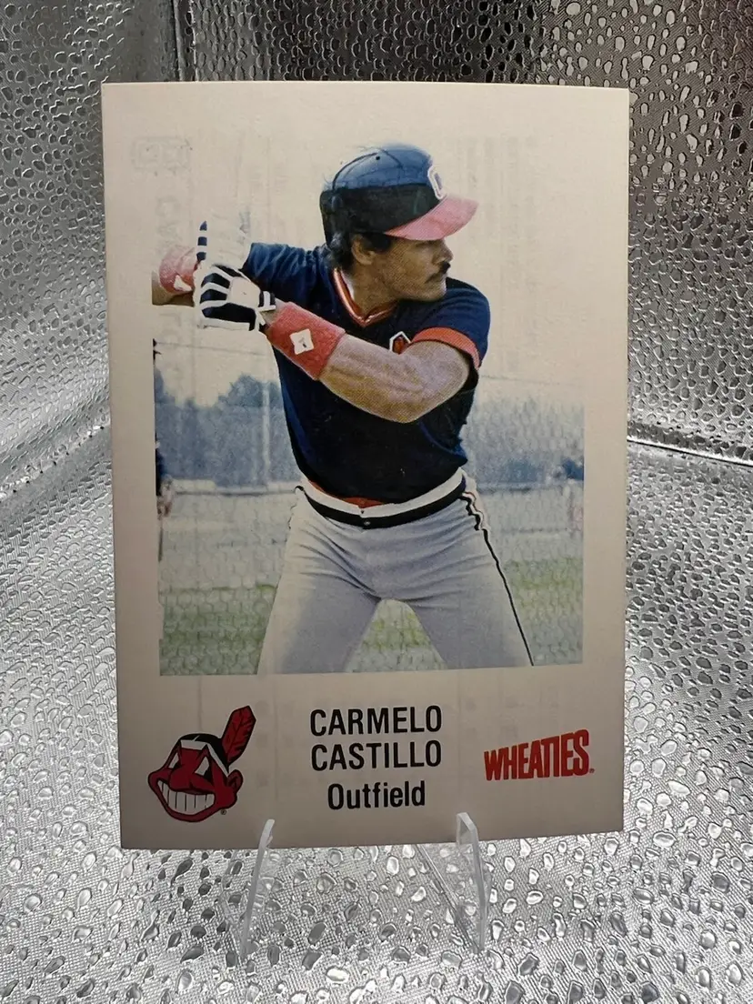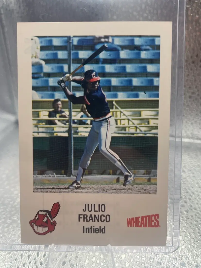 These cards are from the 1984 Wheaties Cleveland Indians set. These were oversized cards (2\text{ }13/16" \times 4\text{ }1/8") distributed as promotional team sets at Cleveland Stadium during "Baseball Card Day." Card Details & Value Set: 1984 Wheaties Cleveland Indians This lot had Joe Carter and Julio Franco.