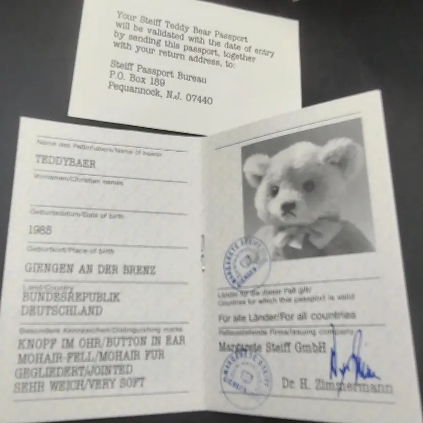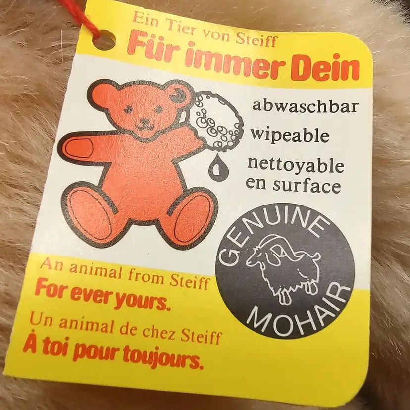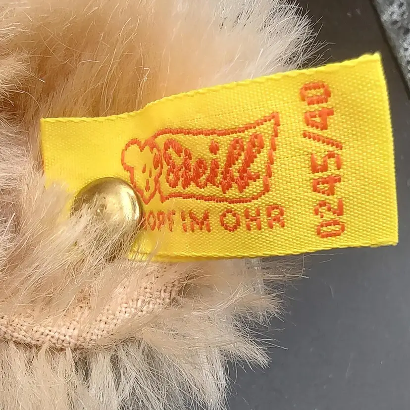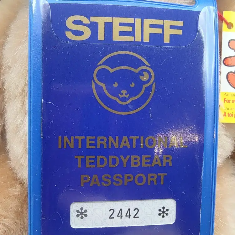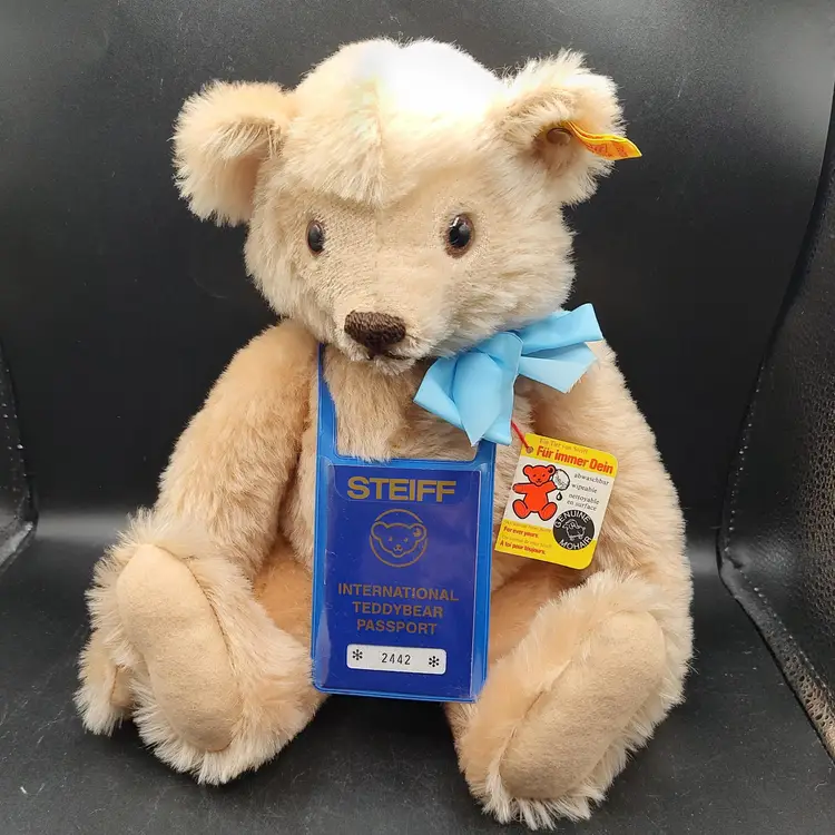 1985 Steiff Mohair International Teddy Bear Passport 14" Blonde Plush Bear, brown eyes, fully jointed, Squeaker . Made in Germany