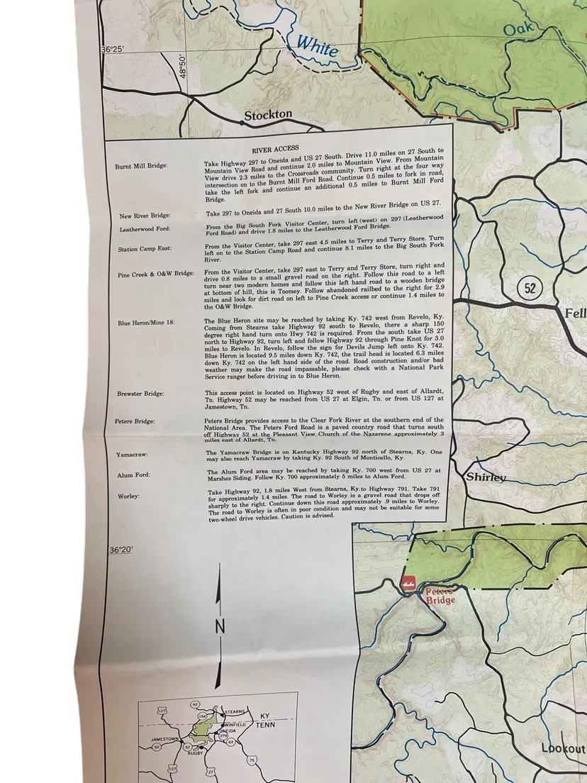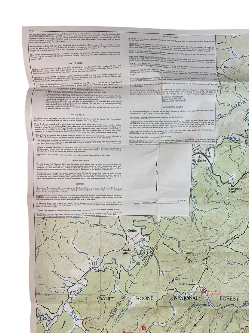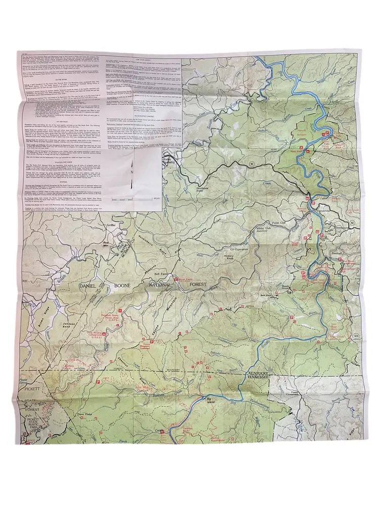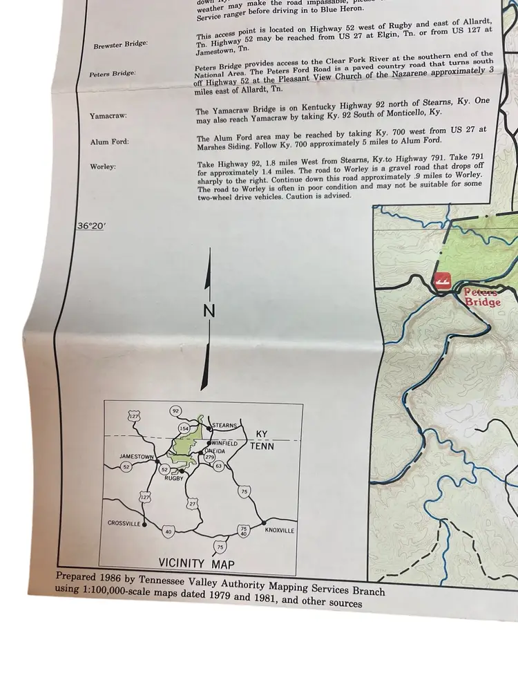 1986 double-sided fold-out trail and river map of the Big South Fork National River and Recreation Area, covering parts of Tennessee and Kentucky. Prepared by the Tennessee Valley Authority Mapping Services Branch using 1:100,000-scale maps dated 1979 and 1981. Map includes trailheads, campsites, picnic areas, river access points, horse and hiking trails, roads, and backcountry camping details. Measures approximately 28" x 31.5" when unfolded.
