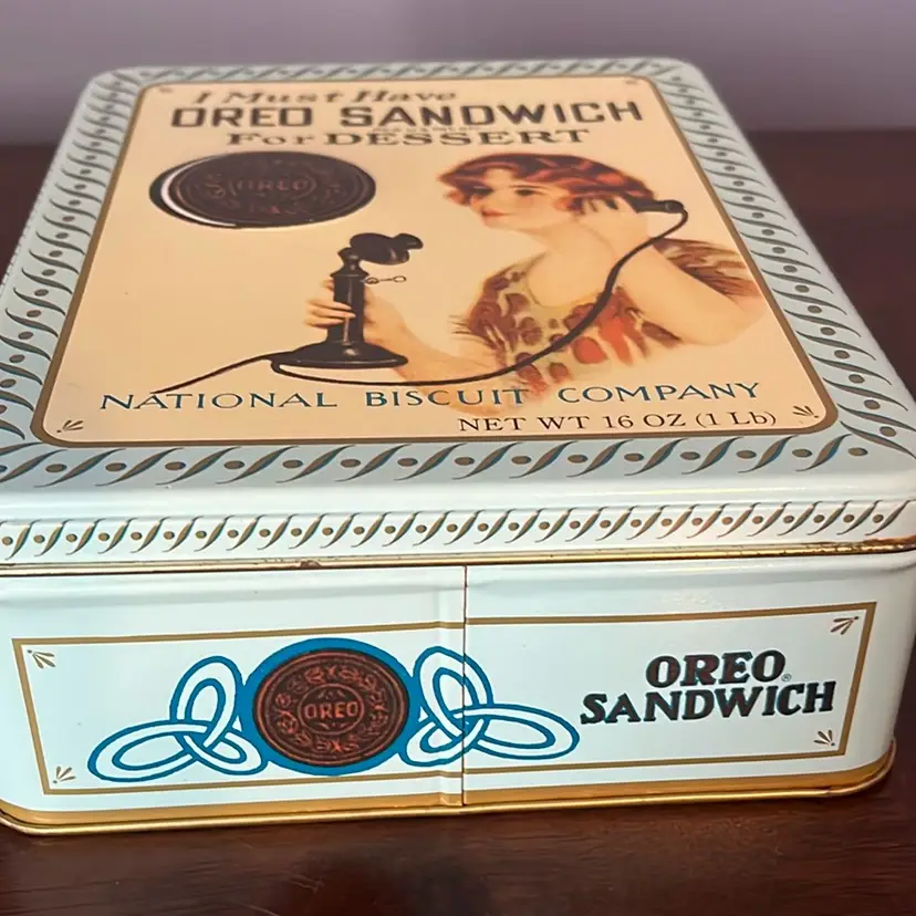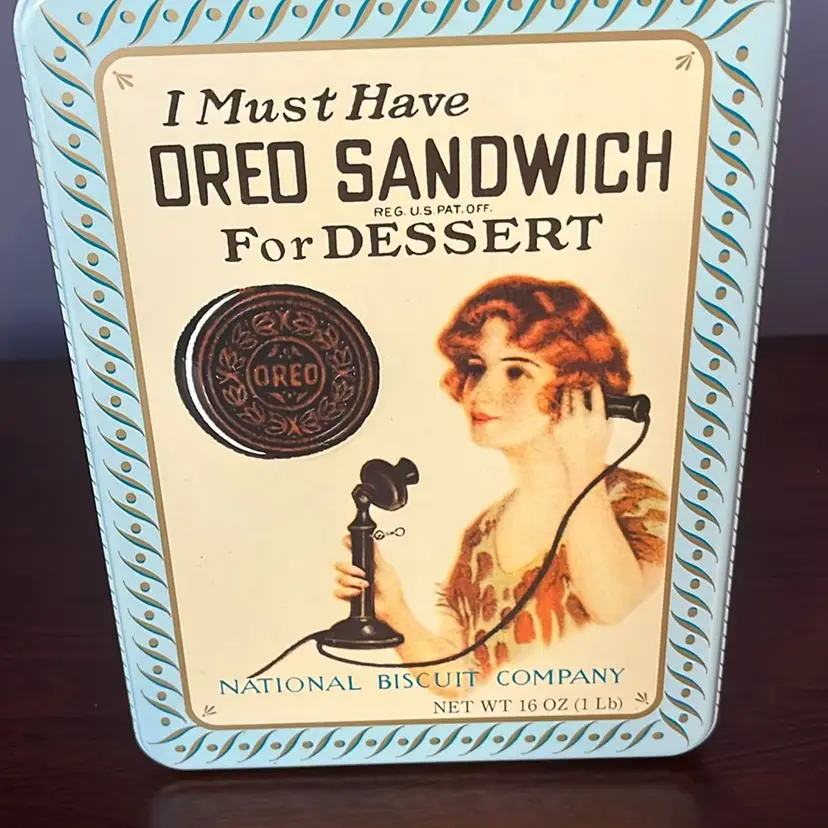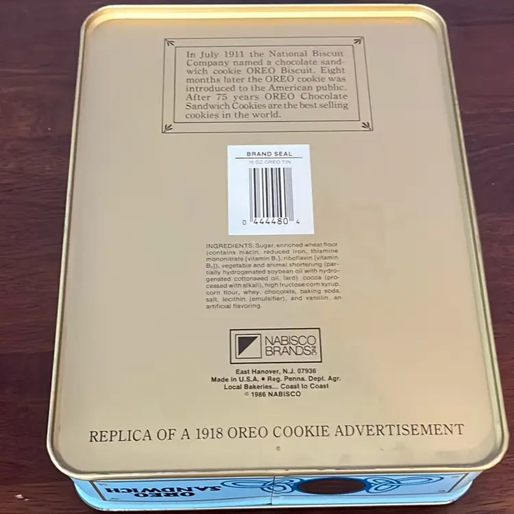 This particular tin is a reproduction of an iconic 1918 design, manufactured in 1986. While it captures the vintage appeal of early Oreo advertising, it is not an original artifact from the specified historical period. Such tins are often produced as collectibles for fans of the brand or for decorative purposes, celebrating the cookie's long history and cultural impact.