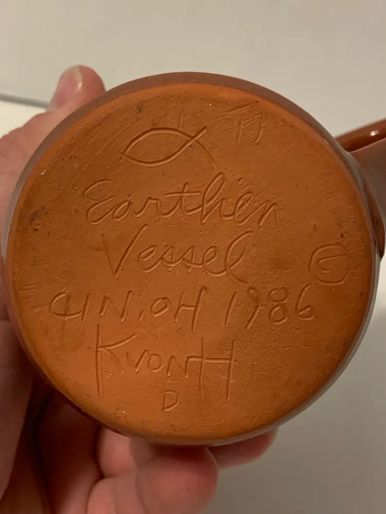 Cincinnati redware pottery. Just under 5” tall. In good condition