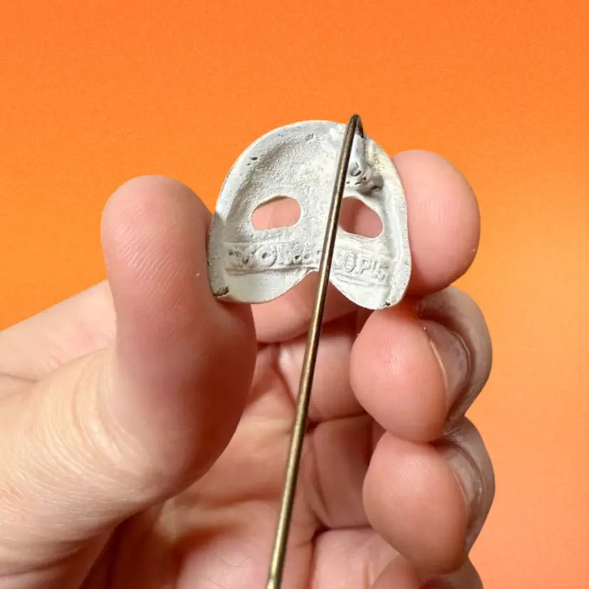 Pin is 2.25” long total. Mask is .75”x.75”. Stick pin with the phantom mask, made of metal and painted white. Stamped on backside. Comes with original packaging.