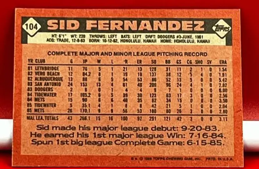 Hello, what we have is a Collector Trading Card by: Topps. Year: 1986. Series: Topps. Player: Sid Fernandez. Number: 104. Team: Mets.