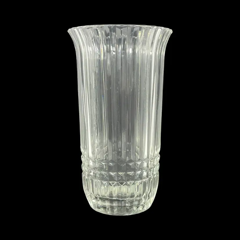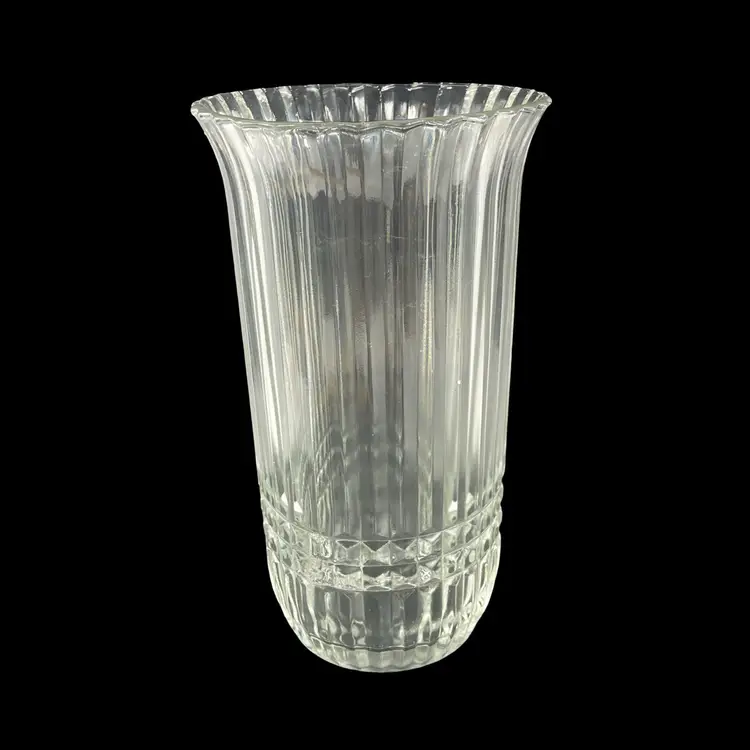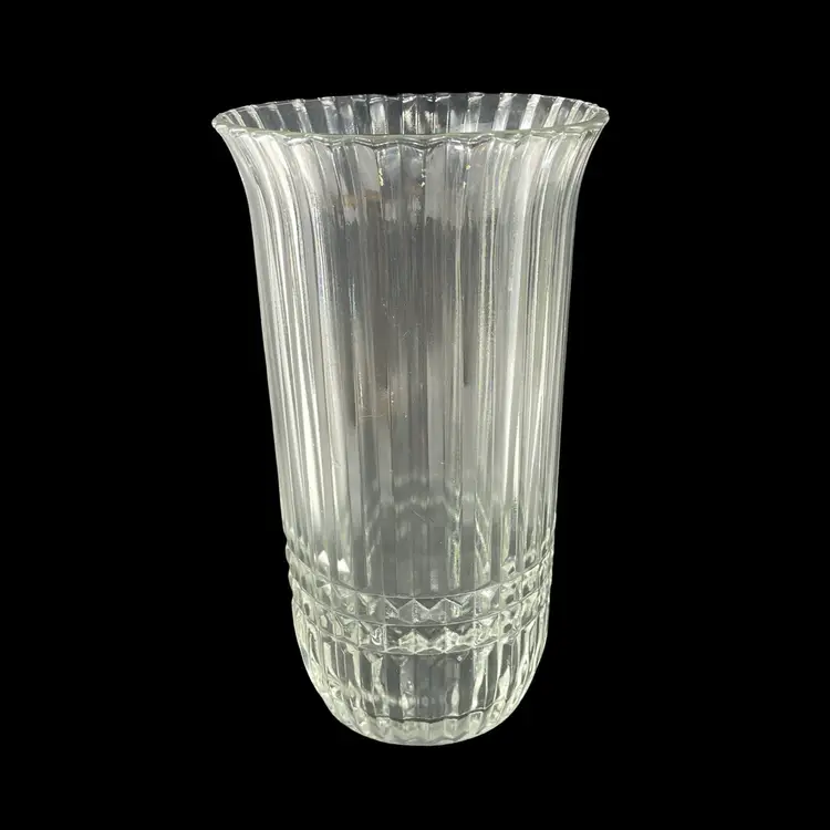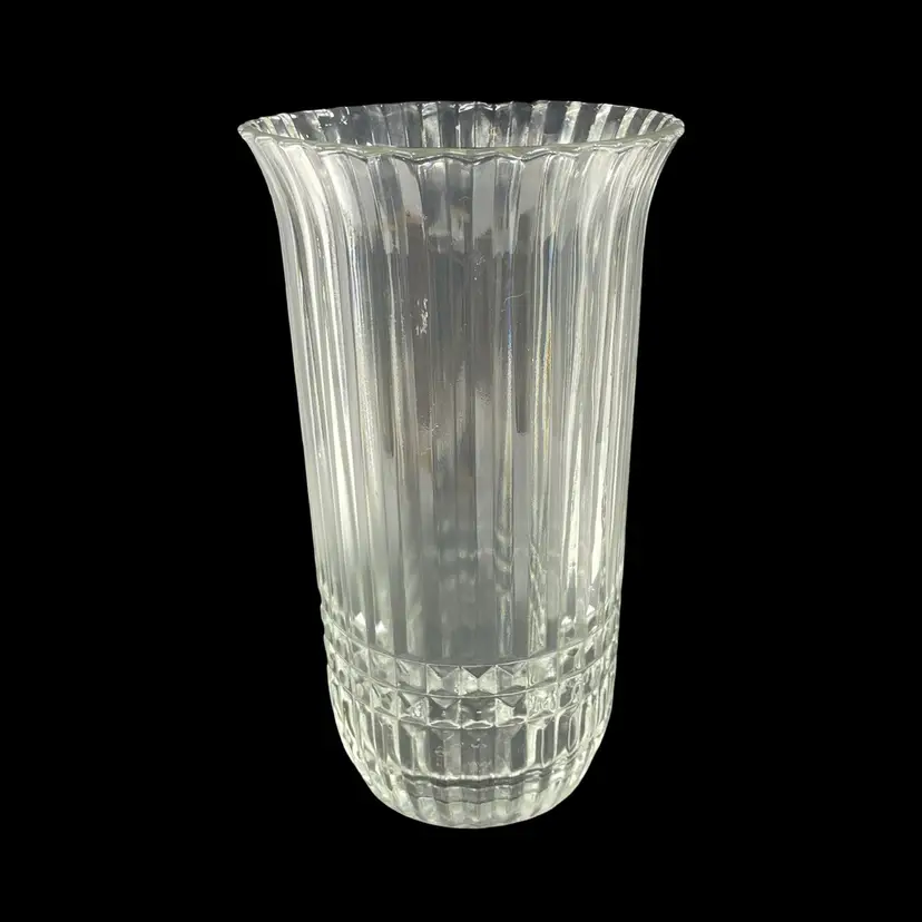This classic vintage vase, marked FTDA 1986 on the bottom, stands 10 inches tall with a 5-inch wide opening, making it a striking piece for any floral arrangement or decorative display. The vase features a beautiful ribbed design with vertical lines that accentuate its timeless elegance, while the textured band around the base adds an extra touch of sophistication. Crafted from clear glass, this vase seamlessly complements a variety of decor styles, from vintage to contemporary. Ideal for flowers, candles, or as a standalone statement piece, this vase is both versatile and collectible—a must-have for vintage glass enthusiasts or anyone looking to add a touch of 1980s charm to their space.