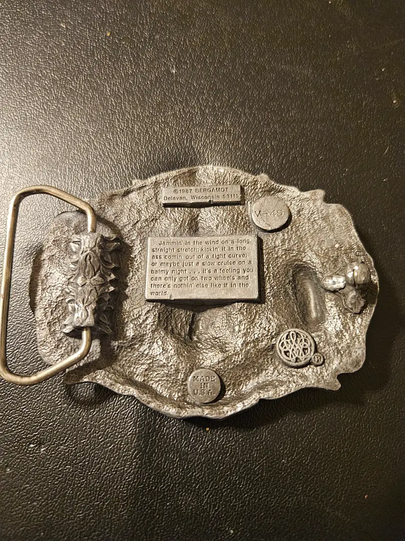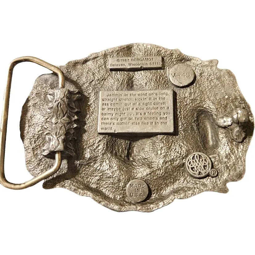 Perfect for adding a touch of retro flair to any outfit, this Bergamot belt buckle is a distinctive piece for motorcycle enthusiasts.