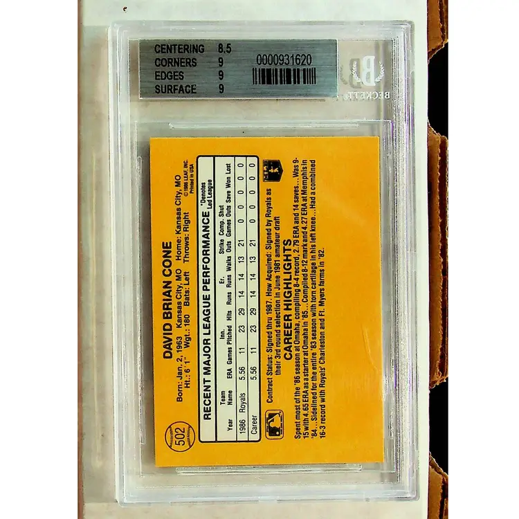 1987 Donruss David Cone #502 - BGS 9 (MINT) - Cert#0000931620 Centering: 8.5 Corners: 9 Edges: 9 Surface: 9