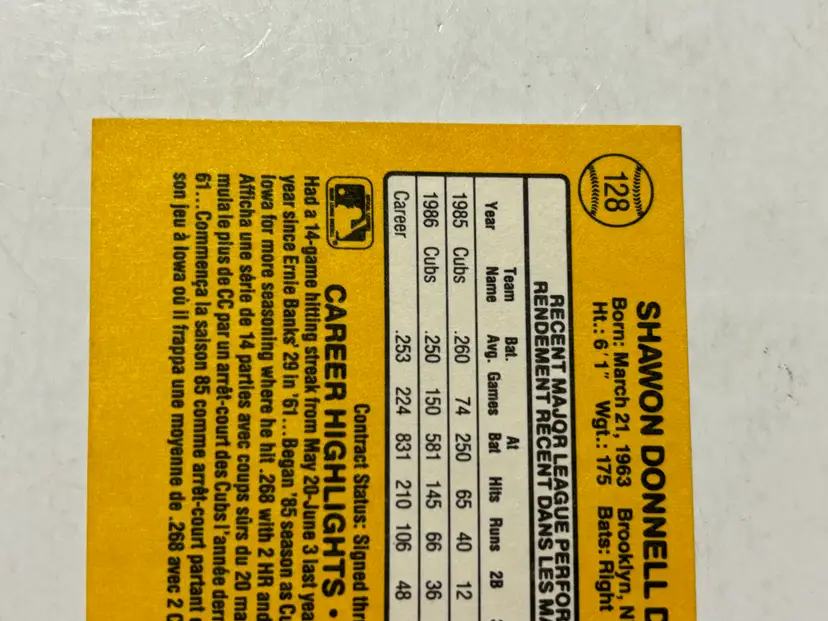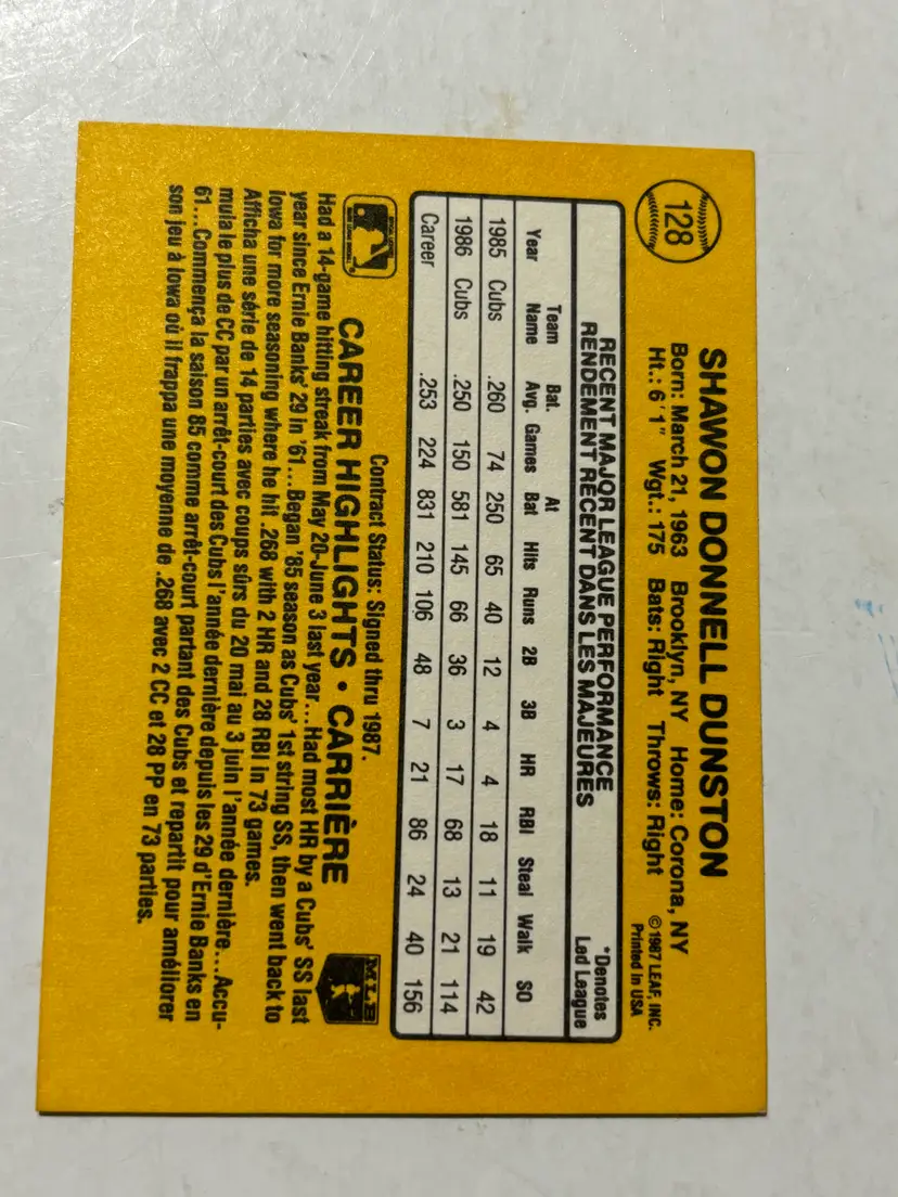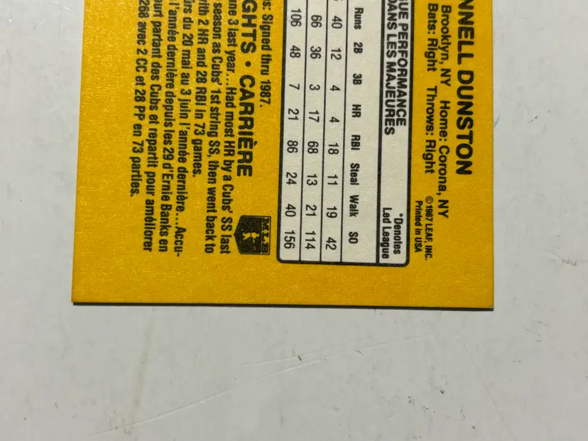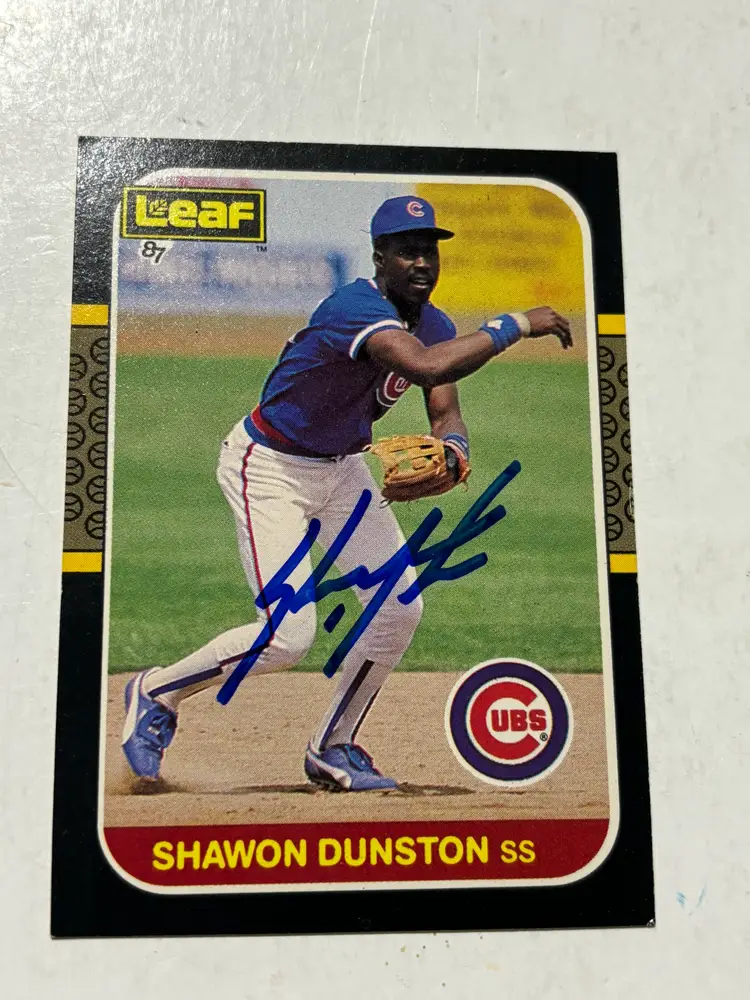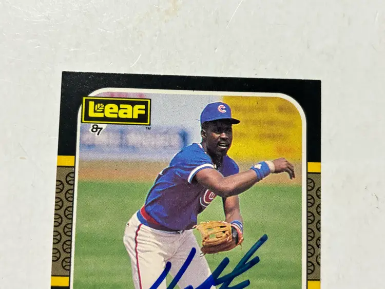 This 1987 Leaf baseball card is signed and blue sharpie. Corners and edges are shown in photographs.
