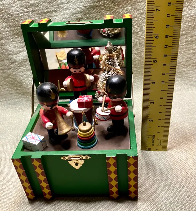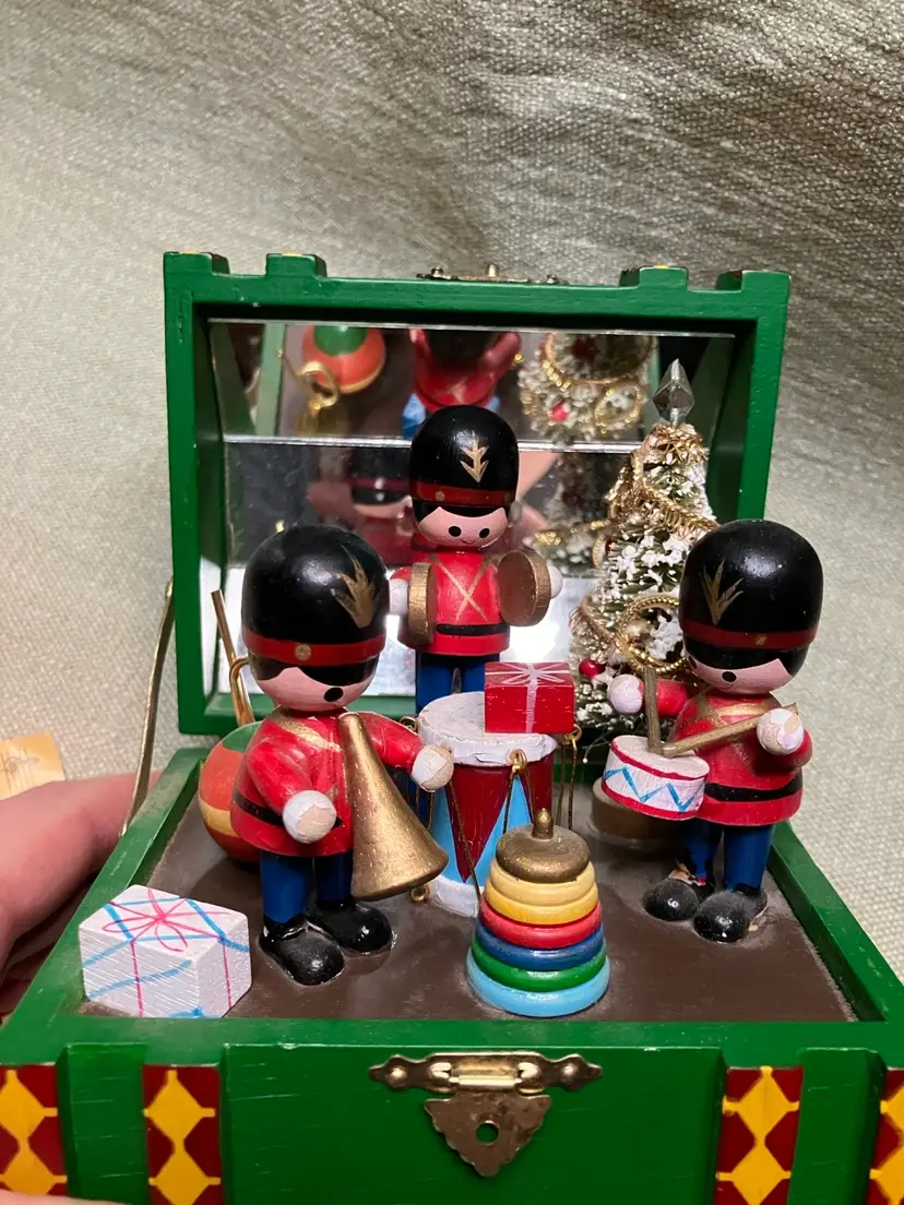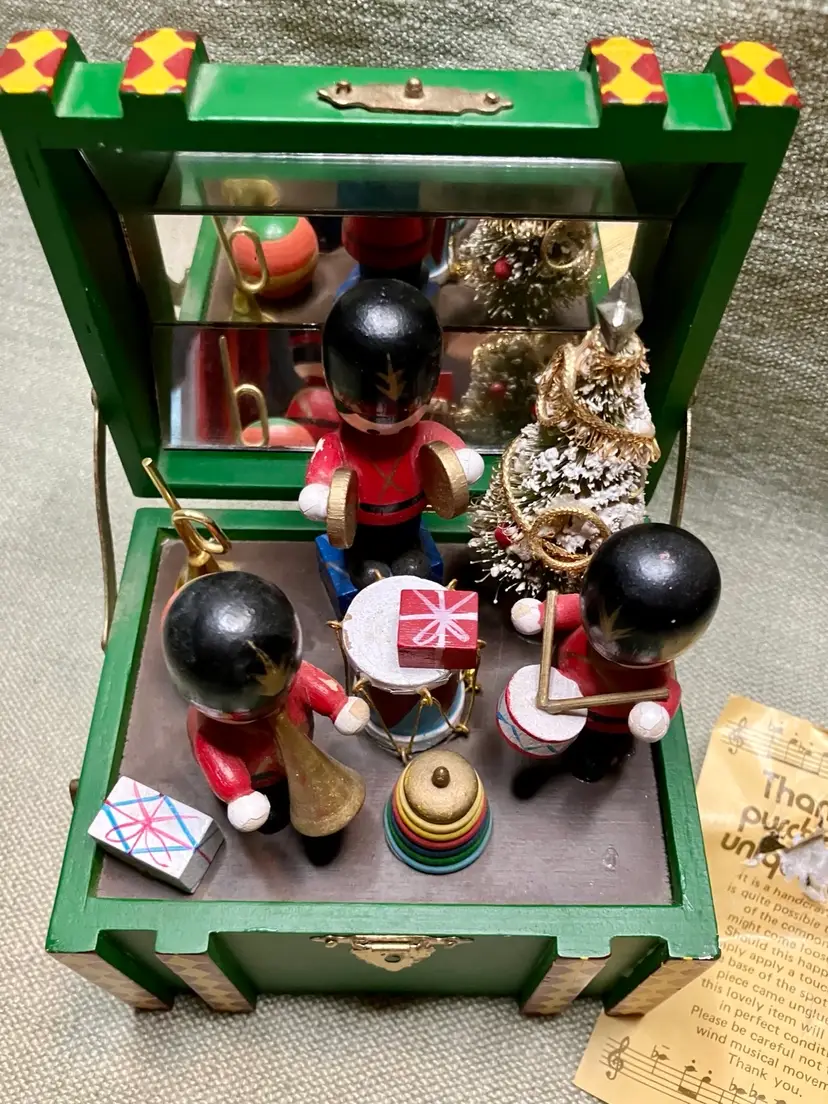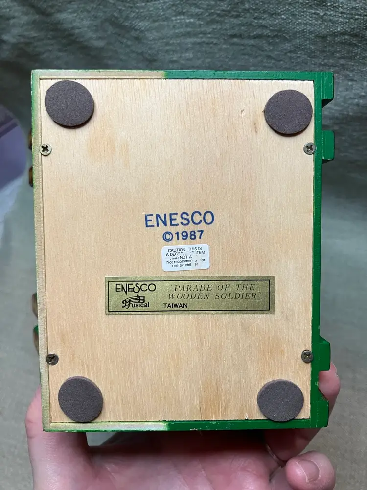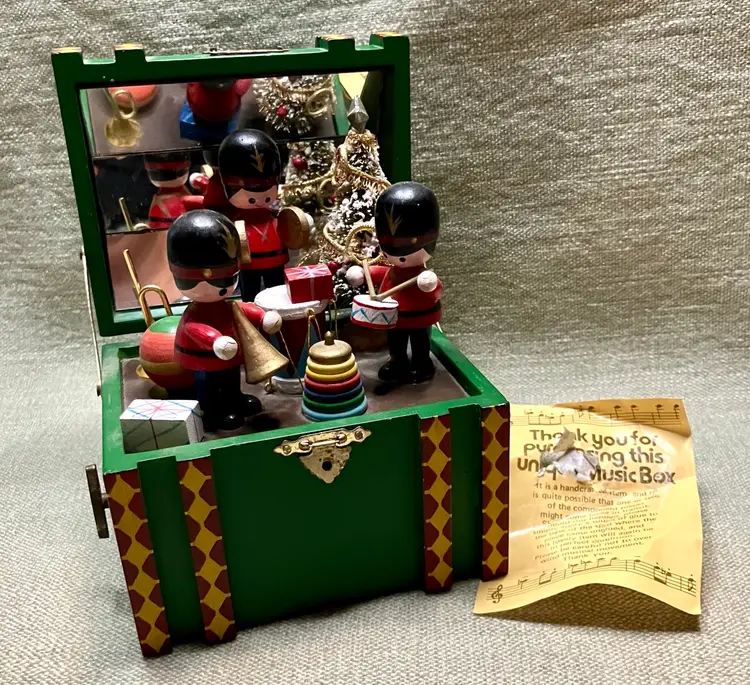 This Enesco Parade of The Wooden Soldier Toy Music Box is a beautiful addition to any collection. It features a classic design of an opened treasure toy box with mirrored background on the inside of the lid and is made in Taiwan. It is perfect for collectors of decorative music boxes and Enesco products. The box is from the 1987 collection and features an instrumental Christmas tune originally written as a solo piano piece in 1897 by the German composer Leon Jessel.
