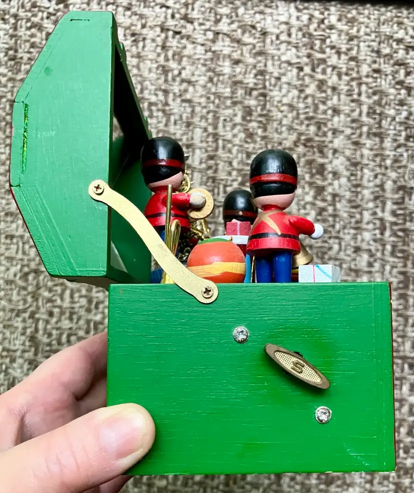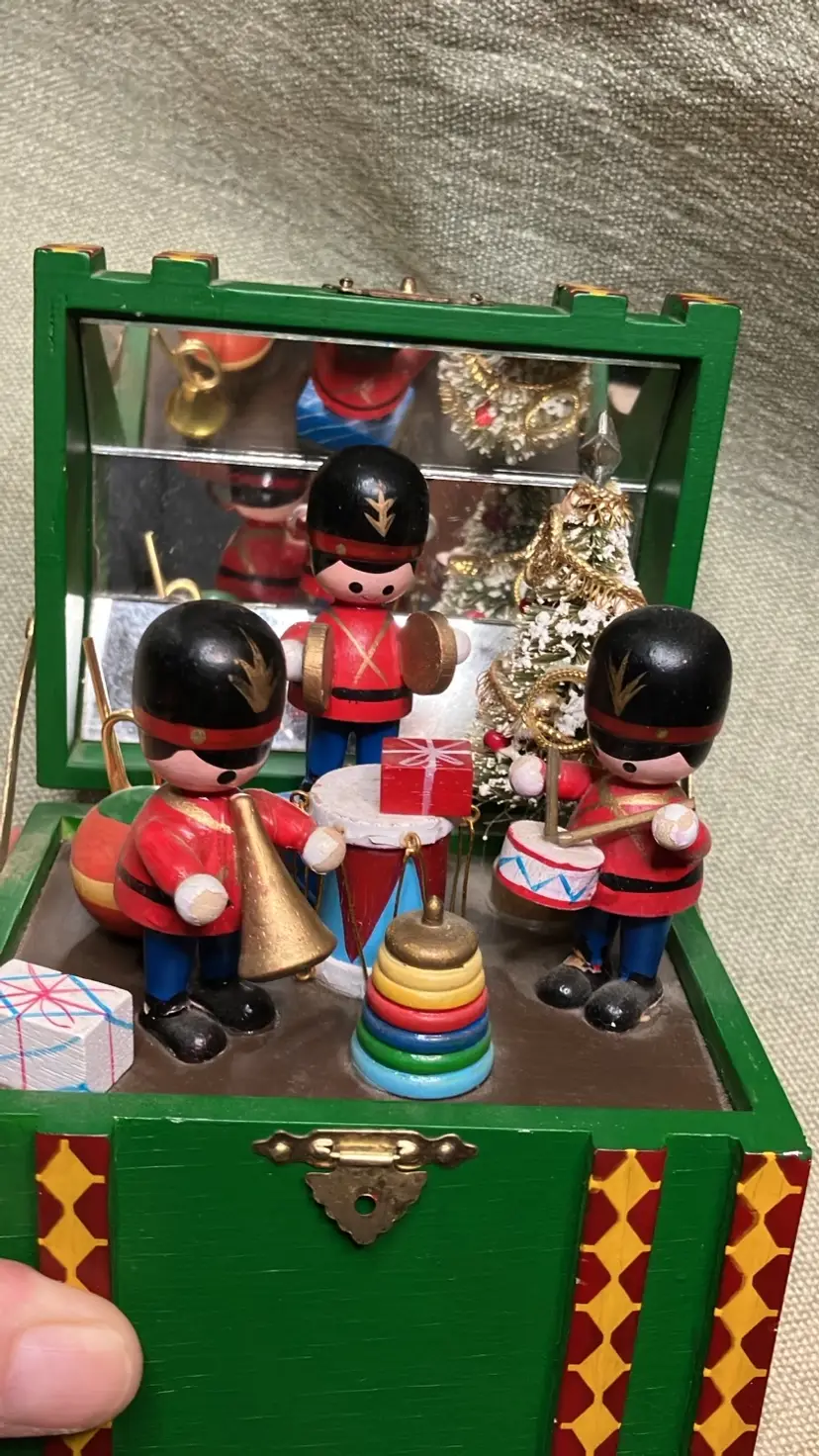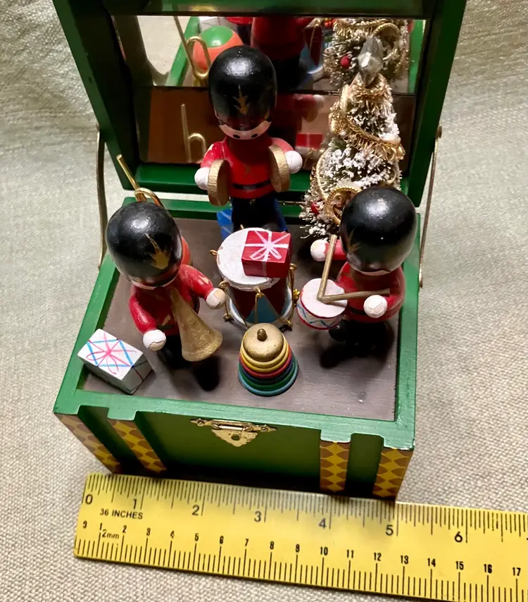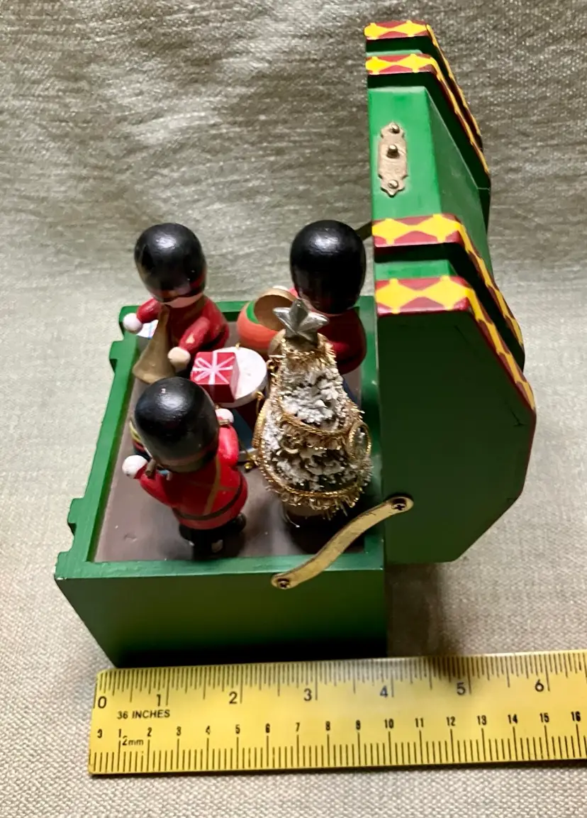 This Enesco Parade of The Wooden Soldier Toy Music Box is a beautiful addition to any collection. It features a classic design of an opened treasure toy box with mirrored background on the inside of the lid and is made in Taiwan. It is perfect for collectors of decorative music boxes and Enesco products. The box is from the 1987 collection and features an instrumental Christmas tune originally written as a solo piano piece in 1897 by the German composer Leon Jessel.