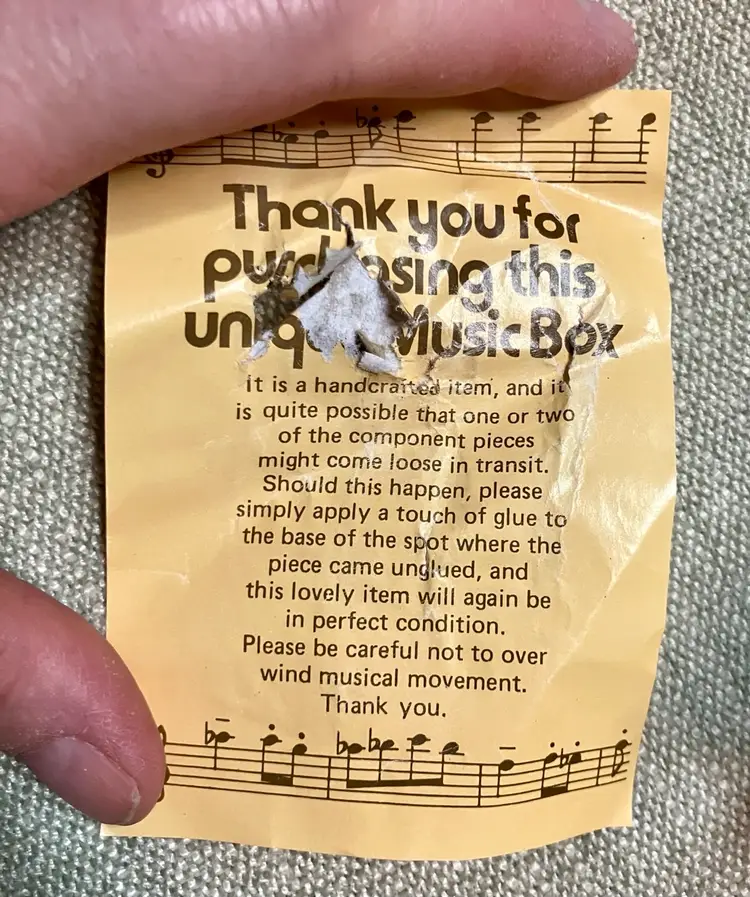Please look at all the photos prior to deciding to make a purchase. This is a gently owned item and does show some dust. It music box works beautifully. Original paperwork has condition issues but a fun addition to a collection / collector. Buyer, however, is strongly encouraged to review the photos and decide for themselves its condition.