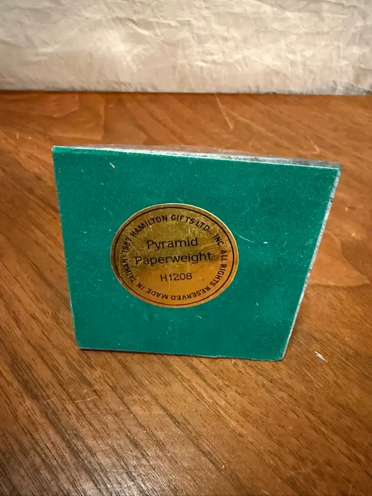Vintage 1987 Hamilton Gifts Green Marble Pyramid Paperweight, Model H1208. This elegant desktop accessory features a polished green marble finish with natural veining patterns, crafted into a classic four-sided pyramid shape.