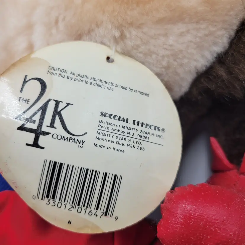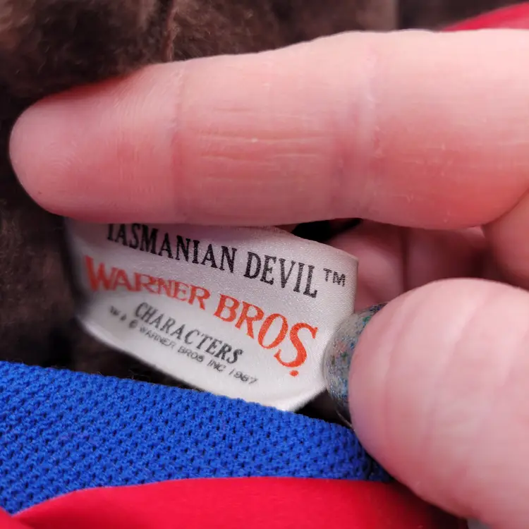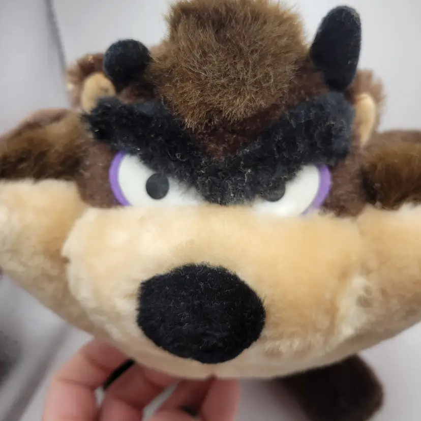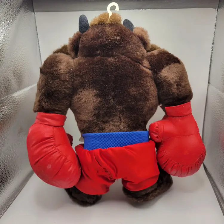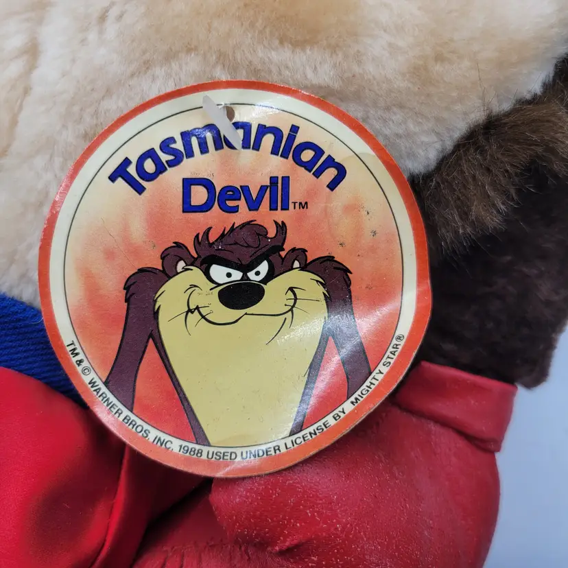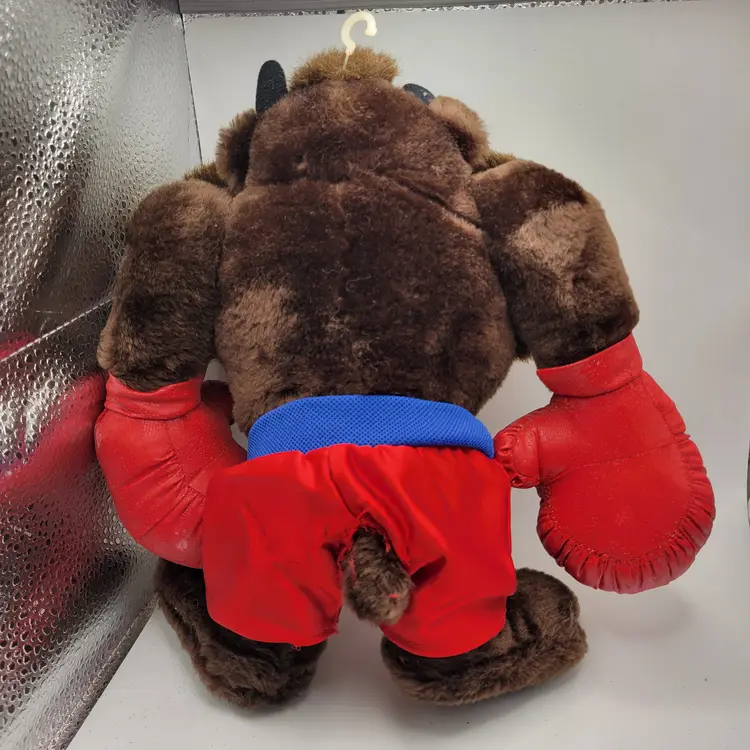 The product is a vintage 1987 Taz Warner Bros Boxer 11" plush toy with red shorts and gloves, featuring the character Taz from the Warner Bros. Animation studio. This collectible item is made of polyester fiber and originates from Korea. It is part of the Tasmanian Devil franchise and inspired by the Looney Toons TV show, making it a unique and nostalgic piece for fans of classic animated series. The plush toy comes with its original tags and showcases the iconic brown, red, and blue colors associated with the character Taz.