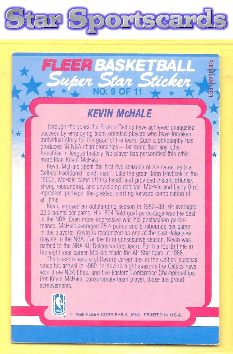 This is a nice example of a 1988-89 Fleer #9 Kevin McHale Stickers .Other important information about this card: In Kevin McHale played for the Boston Celtics.Please check out our other listings for more great cards.