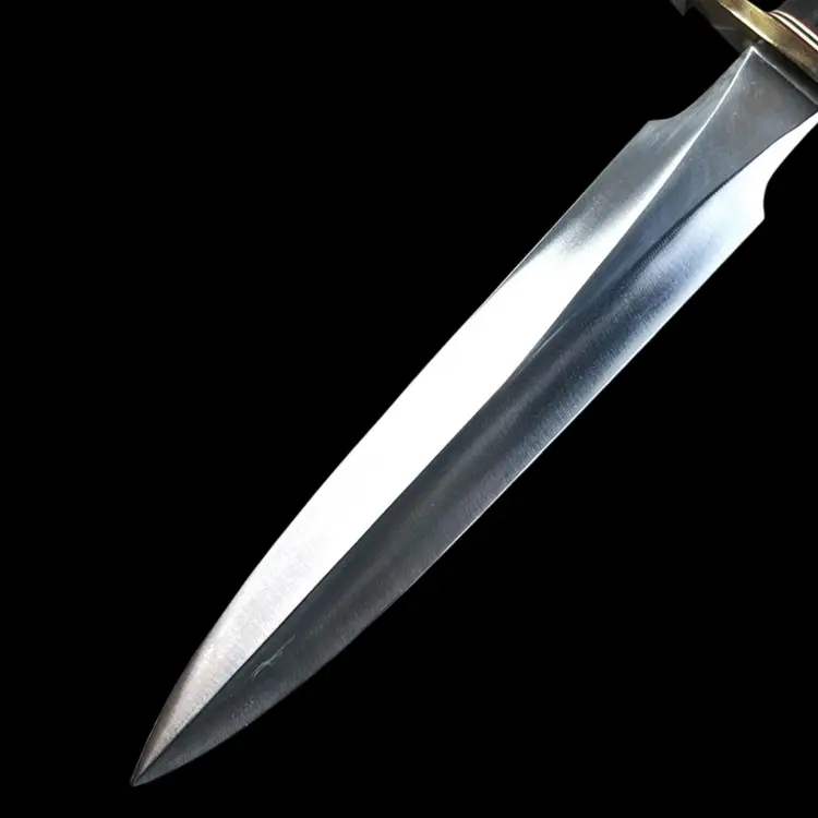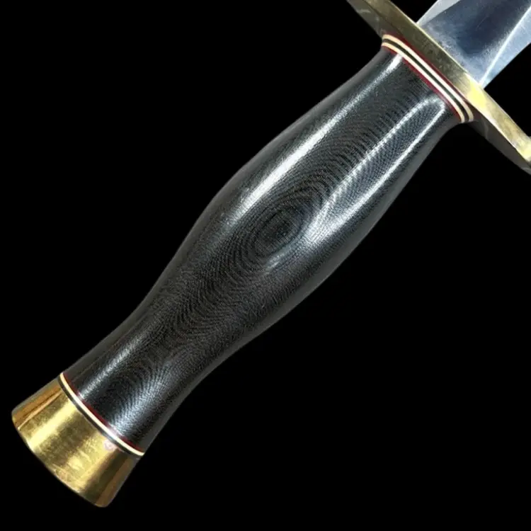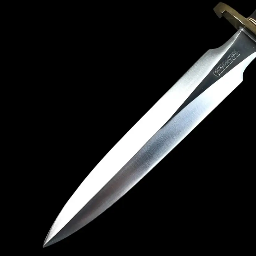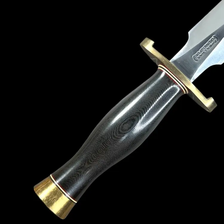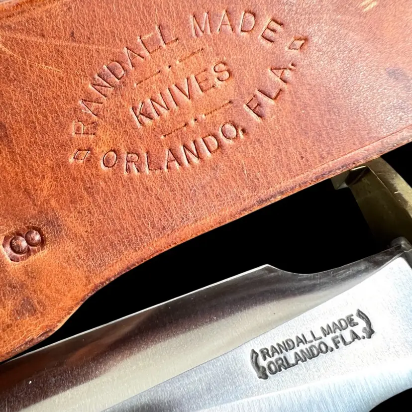 Highly Collectible Randall Knife. Knife style is Model #2. Age: 1988. Brass double lugged guard. Black micarta handle. Brass butt cap. Randall leather model 2 original sheath. Sharpening stone included in sheath. 13" overall. 8" blade. Condition: Slight patina on brass snap of sheath (See last photo). Provenance- ordered in-person from Gary Randall in 1987 Orlando, FL Total weight 1 pound 2 ounces