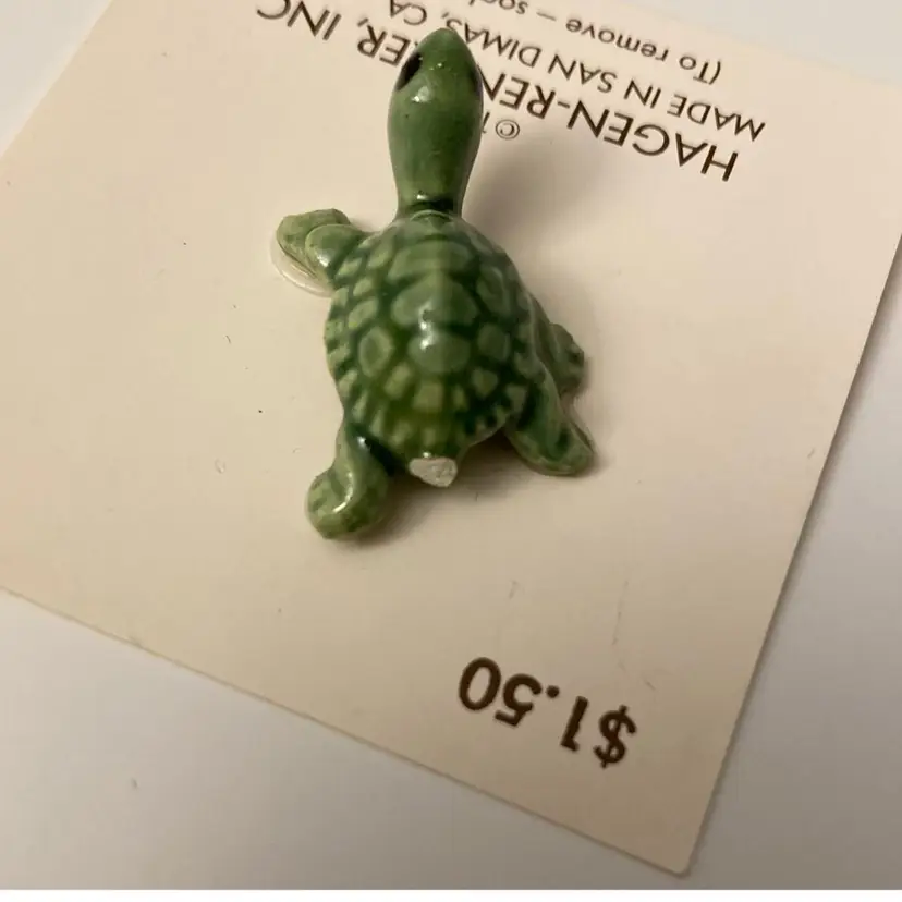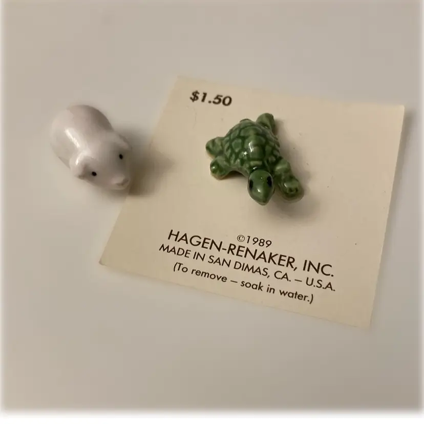1979 set of 2 Hagen Renaker miniatures. The turtle us still attached to his paper card but is missing his tail. The piglet gas a light pink cast to it. She does have some crazing lines in her clear coat finish. As Is.