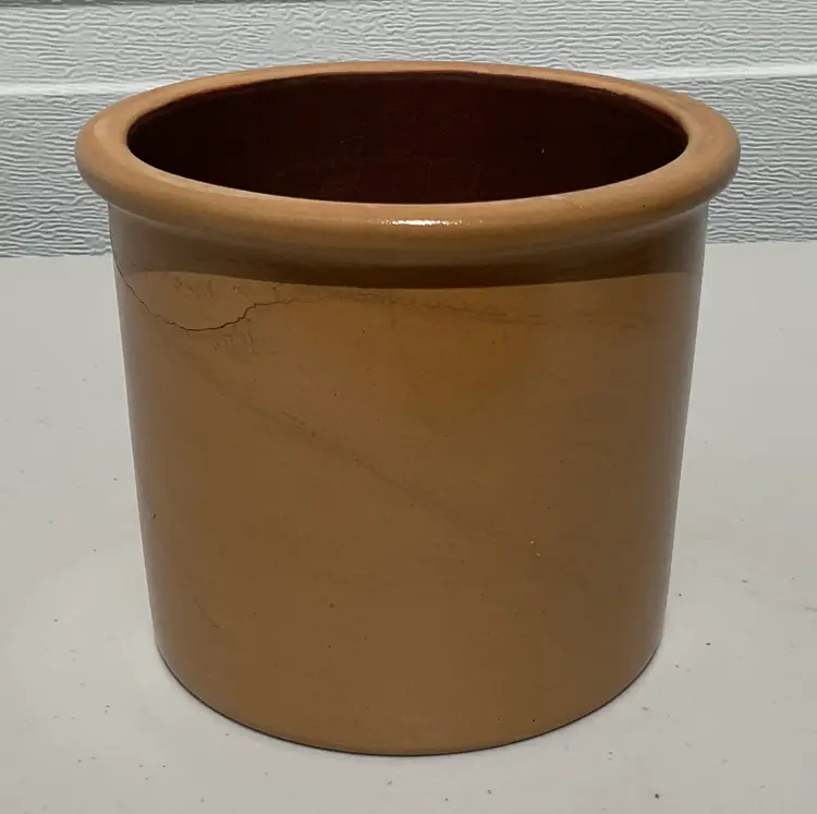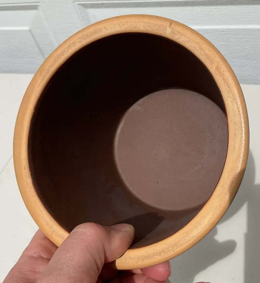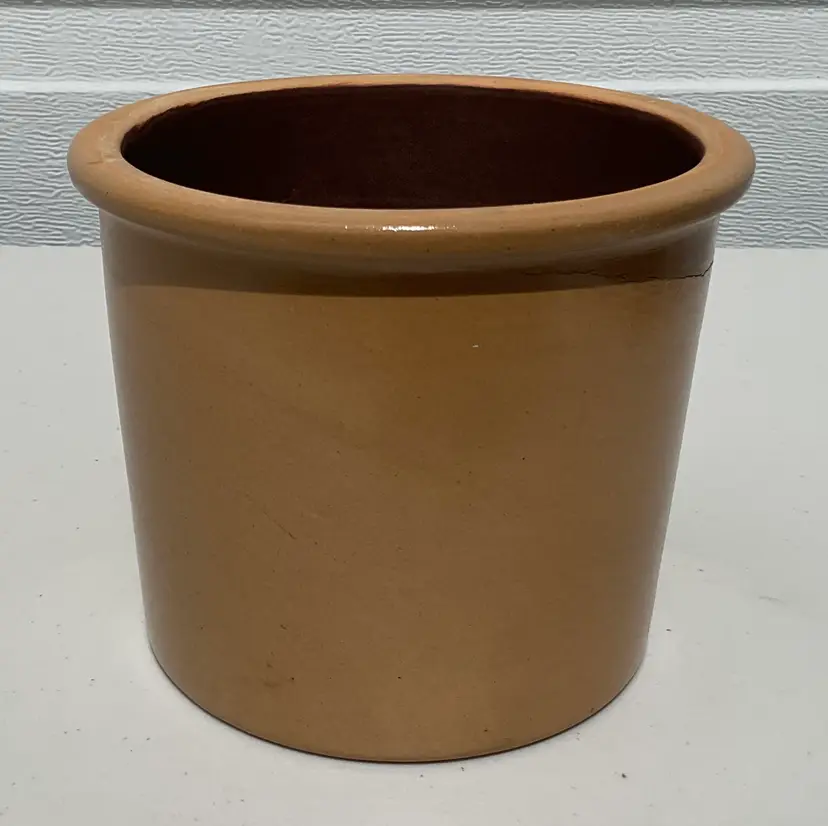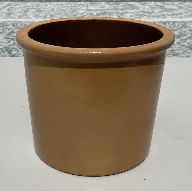 It measures approximately 5 inches height by 5 inches across bottom base by 5 inches inside top opening by 6 inches outside rim diameter.