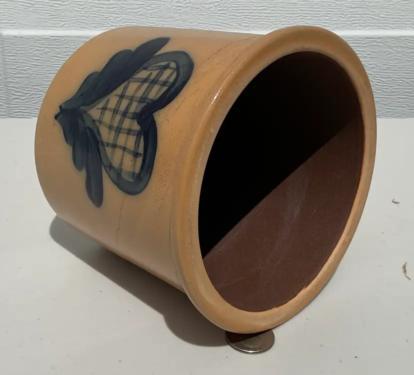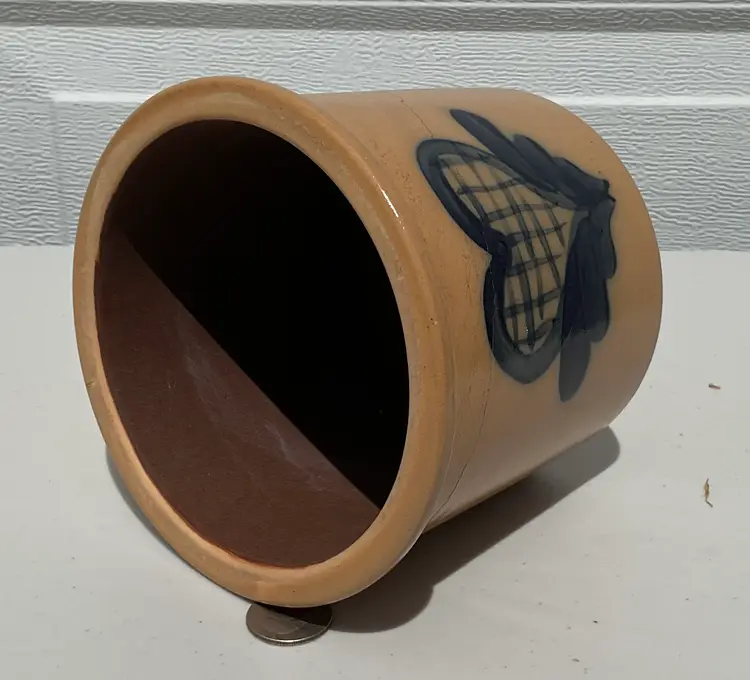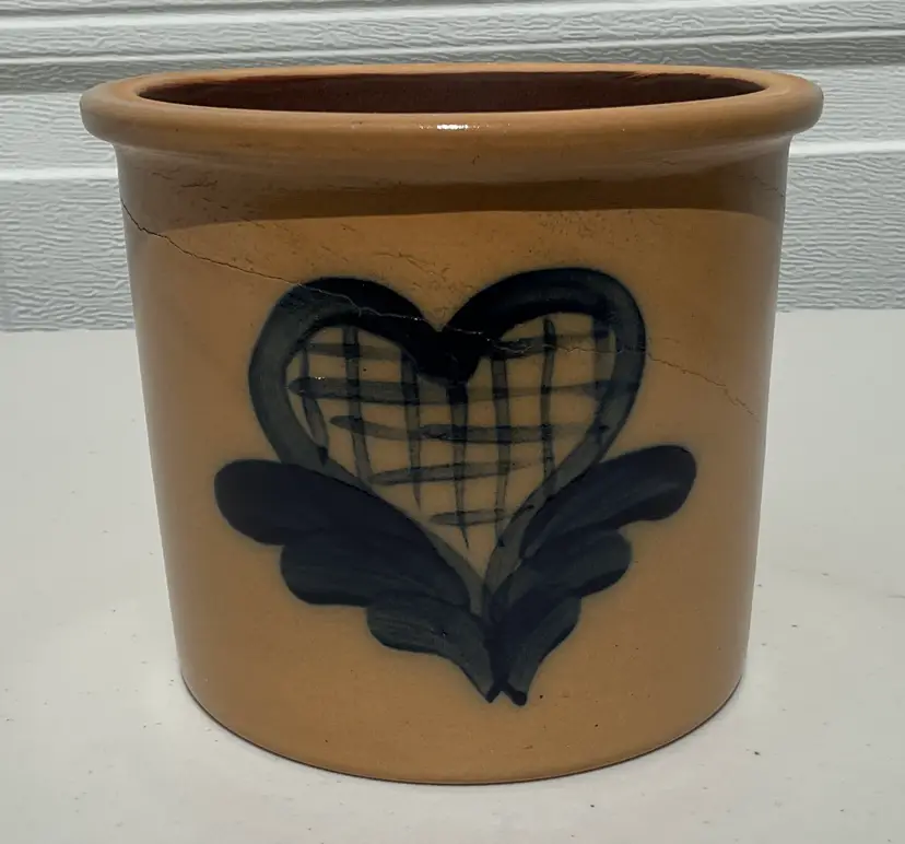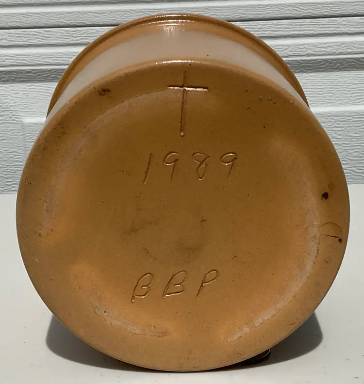 This is for a 1989 signed BBP salt glazed stoneware crock. It has a wonderful cobalt decorated heart with floral plume at bottom of heart & a cross hatch pattern in the center of the heart. This piece is signed on bottom base with the traditional cross symbol & dated with the year "1989" with the initials "BBP".