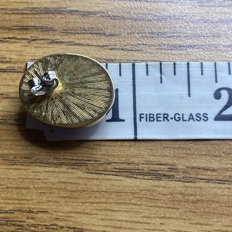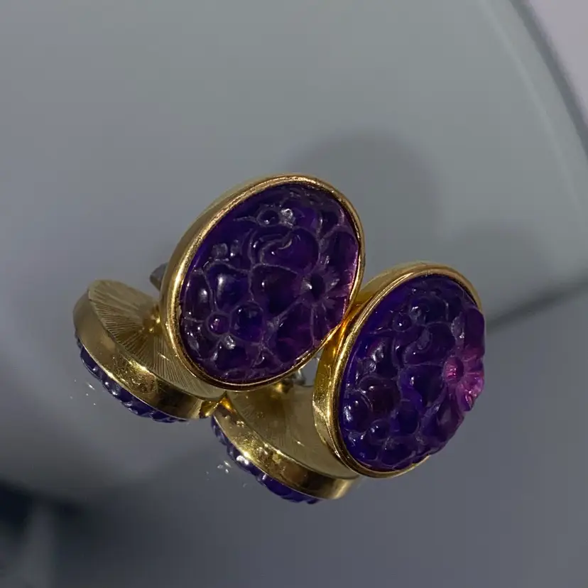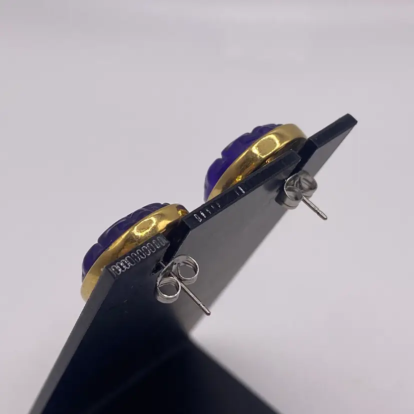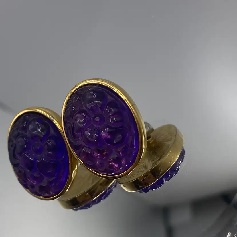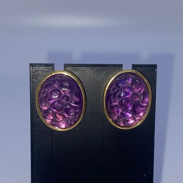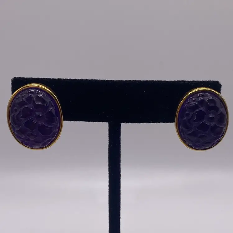 Add a touch of vintage elegance to your jewelry collection with these Avon stud earrings. The oval-shaped, gold-tone earrings feature a beautiful purple molded plastic flower design that is perfect for both casual and formal occasions. Measuring approximately .75 inches in length, these earrings are post-closure and are designed to fit comfortably on your ear lobes. The earrings are perfect for those who appreciate beauty, art, flowers, and fashion.
