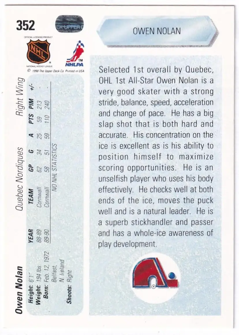 1990-91 Upper Deck #352 Owen Nolan RC Quebec Nordiques